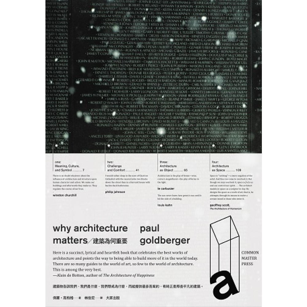 保羅‧高柏格(Paul Goldberger) 高柏格,美國建築評論大師,唯一摘下《紐約時報》、《紐約客》兩大建築評論桂冠的作家,因此被推崇為美國當代建築評論最重要的人物,動見觀瞻。 一九五○年生,現居紐約。曾擔任全美盛名的帕森設計學院院長,現為新學院設計和建築系教授。四十年來關注建築與藝術,專長城市歷史變遷,與「歸零地帶」重建總規劃師李伯斯金對談世貿遺址,與法蘭克‧蓋瑞同台在電視節目中談論建築,在建築界擁有深遠影響,並將建築評論提高至公共領域的層次。為《紐約時報》撰寫建築評論二十年,獲普立茲傑出評論獎,之後轉至《紐約客》週刊負責極富聲望的Sky Line專欄,現為《浮華世界》專欄作家,著作十餘本,並為各大名建築師、攝影師、畫家寫作導論與序言,文字融合易讀性與學院風格,優美流暢。 艾倫‧狄波頓:「關於藝術方面的指導書籍很多,但是建築方面卻寥寥無幾。《建築為何重要》便是最好的作品之一。」