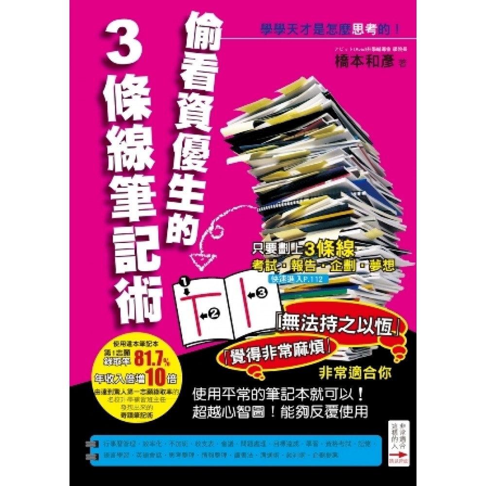 筆記3條線,靈感不斷線! 所謂的「3條線筆記」,是藉由在筆記上畫出3條線,將頁面分成5等分使用。然後,其中1等份作為標題或日期等當作索引或目次使用。所以,作為思考步驟使用的有3個等份。 而且,「3」這個數字,是最能讓我們人類發揮思考力的魔幻數字。 本書詳細介紹只要在筆記本上畫出三條線,即可解決一切麻煩事的方法,讓您「立刻可以運用在工作上」、「通過資格考試或公司內升等考試」等。其具體效果如下所述: .資格考試及升等考試等,短時間即可凸顯學習的效果 .有效使用於英文或中文等語言上的學習 .有效管理時間,提昇工作效率,實現零加班 .有效解決工作.人生.個人.戀愛等煩惱 .明確訂出必須執行的事項,促使目標達成 .可輕鬆整理出想法或資訊 .順利完成談判或演講,有效達成人際溝通 .摘錄新點子及新想法 坐而言不如起而行,現在就趕快打開平日用的筆記本,開始著手進行本書所介紹的「3條線筆記術」吧!絕對讓你受用無窮喔! 本書特色 1.「3條線筆記術」具有以下特色: .只要畫出3條線(僅需3秒!) .什麼樣的筆記本都OK .不論學習或工作,適用於所有場合(※詳細敘述於書中) 2.因為書寫簡單,又能自動地歸納內容,即使反覆閱讀仍能保持筆記的乾淨。 3.不需要準備好幾本筆記,也不花費功夫, 所以可以持續進行下去。 簡單易學,怕麻煩的你,最適合這一套「3條線筆記術!」