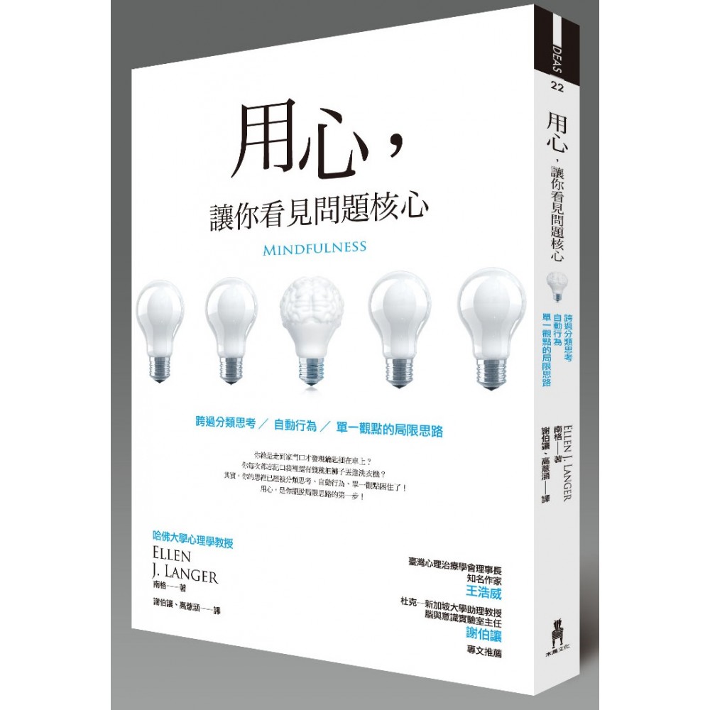 影響全美二十餘年的《用心法則》(本書前身),溫暖再版。 簡單的問題,卻總是無法解? 因為你被困在「分類思考」「自動行為」「單一觀點」裡了! 只要用心,就能看見問題核心,跳脫思想困境。 AMAZON讀者★★★★★感動推薦 這本書為我們的心智打開了驚人的心方向。──美國多元智能大師 卡德納 在多元的工作、教育、與健康生活環境中,處處瀰漫著偏見與沉溺,然而「用心」的創造力與活躍特質可以消除這些已察覺到的侷限。──「費城詢問報」 這是一個加強生命意義的另類觀點。它宛如一帖良藥,可以幫助我們對抗僵固的、機械式的、重複性的生活型態,讓我們不至於把最好的自己封存在從來沒有好好活過的生命中。南格替一個有趣但被輕忽的現象賦予了科學的重要性。這是一種能刺激思考的閱讀,值得廣大群眾重視。──「克科斯書評」 你絕對無法在看完這本書之後,還能以相同的觀點看待這個世界!──哈佛大學知名法學教授 德蕭維茲 你常常忘了錢放在口袋,直接把褲子丟進洗衣機嗎?走到家門口,才發現鑰匙還插在車上?主管才剛交代的事轉身就忘?以為廚房裡杯子裝的透明液體是水,想都沒想就一飲而盡?注意!再這樣不用心下去,你可能會釀下更恐怖,甚至出人命的大禍。 如果生活不用心,你很容易就被「每人限購兩份」的廣告騙進去;如果出去玩不用心,你很容易看也沒看就一頭栽進沒有水的游泳池;如果工作不用心,你很容易因為僵化的過程在支票上簽錯日期,或讓金額多一個零。 用心,對於微小的變化你會更敏銳;不用心,你只會沒效率地一再上當。 作者南格教授是當代心理學界最重要的權威之一,她以超過五十個實驗為基礎,列舉如「在服飾店對假人模特兒說借過」、「每次文件日期總是簽錯」、「習慣飛行溫暖南方的機長忘了檢查防凍裝置」……等各種真實故事,訴說我們的生活實境,點出那些讓人困擾、卻又不易發現的問題。無論事業、感情、生活等各種層面,其實都存在著許多脈絡,不同脈絡又造成不同的思想與感情。與其鑽牛角尖困處當下,你應該跳脫開來,將自己抽離到更大的架構,才能看見問題所在,鬆開固執的情緒,找到最適合也最舒服的解決方式。 閱讀本書時,你會發現混亂的生活被抽絲剝繭,梳理成一條條清晰的思線。只要用心,就能看見問題的核心,好好應對各種狀況,讓心安定下來。