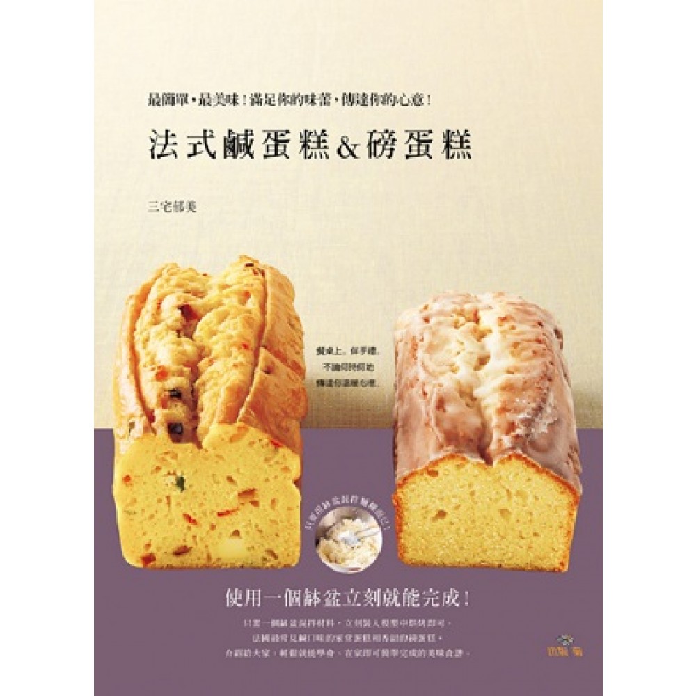 前言---------3 Part 1 試試烘烤基本的蛋糕吧 基本蛋糕的製作方法---------8 基本的法式鹹蛋糕 火腿和蔬菜鹹蛋糕---------10 基本的磅蛋糕 檸檬磅蛋糕---------14 模型的搭配---------18 試試用牛奶盒來烘烤吧---------20 漂亮地取出蛋糕的訣竅---------21 可以更美味品嚐蛋糕的作法---------22 Park 2 簡單! 法式鹹蛋糕 蔬菜 櫛瓜和西班牙辣腸的鹹蛋糕---------24 芝麻葉和牡蠣的鹹蛋糕---------26 醍魚蕃茄青醬鹹蛋糕---------27 青蔬鑲肉鹹蛋糕---------29 水煮蛋花椰菜的鹹蛋糕---------30 百菇鹹蛋糕---------33 蟹肉棒酪梨鹹蛋糕---------34 韭菜櫻花蝦鹹蛋糕---------35 肉類 絞肉青豆鹹蛋糕---------36 紅紫蘇炸雞柳鹹蛋糕---------38 生火腿捲無花果鹹蛋糕---------40 鹹牛肉高麗菜蛋糕---------41 味噌牛肉鹹蛋糕---------42 叉燒榨菜鹹蛋糕---------43 海鮮類 醃鮪魚鴨兒芹鹹蛋糕---------44 干貝菠菜鹹蛋糕---------46 煙燻鮭魚鹹蛋糕---------48 起司美奶滋鮮蝦鹹蛋糕---------49 小松菜銀魚鹹蛋糕---------50 辣明太子秋葵鹹蛋糕---------51 辛香料、加工品 罐頭午餐肉加豆類的鹹蛋糕---------52 胡椒義式臘腸鹹蛋糕---------54 雙色橄欖起司鹹蛋糕---------55 魷魚鹹蛋糕----------56 鹹昆布青蔬蛋糕---------58 醃菜風鹹蛋糕---------59 法式鹹蛋糕的午茶心情 三明治、法式起司蛋吐司croque-monsieur、西班牙點心串Pinchos、沙拉、湯品---------60 Part 3 輕輕鬆鬆完成!磅蛋糕 水果、蔬菜 蘋果磅蛋糕----------66 水蜜桃紅茶蛋糕---------68 奶油起司櫻桃蛋糕---------69 香橙果醬磅蛋糕---------70 水果蛋糕---------72 大學芋與南瓜的磅蛋糕---------74 糖煮奶油紅蘿蔔蛋糕---------75 可可亞、堅果 大理石蛋糕---------76 巧克力覆盆子蛋糕---------78 咖啡棉花糖的迷你磅蛋糕---------79 鳳梨杏仁果蛋糕---------80 罌粟籽葡萄乾蛋糕---------81 綜合堅果蛋糕---------82 和風 白巧克力抹茶磅蛋糕---------84 黑芝麻蛋糕---------86 日本酒風味的紅豆栗子磅蛋糕---------87 黑砂糖香蕉蛋糕--------88 烘焙茶風味的櫻花甜納豆蛋糕---------89 磅蛋糕的午茶風情 英式點心塔Trifle、香檳阿法奇朵Affogato、提拉米蘇、點心盤---------90 用具清單---------94