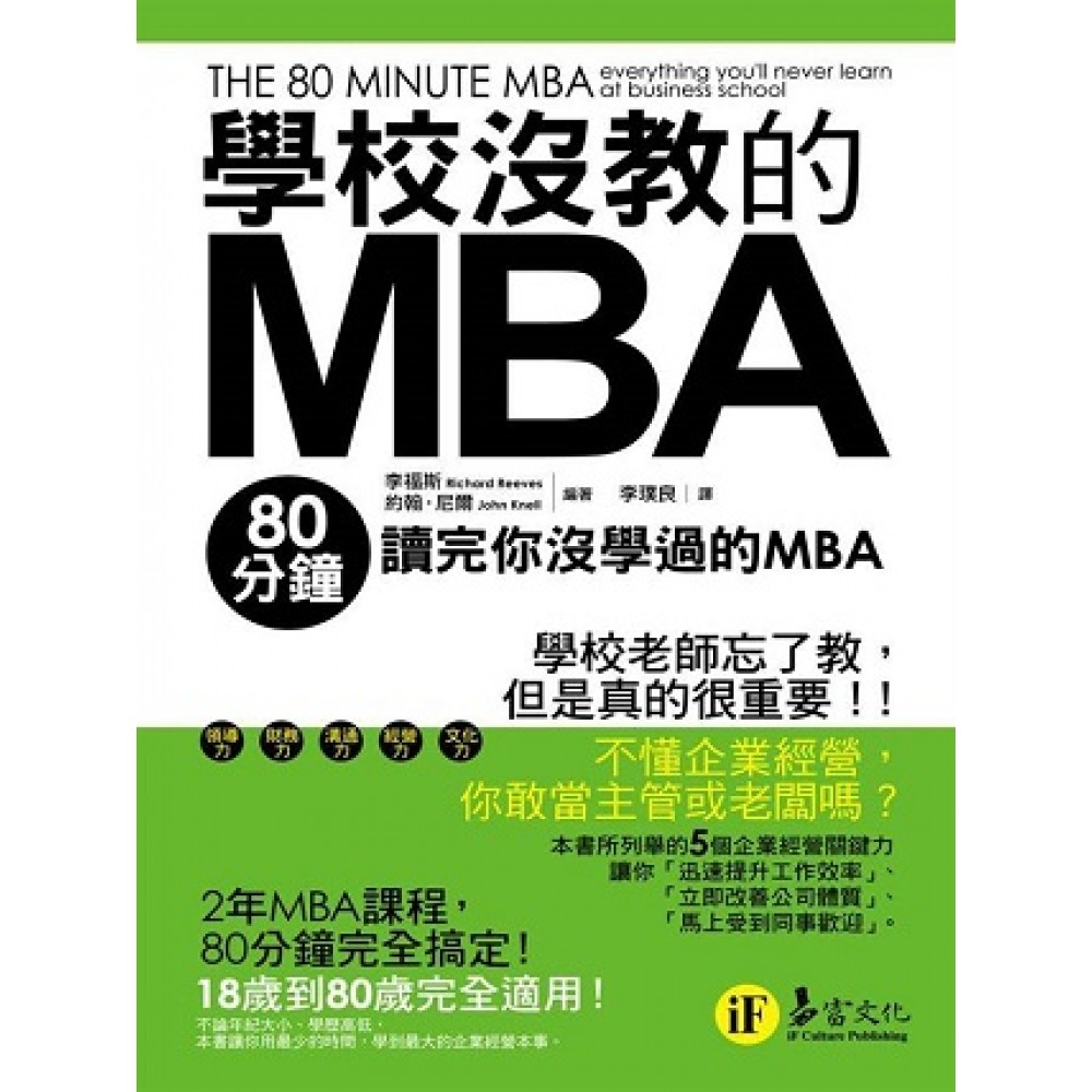 當大家都一窩蜂去念MBA或EMBA課程時, 你真的有學到企業經營管理的精髓嗎? 《學校沒教的MBA--80分鐘讀完你沒學過的MBA》中所列舉的5個企業經營理關鍵力,真的很重要,但學校老師卻忘了教。 本書幫助你2年MBA課程,80分鐘完全搞定! ●亞馬遜網路書店5顆星評價! ●18歲到80歲完全適用! 不論年紀大小、學歷高低,本書讓你用最少的時間,學到最大的企業經營本事。 ●不懂企業經營,你敢當主管或老闆嗎? 《學校沒教的MBA--80分鐘讀完你沒學過的MBA》中所列舉的5個企業經營關鍵力,讓你「迅速提升工作效率」、「立即改善公司體質」、「馬上受到同事歡迎」。 ●學一次,用一輩子!馬上掌握MBA關鍵價值! 利用80分鐘,有效得到2年學習效果。《學校沒教的MBA-80分鐘讀完你沒學過的MBA》讓你80分鐘馬上學會學校有教或沒教的5大企業管理思維,打造扎實MBA,提升職場競爭力! ●一定要會的企業經營5大關鍵力! 1、經營力: 企業開始講究環境與金融的永續性,工商企業的領導人需要新的管理精神,把大部分聚焦在永續生存上,身為領導人或主管如何邁向成功,環境與金融體系的永續經營,都是不容小覷的關鍵。 2、領導力: 企業經營的核心要素在於,該以何種方式領導企業創造經營高峰,並且明確指出成功的企業領導者的絕對優勢,具備何種技巧能夠安定廣大的企業內部員工,並且能夠針對外在的威脅,以牢不可破的凝聚力迎向事業體的成功。 3、文化力: 人員是最有價值的生產因素,同時又是最難以有效吸引的一項資產。針對「人力資源」的管理,主要應該藉由企業體本身的文化著手,創造出人員的價值,與企業文化的呈現,巧妙的牽動組織的營運。 4、財務力: 針對企業經營關鍵-財務報表的理解,對於現金的運用與規劃。現金的範圍涵蓋了財務金融、資產負債表、會計、供應鏈的管理和經濟學,藉由這些專業的經營工具,使得企業在管理上能夠擁有最好的財務保護。 5、溝通力: 聚焦該如何和市場及顧客們對談?在策略、倫理道德、時間管理、經濟學、統計學以及神經市場行銷(neuromarketing)等方面,提出些小型的模組。 ●想要進修卻苦無時間?就算取得學位也不保證擁有職場競爭力? 《學校沒教的MBA- 80分鐘讀完你沒學過的MBA》擺脫傳統商學院課程的紙上談兵,將經營管理概念與關鍵性議題做重點式篩選整理,讓你能夠即時引用強而有力的手法,發展具創造性的周延思考。 ●除了經營管理學,本書還告訴你MBA課程沒教的事! 培養全新的企業精神,是引領潮流的MBA課程所缺乏的重點。將簡化繁複的企業管理思維,以濃縮的形式呈現,晉升MBA只需要80分鐘,就能掌握新的企業價值,強化商場競爭力。
