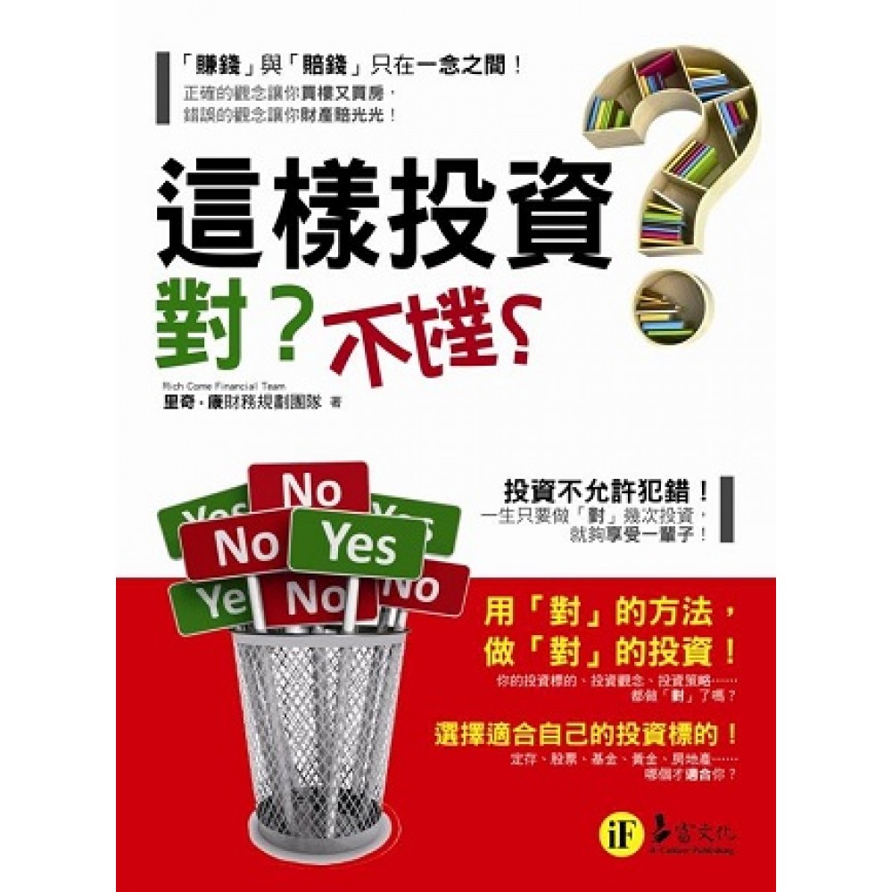 里奇.康財務規劃團隊由於與媒體、銀行、財經業界多有往來,且結識多位財經大老及專家,因此對國內外投資市場有相當研究。 而由資深媒體記者、金融界人士、證券營業員、財務分析師等各階層人士組成的里奇.康團隊,成員過往也大多有相似的背景: 30歲前,不顧旁人反對,亂跳入股票市場,導致沒妻沒子、沒車沒房、衣食常缺,自我感覺貧窮──因為常沒錢用。 30歲後,才陸續出沒在各大財經媒體、網絡,企圖導正過往錯誤投資觀念,重新出發,終於35歲生日前,達成有妻有子、有車有房,衣食無缺的人生目標。 此次,里奇.康財務規劃團隊將其經手過的投資客戶,在交換投資想法、導正投資觀念之過程案例集結出版《這樣投資,對?不對?》,便是希望能幫助對投資有誤解的讀者,再次重新檢視自己的投資標的、投資觀念及投資策略,進而改正以往的錯誤,成為一個和他們團隊名字一樣,真正RichCome的幸福投資人。
