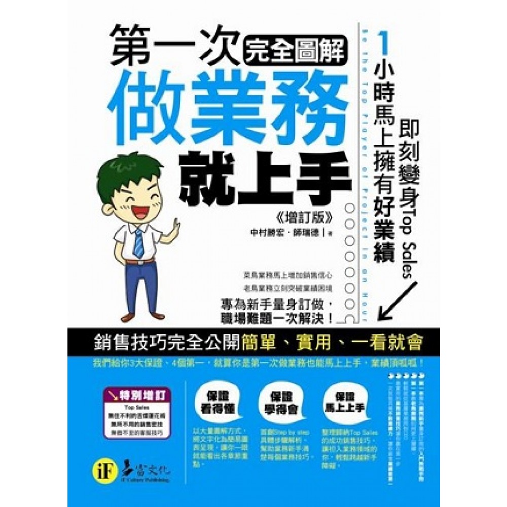 你以為內勤行政工作就不必懂業務技巧? 你認為只有創業才能掌控全局、出人頭地? 那你肯定不知道, 超過50%的老闆是從「業務」做起; 能迅速累積財富的是做「業務」; 最能享受工作成就感的更是「業務」。 想擁有不一樣的人生嗎? 那現在就下定決心做業務吧! 《第一次做業務就上手(完全圖解增訂版)》 讓你1小時馬上擁有好業績, 即刻變身Top Sales! ◎想做業務的你,之前如果沒有看過,這次絕對不要錯過! 2009年,《第一次做業務就上手(完全圖解)》出版後,即引起廣大讀者討論及搶購熱潮。許多原本對業務銷售工作有疑慮而卻步的社會新鮮人,在看過本書且勇於嘗試做業務後,紛紛來信表示本書不僅一掃其之前對業務工作的謬誤,更幫助他們很快進入業務角色,並朝向賺得人生第一桶金邁進。 為切合現今社會需求,並讓之前向隅的讀者,有機會再次一窺業務工作的迷人之處。易富文化商請作者針對現今社會狀況及讀者意見後,特別增訂「讓Top Sales無往不利的舌燦蓮花術」、「Top Sales無處不用的銷售密技」、「連Top Sales都在做的無微不至客服技巧」,在2012年隆重推出《第一次做業務就上手(完全圖解增訂版)》。 不管是不是社會新鮮人,只要你想一窺業務工作的奧祕,這次絕對要仔細品味;還在遲疑,你將會錯過一本足以改變一生的好書! ◎全球公認最具挑戰性,也最有成就感的工作──業務 不景氣工作真難找,但有一類工作卻永遠缺人,那就是「業務」。別以為這是個沒有發展前途的工作,綜觀知名企業CEO大多數都是從業務做起。 不可諱言,做業務真的很辛苦,師父帶徒弟一起掃街拜訪、不停CALL客,卻常換來冷言冷語。但是有為的台灣青年啊!請千萬要忍住、別放棄,因為業務真的是個神聖的工作,也是通往財富的工作,只要抓到業務銷售技巧,上從房子、汽車、保險、廣告,下至靈骨塔、直銷產品……等都能得心應手。 銷售只是個技巧,只要搞懂,終身在各行各業均受用。現在就讓《第一次做業務就上手(完全圖解增訂版)》敲開你的業務腦袋,一起朝頂尖業務邁進。 ◎菜鳥業務馬上增加銷售信心,老鳥業務馬上突破業績困境! 翻開《第一次做業務就上手(完全圖解增訂版)》,只要1小時就能讓你擁有好業績。業務銷售技巧完全公開,簡單、實用,一看就會! ◎《第一次做業務就上手(完全圖解增訂版)》給你3大保證,就算你是第一次做業務也能馬上上手,業績嚇嚇叫! 1.保證看得懂 以大量圖解方式,將文字化為簡易圖表呈現,讓你一眼就能看出各章節重點。 2.保證學得會 首創Step by step具體步驟解析,幫助業務新手清楚每個業務技巧。 3.保證馬上就上手 整理歸納Top Sales的成功銷售技巧,讓初入業務領域的你,輕鬆跨越新手障礙。 ◎《第一次做業務就上手(完全圖解增訂版)》擁有領先全國同類書籍的4項第一: 1.第一本專為業務新手量身訂做的入門教戰手冊 專為不清楚自己是否適合當業務,或因工作上挑戰與問題,而輕易打退堂鼓的新手業務量身打造,幫助新手業務克服新手上路可能遭遇的各種阻礙。 2.第一本教老鳥業務更上層樓,輕鬆從業務到CEO 即使你是老鳥業務,也要重新審視自己做業務的初衷。綜觀知名企業CEO,多為Top Sales出身,本書解析業務員坐上總經理大位的成功關鍵因素。要當CEO,你不能沒有業務力。 3.實用的業務銷售技巧讓你贏在第一步 打破似是而非的業務迷思與成見,整理歸納Top Sales的成功經驗法則,分享Top Sales的實戰經驗以及圖解化流程解說,讓你掌握躋身百萬業務王的關鍵技巧。 4.一次就能具備不敗業績力,讓你銷售業績衝第一 剖析高度競爭的職場環境中,業務勝出必須具備的核心競爭能力,照表操課便能培養不敗業務力,展現你的獨特魅力。 ◎馬上看,馬上就上手的業務銷售絕招大公開! 根據人力銀行調查指出,台灣企業對於人力的需求,業務人才始終排在前三名。而且不可否認,經濟再怎麼不景氣,好業務總是最不會被裁員的那一批員工,而且業務工作一般也被視為較自由又具挑戰性的職務,所以許多知名企業CEO,多為Top Sales出身。 但面對這種高需求又必須具備很多知識的職務,全世界卻沒有一間學校開班教學生如何當業務。全國第一本教你如何踏入業務領域的圖解專書──《第一次做業務就上手(完全圖解增訂版)》將打破你的既有印象,簡單詳細圖解剖析業務這個職業。我們不僅要教你怎麼做業務,還要教你做個業績嚇嚇叫的好業務。別處找不到的業務銷售絕招,全部都在《第一次做業務就上手(完全圖解增訂版)》,讓你馬上看、馬上懂、馬上就上手,成為名符其實的Top Sales! ◎專為新手量身訂做,職場難題一次解決! 《第一次做業務就上手(完全圖解增訂版)》以新手業務會面臨的問題與困惑為出發點,讓你明白自己是否適合當業務,並幫助你在踏入業務領域後,克服新手上路可能遭遇的阻礙。 不僅能解決你在從事業務工作本身可能遭遇的困難,此外,還同時對業務老鳥在職場上必須面對的課題,如何從挫敗中復原、如何得體地應對進退、自我管理等,提供明確指引,一次解決你在職場上的所有難題。