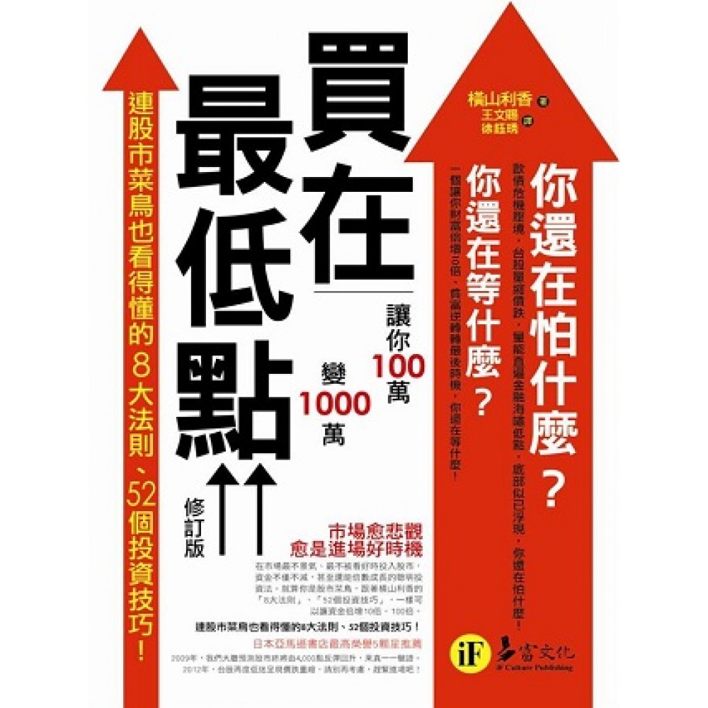 你還在考慮什麼? 市場愈悲觀愈是進場好時機 2009年,《買在最低點》大膽預測股市終將由4000點反彈回升,果真一一驗證;當時勇於進場的人,如今紛紛坐擁豪宅、開雙B名車。 2012年,《買在最低點》修訂版再次推出,台股再度低迷,價跌量縮, 別再猶豫了,找個好時間點,趕緊進場吧! 請別再錯過這個讓財富倍增10倍、貧富逆轉的最後機會! ◎市場愈悲觀愈是進場好時機!你在怕什麼!你在等什麼! 歐債危機壓境,台股量縮價跌,量能直逼金融海嘯低點,底部已經浮現,你還在怕什麼! 一個讓你財富倍增10倍、貧富逆轉轉最後時機,你還在等什麼! 2009年,股市一片低迷中,《買在最低點》逆勢推出,我們喊出「從9500點跌到4000點,就算再跌500點,你在怕什麼!」的口號,讓眾人為之側目,豈知這正是財富翻轉的槍鳴時刻,當時敢進場買股的人,如今都已早早退休,在家翹腳數鈔票了! 2012年,當歐債危機壓境,台股又量縮價跌,量能直逼金融海嘯低點之際,在取得作者和出版社同意之後,易富文化將《買在最低點》再次修訂出版。畢竟這是個財富重新洗牌,貧富逆傳的大好機會,如果你09年曾經錯過一次,那麼請把握這最後機會,別再猶豫了,趕緊照著《買在最低點》(修訂版)的方法,進場投資吧! ◎連股市菜鳥也看得懂的8大法則、52個投資技巧!教你穩健投資,輕鬆倍增財富! 在市場最不景氣、最不被看好時投入股市,資金不僅不減,甚至還能倍數成長的聰明投資法。就算你是股市菜鳥,跟著《買在最低點》(修訂版)書中,橫山利香的「8大法則」、「52個投資技巧」,一樣可以讓財富倍增10倍、100倍。 ◎他們那時進場了,所以如今都不用再辛苦工作。 如果你之前錯過了,現在,你還在猶豫什麼? ◎現在,正是進場好時機!一個讓財富倍增10倍的大好時機就在面前! 在全球股市大崩盤、全世界經濟重挫、股市一跌再跌,大家不敢輕易投入資金時,為何一個股市新手,卻選擇在此時投入股市,甚至一再獲利,財富倍數成長……? 《買在最低點》(修訂版)作者將其「親身經歷」與讀者分享,無論「進場時機、買股基本面,買股技巧、如何選股……」,本書都將鉅細靡遺地告訴每位讀者,無須擔心市場景氣,只要用對方法,勇敢進場,必能找到獲利機會,使財富倍增。 ◎全書詳盡圖表解析,圖文對照,投資技巧一目瞭然! 在《買在最低點》(修訂版)中,提供諸多圖表可供讀者對照解析,只要懂得善加運用,定能立刻抓出投資技巧中的必知重點。 『K線圖』──判斷股價動態 『移動平均線』──判斷股價趨勢 『MACD』──分析買賣時機 『一目均衡表』──掌握股價趨勢 『BBands軌道』──觀察股價是否過熱 『RSI』──觀察買賣是否過熱…… ◎日本亞馬遜網路書店最高榮譽5顆星推薦 《買在最低點》在日本推出時,由於作者親身經歷貼近人心,教導方式非常實用,因而造成日本諸多家庭主婦、白領、粉領族爭相學習橫山利香的股票投資法,並因此榮獲日本亞馬遜書店最高榮譽5顆星推薦。