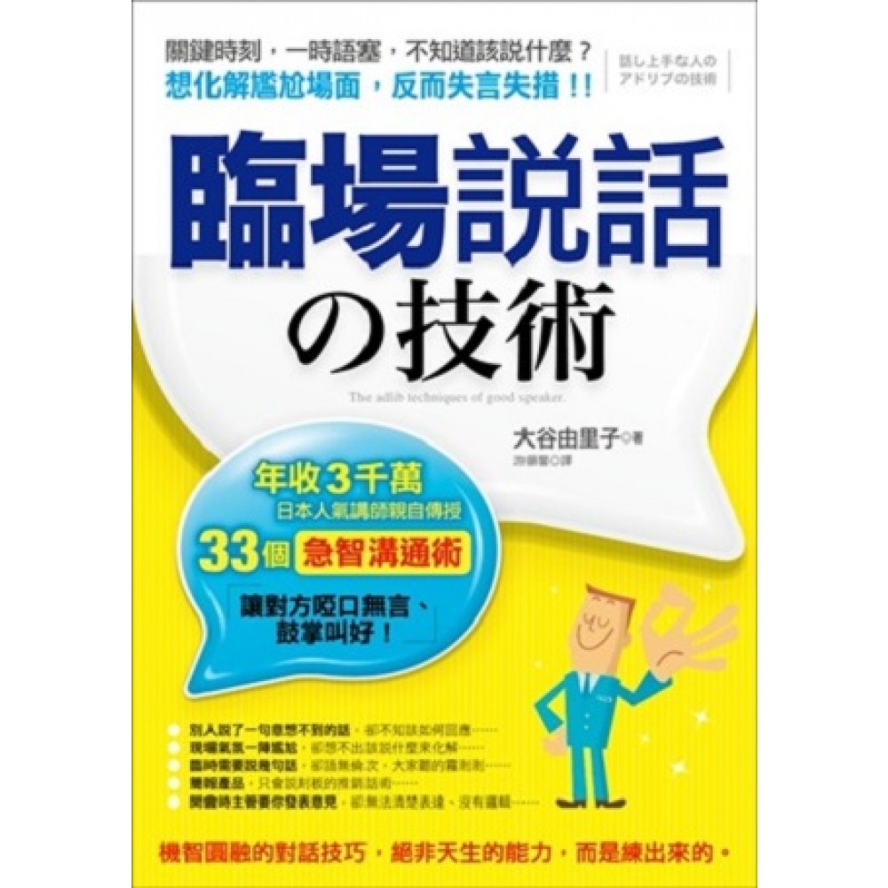 作者序 不知道該接什麼話…好糗!?學會33個說話技巧,化解尷尬場面 「那個…我不知道耶…」 「喔…應該吧……」 「呃……恩……」 你是否曾經在與別人對話時,出現過一時語塞,不知道該說什麼,或是臨時想不出可以化解尷尬的話,而感到緊張失措?不擅長說話的你是否也發生這些狀況? 1. 臨時需要說幾句話時,卻語無倫次,大家聽的霧剎剎… 2. 開會時主管要你發表意見,卻無法清楚表達、沒有邏輯… 3. 別人說了一句意想不到的話,卻不知該如何回應… 4. 現場氣氛一陣尷尬,卻想不出該說什麼來化解… 5. 身為一位業務員,卻只會說刻板的推銷話術… 遇到這些情形時,你是否也曾希望自己能有靈敏的反應,運用「急智溝通術」度過危機?可惜的是,很多人都認為善於說話的人,原本就是能言善道的說話高手,因此很快的認為自己就是不會說話的料,便放棄進一步練習。事實並非如此。我可以很篤定地告訴你,機智圓融的說話技巧,並不是與生俱來的才華,而是每個人都可以學會的實用技巧。 我曾經是吉本興業(註)的經紀人,每天都在搞笑藝人身邊近距離觀察他們的工作狀況,我很清楚他們私底下的努力。我現在除了每年負責策劃超過300場的演講、研修課程與研討會之外,個人也擔任講師,在眾人面前發表演說。 若說我在過去經驗中學到什麼?我想就是那些善於「急智溝通術」的人,一定會事先準備好幾種對話模式,以及在重要關頭時可以派上用場的「說話王牌」。一旦遇到危機就能立刻臨機應變。 註:「吉本興業株式會社」是日本最大的藝人經紀公司,也是高規模、高質量的電視節目製作公司,尤其在搞笑藝人的經營方面展現壓倒性的強勢。有「日本最大的藝人企業」、「搞笑綜合商社」之戲稱。 ◆做好「接話功課」,人脈交情自然來 當別人說出意想不到的話,或是臨時需要說幾句話時,他們就會先想好這次要用那種對話模式,並從腦袋裡的資料庫中選出最適合的主題來說。詳細內容我將在接下來的章節仔細說明。但請務必謹記,急智溝通的能力絕對不是「突發奇想」或是「靠機靈取勝」的天賦。而是只要努力練習就能學會的「技巧」。 不管是A咖或B咖的當紅諧星,都很熱衷研究說話技巧,無一例外。原本不擅長即興接話的新進講師,在透過不斷學習之後,也能慢慢展現出機智風格,演講內容越來越有趣。這就是最好的證明。 本書根據日常會話、演講以及搞笑藝人的舞台表演等實際經驗,編纂出所有人都能輕鬆運用的即興溝通技巧。越善於運用「急智溝通術」的人,代表你越擅長與人溝通。 只要學會本書的33個說話技巧,就再也不害怕在眾人面前演講或是與人對話。更棒的是,你還能與別人進行更深入的溝通,遇到危機時也能急中生智,化解困境,幫助你順利度過危機。甚至還能讓別人更喜歡跟你相處,擁有好人緣、豐富你的人際關係,讓生活過得更開心、更有意義! 大谷由里子
