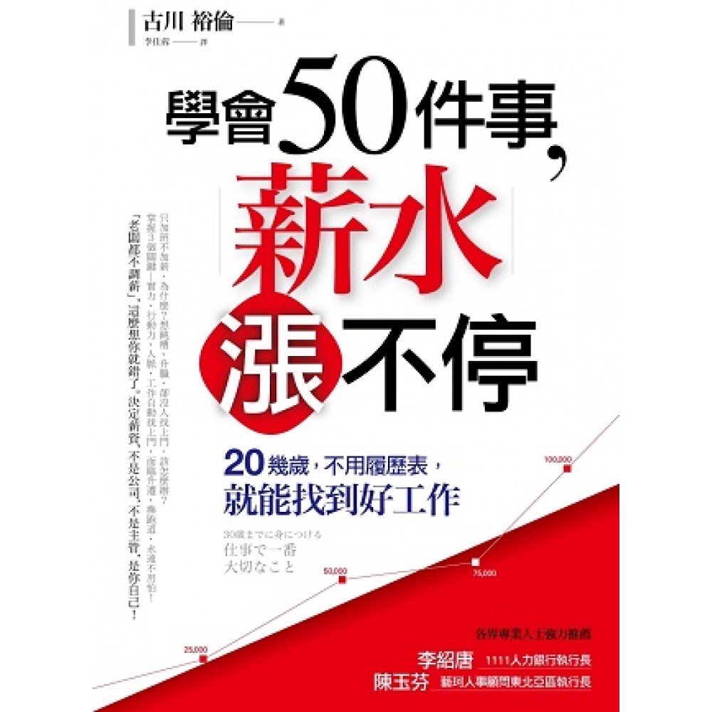 老闆不想告訴你的50個加薪秘訣。 20幾歲,開始儲存「加薪籌碼」,一點都不難! 90%的上班族,一定會問這3件事: (一)只加班不加薪,就這樣過一輩子? (二)薪水不夠用,如何跟老闆談加薪? (三)跳槽,好嗎?換工作就能薪水翻3倍? 今年會「調薪」嗎?明年能「升主管」嗎?後年敢「跳槽」嗎?你以為決定這些事都是老闆、主管、公司嗎?錯!加薪的決定權在你自己,讓自己「增值」,老闆不敢不加薪。 身價有點像房價一樣,如果老闆交付給你愈多工作,表示他其實是想幫你「增值」。高房價區域有那些增值籌碼呢?捷運、學校、公園綠地、市場……,周邊條件愈多,區段行情就會看漲,職場也是如此。英文說寫流利、做事細心有條理、掌控每一項工作進度、擅於人際溝通、提出新創意,為公司創造業績,專業技術能力……,這些都是身價籌碼,你不需要50種都具備,只要掌握其中幾個重點,徹底執行,薪水就能漲不停! 本書作者古川裕倫認為,現在是「憑實力論人」的時代,「實力」才是決定你是否能在公司生存的關鍵。「只會說,不會做」的人,很抱歉,公司一點也不需要!唯有「用腦思考」且徹底「執行」,跟主管提出建議時,連「該怎麼做」都想好的人,才能在職場生存。 多年經驗,他發現一般人在工作上最容易碰到的問題是: ◎沒升遷機會,讓人無法成長!──我該如何在公司「出人頭地」? ◎自己做很多,卻總是沒有「加薪」!──我該如何說服老闆,幫我加薪? ◎好不容易當上主管,部屬卻不服自己!──該如何讓部屬挺我,為我賣命? ◎換了工作,卻發現在新公司難以生存!?──如何在別人的場子奮鬥,建立人脈? 本書作者學校畢業之後,進入日本人最想任職的十大公司之一「三井物產」工作,如果沒有意外,可以一路做到退休,安穩過一生。但他卻希望突破現狀,創造機會,因為他發現,只要累積實力,就能決定「自己的身價」。 46歲時,他「跳槽」到一間大型的藝人經紀公司,薪水、環境都比原來更優渥,至今他都非常滿意這個決定。為什麼他敢這樣做呢?因為他知道,跳槽跟年齡無關,跟「實力」有關。20幾歲,就要不斷累積實力,培養行動力,累積人脈,打造成功的自己。 作者在本書中提出下列8個關鍵,只要掌握,就能如願加薪、升官: (1)主管信任你,交付重要工作,就是加薪的前兆。 (2)把公司當「補習班」,學愈多賺愈大。 (3)會的事情愈多,老闆愈怕你,當然會加薪。 (4)「用頭腦做事」,重要且急迫的事情先做。 (5)別說「等一下」,加薪會等下輩子。 (6)工作完成時,記得報告「我完成了」,讓主管安心。 (7)從自己「最厲害」的強項,火力全開。 (8)建立「公司以外的人脈」,才有跳槽的本錢。 ★想要「薪水漲不停」,你得抓住【四個重點】: (一)拿「實力」換「錢」,加薪就是這麼回事! 職場菜鳥擁有滿腔熱血與想法,最常問上司:「這件事我應該怎麼做?」「我可以這麼做嗎?」與其想「假如」,不如思考「我現在應該怎麼做?」提高「行動力」,在工作中最能快速培養實力。 (二)「人脈」就是錢脈;「能力」就是財力,請現在開始累積。 覺得自己能力不足,下班後再去進修有幫助?不必,只要「認真上班」自然能夠學會;利用下班後的時間,建立「公司以外的人脈」,能夠獲得更多意見與支持。 (三)高業績員工、主管一定能加薪,努力成為這兩種人。 擔心部屬超越自己?你應該這麼想,培育越多傑出的人才,對公司貢獻越多。凡事以公司的整體發展來衡量,就一定能加薪。 (四)跳槽是「加薪的捷徑」,想清楚,就行動。 你是為了「逃避」而跳槽嗎?惡性循環並不會終止!跳槽前先列出優缺點,清楚人生目標,一旦決定,請帶著「最有信心的能力」轉換職場。在別人的場子重新奮鬥,務必「發揮實力」,就能完美勝出。 從現在開始,儲存「加薪籌碼」,只要擁有【專業能力】+【行動力】+【人脈】,人人都能「薪水翻3倍,成為搶手人才」!