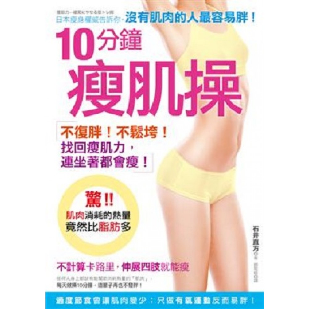 肚子肉總是鬆垮垮? 「瘦肌操」是一種「增加肌肉量」的運動。 科學證實,肌肉消耗的熱量,竟然是脂肪的26倍! 天天節食、慢跑,不如靠「肌肉」燃燒熱量! 找回瘦肌力,永遠不發胖。 ◆為什麼只要「增加肌肉量」,就能瘦?─── 人會胖,除了吃太多外,多半都是因為「不愛動」,讓瘦肌力逐漸消失。肌肉原本是為了讓人類活動而存在,常常使用就能增加靜止不動時消耗的熱量,一天增加50~100卡路里,一年就有36500卡,等於在「大口吃掉熱量」。不過,只要不使用,就會變成「體內不必要的部分」,迅速衰退。只要「肌肉衰退」,熱量的消耗就會減少,也就是造成肥胖的原因,更何況,「肌肉」從30歲開始就會慢慢消失!唯有趁年輕時留住瘦肌力,從此再也不用擔心會發胖了。 ◆14天就能瘦一圈?「瘦肌操」效果驚人! 10分鐘瘦肌操,是增加全身各部位的肌肉,而最容易產生效果的就是「腹部」。其他部位最快要花3個月才能看見瘦肌操的成效,但腹部卻明顯迅速,腰圍在一週或兩週內就會減少。依據個人狀況不同,有些人的腰圍甚至會在兩週內瘦下10吋,這是因為腹部特殊的性質所致。 手臂或腿部的組織十分緊密,骨骼上方有肌肉,再來是皮下脂肪,最上面則是皮膚,如果想讓這些部位變瘦,就只能減去肌肉或皮下脂肪。但是,唯有腹部不一樣。肚子構造是中央為空洞,周圍包覆著肌肉,所以只要改變那些肌肉的活動方式,腰圍也立刻就會改變,最典型的例子就是人在呼吸之時吐出氣息讓腰圍變細,但橫隔膜會在吸入空氣時向下移,使腰圍變粗。例如,想穿上變緊的褲子時,也只要呼氣讓肚子盡量縮小就能穿得下,想瘦肚子就從增加肌力開始。 ◆肚子變小了,其他部位「通通能瘦」! 藉由瘦肌操讓腹部尺寸縮小的方式,基本道理也與這種作法相同。「瘦肌操」針對大腰肌訓練的動作不少,只要讓大腰肌確實運動,骨盆就會直立、脊椎會伸直,背脊也跟著挺直。這麼一來肚子裡的空洞(腹腔)就會被垂直牽引,腰圍自然也就變小了。這種變化並非體脂肪減少造成,所以無法稱為「真正的效果」,就某些意義來說只是種把戲,然而腰圍縮小是不爭的事實,所以心情的確會變得很愉快,而這種情緒正是讓人持續運動的動機,只要繼續做,身體裡的脂肪就會減少,未來絕對會獲得「真正的效果」。 ◆瘦身不可或缺的力量,就是「瘦肌力」!─── 一味的節食、減少卡路里攝取,的確會瘦很快,但隨著年紀變大,會越來越難減,要是不節制,只會一年比一年更胖!而且只靠節食瘦身,就算瘦了也沒有曲線,一點都不好看!想要真正健康的瘦下來,靠的是瘦身所需的肌肉力量」,也就是「瘦肌力」。「肌肉」不是運動員、健美先生的代名詞,任何人身上都該有能幫助消耗熱量的「肌肉」,想要瘦得漂亮、擁有曲線,就得找回「瘦肌力」! 日本最權威的瘦身專家—石井直方,依據自己健身教練的專業背景及長期輔導減重者的經驗,研發出一套最有效的「10分鐘瘦肌操」,只要「伸展四肢」就能瘦!動作簡單,人人都能做,從手臂、肚子到大腿,全身都可以瘦下來,再也不需辛苦的慢跑或節食,也不用上健身房,特別是對從不運動的人而言,效果更好。 ◆「10分鐘瘦肌操」的3大特色: ◎不用花半毛錢── 減肥需要「持續」且有恆心,要花錢的方法不容易長久,因此,只需伸展四肢的10分鐘瘦肌操就是最適合現代人的瘦身方式,沒有高額學費、不需要任何器材,隨時都能做。 ◎只有五個動作,不費力── 一般的肌肉運動是靠著重度壓迫肌肉,才能達到健身效果。但是,10分鐘瘦肌操的動作簡單,卻能讓肌肉在短時間內達到極限,進而增加肌肉量,還可以針對想加強的部位雕塑,練出完美S曲線。 ◎不用天天做,每次只要10分鐘── 每次只要10分鐘,一週2~3次,最適合忙碌的現代人,更沒有場地限制,不論是上班、通勤、看電視,不浪費時間,想到就能做,輕鬆把減肥融入生活習慣中,一舉數得。 想瘦下來的人,一定要看這本書,三件事破除你的減肥迷思: (一)刻意少吃、做有氧運動,一定會復胖── 肌肉是身體的引擎,長期少吃,會讓身體變成節約熱量型的體質,只要一恢復飲食,就算只吃一點點也會復胖。因此,若能先將身體的地基打好,就能讓肌肉量增加、提高身體的代謝,就算只是少吃,體重也會快速下降。此外,誤以為只要多做有氧運動,如慢跑、健走等,就能瘦下來的想法,其實是錯的。因為一天的運動量若沒有2小時,就不必期待瘦身的效果會很明顯,且只要一天沒做,就沒有效果。 (二)10分鐘肌肉運動,比60分鐘有氧運動有效── 「有氧運動」像撲滿存錢,「瘦肌操」是複利存款,會生利息。做10分鐘瘦肌操,比一週跑步60分鐘還有效。「有氧運動」只要一天沒做,就是零效果,但「瘦肌操」則不同,10分鐘就能輕鬆增加肌肉量,就算幾天沒運動,肌肉還是會幫助燃燒熱量。肌肉因運動而有彈性,讓身體曲線變好,手臂、肚子、大腿都能因此而緊實,塑造魔鬼曲線。此外,也能讓肌肉以正確的姿勢支撐身體進而改善痠痛,連血液循環都能變好,再加上能促進「生長激素」的分泌,讓細胞活躍,自然能看起來變年輕、有活力。 (三)只要五招簡單動作,增加肌肉量,就能變成「易瘦體質」── 減肥最忌「半途而廢」,只要每天做10分鐘瘦肌操,就像刷牙、洗澡一樣,養成習慣就能擁有「瘦肌力」。本書以真人示範動作,搭配全彩圖片及步驟說明,動作清楚,除了能讓你減肥成功,輕鬆創造