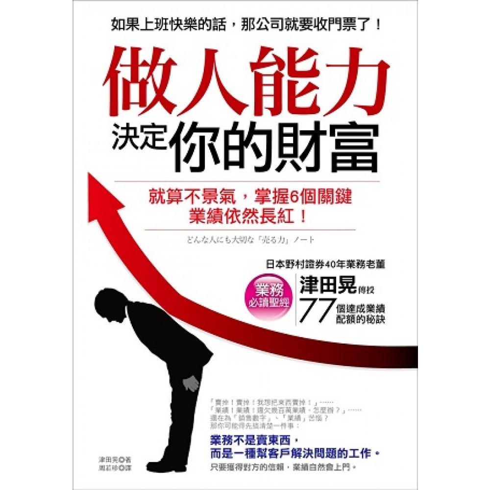 如果上班快樂的話,那公司就要收門票了! 最受歡迎的「40年職場成功筆記本」, 告訴你:「想賺錢,先學做人。」 ◆做人能力=賺錢本事 「慘了!我還欠好幾百萬業績!」…… 「糟糕!客戶就是不下單!」…… 你可能得先搞清楚一件事:「業務不是賣東西,而是一種幫客戶解決問題的工作。」 你一定碰過銀行專員或保險業務,突然打電話推銷某種「理財專案」、或「這個投資型保單不錯」的經驗,通常對方還沒講完兩句話,我們就想馬上掛電話,一分鐘都不想多聽多聊;真正「一流的業務員」卻正好相反,不用說太多,就算這商品很昂貴,你還是會毫不猶豫地買單。為什麼會有這樣的差距呢? 因此,「銷售能力」其實就是「做人能力」,業務工作與其說是銷售,倒不如說是「提供客戶一種解決的方法」。 房仲業將「對的房子賣給對的人」,讓人們安居定所,找到一種新的幸福;速食店提供舒適的用餐環境及餐點給每一個客人,在60秒之內完成100分的品質服務;蘋果電腦的創辦人史帝夫.賈伯斯先生設計IPOHNE、IPAD等3C產品,源源不絕的創新點子,讓人們獲得更便捷、先進的生活,不正也是一種為客戶「解決方法」的工作嗎? 可是,當東西賣不出去時,怎麼辦?房子沒有客戶喜歡、書擺在書店裡沒人拿起來看…這個時候如果使出了三寸不爛之舌,硬是跟顧客死纏爛打、推銷再推銷。這樣,有用嗎? 日本最大的證券公司-野村證券前董事津田晃在20多歲時,也因為「沒業績、沒客戶」而感到苦惱,直到他改變了心態之後,才開始出現了轉機。如果顧客一直看到他「只是想把東西賣出去」的樣子,一定不會買單。因此他把「賣掉!賣掉!我要把東西賣掉!」的心態轉變為:「不用一直想把東西賣出去也沒關係,業務不是賣東西,而是一種提供客戶解決方法的工作,因此只要獲得對方的信賴,對方自然會向我們購買。」 這本書正是作者公開40年來的「業績達成秘技」,只要在工作中發現任何銷售訣竅、職場生存之道等,他就立刻寫下來。筆記的內容不但能督促他反省,更成為其精神食糧,幫助他順利完成每一天的工作。 ◆再怎麼不景氣,會做人的工作者,業績依然會長紅 日本百貨公司的服務與台灣的專櫃小姐很不一樣。當你在專櫃買完東西,準備踏出專櫃那一刻,服務人員會面帶笑容,並帶著180度的鞠躬說「謝謝您的惠顧」,不但親自幫你拿著剛剛購買的商品至專櫃門口,還會目送你離開。讓客戶感受到「我將您擺在第一位」,不僅能讓客戶帶著愉悅的心情離開,也是讓生意回流的重點之一。 到哪裡都可以看到的7-11便利商店,就算沒有要買什麼,每天一定都也要去逛個一、二次,在如此不景氣的環境下,能仍如此保持活力地永續經營,也是有道理的。7&I控股集團每兩週在總公司進行的FC會議上,都有近1700位全國分店店長出席,會議的議題,經常都是「顧客的心聲」,他們會分享自己在現場的感受,來掌握顧客的需求,並且加以活用、提昇業績。這樣的經營手法,可說是行銷管理的典範。 ◆作者的銷售心法並非只是強調「賣」,而是「學會做人、業績自然長紅」的法則,一種「向客戶學習、對客戶誠信、與客戶一起贏」的情感。 就算經濟再怎麼不景氣,只要學會擁有這些做人能力,你就能晉升成「超級業務」,你該知道的「馭客心法」還有: 1、態度愈強硬,客戶愈想逃開。 2、就只是「講電話」,也要誠懇。 3、把客戶當作戀人,多付出一點。 4、想辦法擄獲「有決定權」的人。 5、有沒有馬上回應,客戶的感受會不一樣。 6、守時、守時、守時! 7、下班後與客戶的交際時間,不是讓你玩樂的。 ◆業績、薪水就大幅增加,如果你懂得這些「做人訣竅」 不論工作,人生也是如此。想讓同事主動幫忙你,想讓喜歡的人了解你,政治家想獲得人民投票。為了達到目標,每個人、每一天都在想辦法獲取他人信賴,或是讓別人喜歡自己,「讓別人信賴你」也是一種做人道理,更是任何人都應該具備的能力。 這77項做人能力,不僅是業務員的銷售聖經,對於目前工作遇到困難沮喪,止步不前的你,更是獲得自信與勇氣的信條。作者提到「當你迷惘時,請記得選擇辛苦的那一條路」即使這樣不論經驗是失敗或成功,都能為自己帶來力量。能勇敢面對困難,並努力解決的人,才會受到主管、客戶的高度評價。成功沒有捷徑,迷惘是必然,多留一點汗水,你的人生一定會有所成就,這些獲得信心及勇氣的信條還有: 1、隨時吸收新知,你才會越來越強。 2、克服「怕麻煩心態」,就能有所改變。 3、永遠要記得第一次為工作開心的時刻。 4、不要斤斤計較「努力的量」。 5、越是找藉口,人越容易陷入負面思考。 本書特色 本書共分成6個章節,77則服務心法,每一則都穿插作者在職場上的實戰經驗,書中也引用多位歷屆領導者的理念,除了帶給社會新鮮人正確的工作態度外,也提供領導者培育部屬與發展同業文化的心得,內容淺顯易懂、字字深入人心,你想先讀哪一章? 人生,不正也是一種「推銷」嗎?我們時時面臨挑戰、遭逢挫折,不停地「Try」,這些法則也可以應用在生活中各個層面,讓思考更積極正向。希望你讀完本書,能夠從此突破迷惘,活出自己的精采!