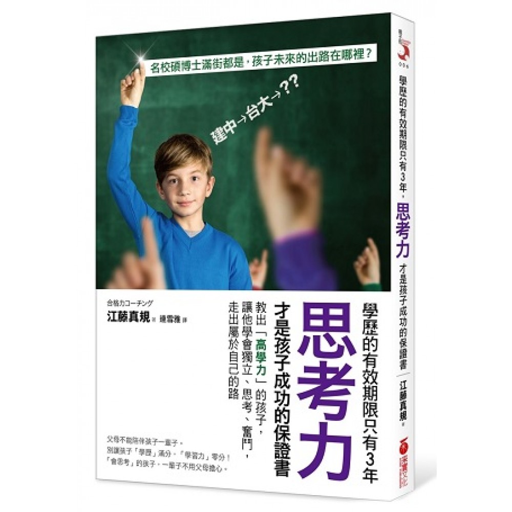 「會思考」的孩子,一輩子不用父母擔心。 日本最會教孩子的媽媽告訴你,教出「高學力」孩子的祕訣。 【日本Amazaon網路書店,4.5顆星好評推薦】 台灣,2013年畢業的博士生,有95%的人失業。「高學歷」,不再是就業保證書。名校畢業的碩博士,滿街都是;學歷,越來越不值錢。面對高失業率的就業環境,孩子未來的出路,究竟在哪裡? 「我兒子好不容易找到工作,才上班3天,就說壓力太大、公司規定太多,不做了。」 「我女兒說現在工作太難找,大學畢業後要繼續唸書,反正也還沒想到未來要做什麼,先拿到碩士學位再說。」 為什麼成績優異的孩子,一踏入職場,竟會變成抗壓性極差的「草莓族」?孩子的求學過程,明明很順利,從小學習各式各樣的才藝、到名師授課的補習班補習、考上第一志願、從名校畢業;然而,這樣看似「一百分」的人生,為什麼在踏入職場後,就瞬間走調? 許多父母往往因為太愛孩子、希望他們擁有平順的人生,因而自作主張地為孩子安排一堆「提升競爭力」的課程,強迫孩子考上「好學校」、選擇「好科系」。然而,卻從未問過孩子:「這是你喜歡做的事嗎?」總是強迫孩子按照自己安排的「劇本」過生活,於是,孩子變得懶散、不積極,一旦踏入殘酷的職場,很快就會被淘汰。 本書的作者江藤真規,擁有兩個就讀日本最高學府「東京大學」的優秀女兒,除了優異的成績之外,她們對於未來也充滿自己的想法;因為從小,作者就培養孩子成為「有夢想」的人,所以,對於作者的女兒們來說,考取所謂的「名校」,從來都不是自己讀書的「目標」;她們努力唸書的目的,在於實現更長遠的理想。 其實,父母的任務,並不是將孩子培養成「考滿分」的資優生;養育出具備堅強意志力,無論身處任何時代,都能生存下去的孩子,才是父母必須致力去做的事。 ◆「學歷」不代表一切,「能力」才是關鍵 職場上的競爭非常激烈,擁有高學歷的人比比皆是,如果孩子只會考試,缺乏待人處事的應變能力,再漂亮的學歷,就只會像一張薄薄的紙,毫無作用。因此,與其強迫孩子讀「前途光明」的明星科系,不如讓孩子做選擇,在自己喜歡的事上努力,孩子才會積極學習,進而提升「能力」。 ◆做到5件事,燃起孩子的鬥志 「不要再玩電腦了,趕快進房間唸書!」「明天要交的作業,你不是還沒做完嗎?都快要考試了,你到底在幹嘛?」你是否常常這樣對孩子說,非得要三催四請,孩子才會心不甘、情不願地開始讀書呢?其實,孩子是為自己讀書,並不是為父母;然而,父母一再地強迫,就會讓孩子產生「我是為爸媽而讀書」的心態,自然會變得很被動。所以,作者告訴我們,別總想著「我要讓孩子唸書」,而要思考如何讓孩子自動自發地坐到書桌前,也就是「激發鬥志」。 【方法1】讓孩子建立長遠目標,別只看到眼前的考試成績。 【方法2】常具體地讚美孩子的好表現,孩子進步飛快。 【方法3】客觀而不帶情緒的責備,孩子更容易接受。 【方法4】別總要孩子「忍耐」,幫助他換個角度思考。 【方法5】仔細觀察孩子的變化,多說「你變得好棒!」 ◆活用5個訣竅,訓練孩子獨立思考 作者的女兒曾經有過一句口頭禪:「媽媽,接下來我要做什麼呢?」作者便會回答:「嗯……,那妳接下來開始去寫學校的作業吧!」女兒的行動,全部都由作者來決定,完全不是出於自願。當時的作者,滿腦子只想著「要讓孩子按照預定計畫,順利完成每件事」。 其實,每個孩子都是獨立的個體,都有獨立思考的權利;訓練孩子如何思考,也是身為父母的任務之一。作者告訴我們,教出「會思考」的孩子,只需要掌握5個訣竅: 【訣竅1】做決定前,先問孩子的想法。 【訣竅2】問完問題,留3分鐘給孩子「想答案」,別急著看到結果。 【訣竅3】先讓孩子把話說完,再表達自己的看法。 【訣竅4】讓孩子感受「愛」,增加自信心。 【訣竅5】別在孩子身上「貼標籤」,相信他一定做得到。 ◆掌握3大技巧,讓孩子把妳當成「最好的朋友」 有一次,作者的女兒到同學家裡玩,回到家後,興奮地對作者說:「我同學的媽媽真的很了解我們,她一直很認真聽我和同學說話,不會隨便打斷我們,就像是我們的好朋友一樣呢!」此時,一向覺得自己很善於「傾聽」的作者,詫異地問女兒:「我覺得我也是妳們很好的聽眾呀?」沒想到,女兒竟然這樣回答:「媽媽才不是這樣呢!妳每次都只想聽自己有興趣的部分,只要聽到沒興趣的話題,就會想要趕快結束。」 其實,孩子遠比我們想像中還要聰慧、敏感,父母無意間表現出來的「忽略感」,孩子都能夠輕易察覺。不過,與孩子相處的過程中,只要掌握以下3種技巧,就能夠使孩子願意對妳敞開心房。 【技巧1】傾聽孩子的心,建立穩固親子關係。 【技巧2】讚美也要看「時機」,孩子表現好時,給予即時的肯定,更能燃起鬥志。 【技巧3】常對孩子「發問」,引導出孩子真正情緒、訓練多元化思考。 ◆「吃苦」,也是孩子人生的必修課 沒有父母可以陪伴孩子一生,別怕孩子跌倒、受傷,唯有吃過苦頭的孩子,才能勇敢地接受人生的各種挑戰。孩子真正的「幸福」,並不是一帆風順,而是在遭遇挫折、困難時,永不放棄地站起來,告訴自己:「我一定做得到!」 本書特色 (1)最清楚的文字內容 作者以淺白易懂的文字,以重點式的條列說明,讓每位爸媽都能輕鬆應用、執行。 (2)最生活化的教養實例 作者以自己養育女兒的經驗,分享教養面臨的困難,以