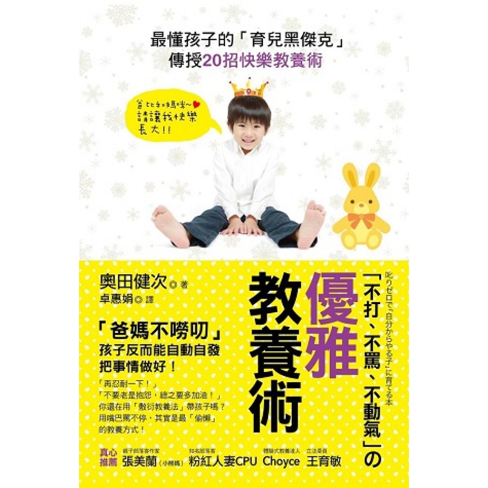 作者簡介 【臨床心理學家】 奧田健次 專業行為療法專家、臨床心理學家,在日本有「育兒界怪醫黑傑克」之稱,用獨樹一格的有效方法,協助天下母親解決各種育兒煩惱,包括拒絕上學的孩子到有發展障礙的問題兒童等,都是他的諮商對象。 奧田健次創辦日本家有自閉兒的到宅服務,是「以家庭為核心指導(home-based intervention)」的先驅者,支援全國各地的家庭諮商服務。之後,成立「ABA應用行為分析(Applied Behavior Analysis)」,接受來自世界各國治療申請,導入解決各種行為問題的創見及技巧,論其專業與指導計劃無人能出其右,因而受到各國學者讚揚。 2012年從大學辭去講課職務,移居至淺間山麓的西輕井澤,創設行為指導學院,矢志和孩子、高齡者、動物共同在高原自給自足地生活。著作包括《育兒原則》、《自閉症兒童的明亮療育諮詢室》(與小林重雄合著)等。 獲獎紀錄: 1999年 內山記念獎(日本行為療法學會) 2003年 日本教育實踐學會研究獎勵獎 2008年 第四屆日本行為分析學會學會獎(論文獎) 及行為科學系二大學會的首屆雙重獲奬人