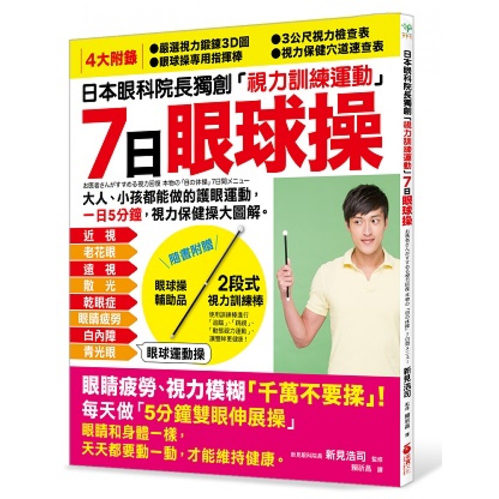 眼睛疲勞、視力模糊千萬不能揉! 一週7天,讓雙眼伸展5分鐘, 大人、兒童、銀髮族都能做的「全民護眼運動」! 【隨書獨家附贈】 2段式視力訓練棒+嚴選視力鍛鍊3D圖+視力檢查表+穴道速查表 3C產品的發達,把平板當電動玩具的孩子越來越多,父母放任孩子成天看電視、打電動的結果,常常一個寒暑假過去,孩童就開始抱怨視力模糊。許多家長一聽到小孩看不清楚,未經看診確認就帶孩子到眼鏡行配眼鏡,假性近視往往因此弄假成真。 本書作者日本知名眼科醫生新見浩司認為:「一看不清楚就立刻配戴眼鏡,正是近視度數加深的最大要因。」因為眼鏡矯正視力的同時,也會增加眼睛的負擔,使度數在不自覺間不斷加深,陷入惡性循環! 如果你發現孩子近視了,當務之急不是驗光、配眼鏡,而是在度數固定之前,盡可能減輕眼睛的負擔。新見醫師在看過許多假性近視案例後,研發了一套保健視力的「7日眼球操」,幫助眼球做運動。 ◎保健視力,每天讓自己做3件事: (1)每天做「7日眼球操」 (2)觀看「視力鍛鍊3D圖」 (3)每天按壓「6大穴道」 ◎「7日眼球操」X「視力保健6穴道」X「3D立體圖」,讓眼睛多運動 「7日眼球操」的動作非常簡單,在家隨時隨地都能做,只要以隨書附贈的「訓練棒」輔助,觀看訓練棒前端的小白球,讓眼球全面性做到各方位的移動,可放鬆緊繃僵硬的眼周肌肉,再觀看隨書附錄的10張最新3D圖,最後按照指定天數進行眼球操指定動作即可。 ◎一日一操,讓大腦變年輕! 7日眼球操的動作以【追瞄】及【跳視】為訓練主軸,讓眼球做「眨眼、睜眼、看左、看右、看上」、看下、看近、看遠」等八個動作。【追瞄】屬於「慢速動作」,讓眼球專注在標的物不動,藉以移動臉部達到提升「動態視力」。【跳視】透過眼睛瞬間移動,搭配三種不同的視物速度,刺激大腦整合資訊的能力。 基本動作──近距離【動眼】運動 第一日──左右上下【動眼】追瞄&跳視運動 第二日──凝視【動臉】追瞄運動 第三日──左上右下【動眼】追瞄&跳視運動 第四日──Z字形【動眼】追瞄&跳視運動 第五日──8字【動眼】追瞄&跳視運動 第六日──8字【動臉】追瞄運動 第七日──鬥雞眼【動眼】追瞄&跳視運動 本書3大特色 【獨家眼球保健4大附錄】 本書除全彩動作示範外,更特別收錄4大附錄贈品,眼球操專用兩段式訓練棒、嚴選3D圖、視力保健穴道速查表及3公尺視力檢查表,保健視力全面俱到。 【專業眼科醫師動作設計】 「7日眼球操」是由日本知名眼科院長新見浩司獨家研發,包含「追瞄運動」與「跳視運動」,符合醫學原理,運動頻率與次數也都經過縝密計算,眼睛和身體一樣,每天都要動一動才健康。 【每日5分鐘,輕鬆實行】 本書收錄的每日眼球操動作不超過8個,簡單易懂,搭配全彩真人照片示範及詳細圖說、表格,不論大人、小孩都可以在家就能輕鬆實行。 眼睛疲勞、視力模糊千萬不能揉! 一週7天,讓雙眼伸展5分鐘, 大人、兒童、銀髮族都能做的「全民護眼運動」! 【隨書獨家附贈】 2段式視力訓練棒+嚴選視力鍛鍊3D圖+視力檢查表+穴道速查表 3C產品的發達,把平板當電動玩具的孩子越來越多,父母放任孩子成天看電視、打電動的結果,常常一個寒暑假過去,孩童就開始抱怨視力模糊。許多家長一聽到小孩看不清楚,未經看診確認就帶孩子到眼鏡行配眼鏡,假性近視往往因此弄假成真。 本書作者日本知名眼科醫生新見浩司認為:「一看不清楚就立刻配戴眼鏡,正是近視度數加深的最大要因。」因為眼鏡矯正視力的同時,也會增加眼睛的負擔,使度數在不自覺間不斷加深,陷入惡性循環! 如果你發現孩子近視了,當務之急不是驗光、配眼鏡,而是在度數固定之前,盡可能減輕眼睛的負擔。新見醫師在看過許多假性近視案例後,研發了一套保健視力的「7日眼球操」,幫助眼球做運動。 ◎保健視力,每天讓自己做3件事: (1)每天做「7日眼球操」 (2)觀看「視力鍛鍊3D圖」 (3)每天按壓「6大穴道」 ◎「7日眼球操」X「視力保健6穴道」X「3D立體圖」,讓眼睛多運動 「7日眼球操」的動作非常簡單,在家隨時隨地都能做,只要以隨書附贈的「訓練棒」輔助,觀看訓練棒前端的小白球,讓眼球全面性做到各方位的移動,可放鬆緊繃僵硬的眼周肌肉,再觀看隨書附錄的10張最新3D圖,最後按照指定天數進行眼球操指定動作即可。 ◎一日一操,讓大腦變年輕! 7日眼球操的動作以【追瞄】及【跳視】為訓練主軸,讓眼球做「眨眼、睜眼、看左、看右、看上」、看下、看近、看遠」等八個動作。【追瞄】屬於「慢速動作」,讓眼球專注在標的物不動,藉以移動臉部達到提升「動態視力」。【跳視】透過眼睛瞬間移動,搭配三種不同的視物速度,刺激大腦整合資訊的能力。 基本動作──近距離【動眼】運動 第一日──左右上下【動眼】追瞄&跳視運動 第二日──凝視【動臉】追瞄運動 第三日──左上右下【動眼】追瞄&跳視運動 第四日──Z字形【動眼】追瞄&跳視運動 第五日──8字【動眼】追瞄&跳視運動 第六日──8字【動臉】追瞄運動 第七日──鬥雞眼【動眼】追瞄&跳視運動 本書3大特色 【獨家眼球保健4大附錄】 本書除全彩動作示範外,更特別收錄4大附錄贈品,眼球操專用兩段式訓練棒、嚴選3D圖、視力保健穴道速查表及3公尺視力檢查表,保健視力全面俱到。 【專業眼科醫師動作設計】 「7