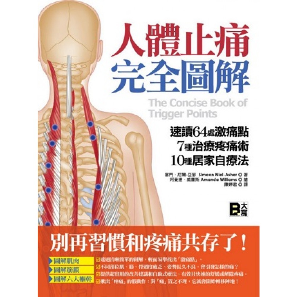 前言:止痛前,先關心身體運行的模式 1、肌肉筋骨怎麼動? 骨骼肌:牽一髮而動全身 肌肉:它們也有自己的名字 怎麼用「力」:「動」的槓桿原理 肌肉和骨頭怎麼連結? 輕忽不得的「膜」:筋膜&肌筋膜 筋膜的形成 2、想「止痛」,要知道「痛」怎麼來 什麼是「激痛點」? 激痛點就是針灸穴位嗎? 全身都痛的纖維肌痛 缺乏什麼營養讓你痛? 鑑定你的不良姿勢 激痛點的十字模式 激痛點怎麼來? 激痛點的種類 激痛點的症狀 來檢查吧!為何痛不停? 3、「止痛」的方法 觸診法 注射與乾針穿刺法 噴療與牽引法 徒手放鬆法 擺位放鬆術 按摩法 淋巴引流按摩法 4、頭、頸的痛 顱頂肌(額枕肌) 眼輪匝肌 嚼肌 顳肌 翼外肌 翼內肌 二腹肌 前、中、後斜角肌 胸鎖乳突肌 顳顎關節(TMJ) 5、身軀、脊椎的痛 豎脊肌 後頸肌群 多裂肌/旋轉肌 頸夾肌/頭夾肌 腹外斜肌 腹橫肌 腹直肌 腰方肌 髂腰肌(腰大肌/髂肌) 橫隔膜 6、肩膀、上臂的痛 斜方肌 肩胛骨 小/大菱形肌 腋窩 胸大肌 背闊肌 三角肌 棘上肌 棘下肌 小圓肌 肩胛下肌 大圓肌 肱二頭肌 三頭肌 7、前臂、手的痛 旋前圓肌 掌長肌 腕部屈肌群 肱橈肌 腕部伸肌群 伸指肌 旋後肌 對掌拇肌/內收拇指肌 小手肌肉 8、髖骨、大腿的痛 臀大肌 闊筋膜張肌 臀中肌 臀小肌 梨狀肌 大腿後肌 髖內收肌 恥骨肌 縫匠肌 股四頭肌 9、腿、腳的痛 脛前肌 伸趾長肌/伸拇長肌 腓長肌、腓短肌、第三腓骨肌 腓腸肌 蹠肌 比目魚肌 膕肌 屈趾長肌/屈拇長肌 脛骨後肌 腳的表層肌肉 腳的深層肌肉 10、搞定疼痛:更多激痛點的二三事 激痛點的「待命」 反向治療激痛點 居家自療實例 11、重要名詞總複習