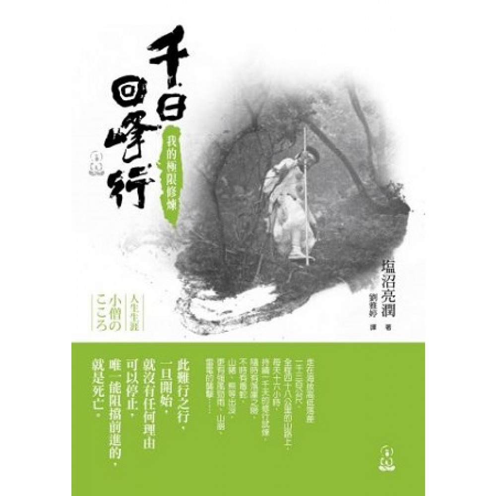 走在海拔高低落差一千三百公尺,全程48公里的山路上, 每天十六小時,持續一千天的修行試煉, 隨時有落崖之險,不時有毒蛇、山豬、熊等出沒, 更有強風勁雨、山崩、雷電的襲擊…… 此難行之行,一旦開始,就沒有任何理由可以停止,唯一能阻擋前進的,就是死亡。 「千日回峰行」是日本極具歷史傳統的一種修行,可追溯到距今約一千三百年前奈良時代的信仰流派「修驗道」。修驗道的始祖是役行者,重視身體實踐甚於教理研究,提倡修行者要透過往返靈山諸峰、禮拜堂塔神衹、修習各種難行和苦行,來不斷超越自我,以期得到修行的效驗。這種修行法仍保留到今日,成為日本獨特的修行方式。 作者塩沼亮潤,幼年便立定目標「想要成為千日回峰行者」,十九歲時帶著這樣的夢想,來到奈良縣吉野山的金峰山寺出家,在寺院學習長達十九年、循序漸進的極限修行訓練。首先他必須先學習作一個唯命是從的修行僧,每日進行一般的灑掃作務;接下來,必需通過「百日回峰行」的短程考驗,而後才有資格進行「千日回峰行」。「千日」指的是每年四個月,持續九年的登山修行,這修行一旦開始,不能就醫、不能說話,無論任何原因都不能間斷。作者塩沼亮潤就在這樣的修煉中,往返在高度落差一千三百公尺的險峻山嶽,歷經各種身心考驗,深刻體察到大自然的無常法則,在每一日都逼近生死的極致考驗中,深深感受到什麼才是「真正的活著」,並有這樣的體悟: 所謂的修行,就是涵養出能夠接受一切的心量。 將艱苦之袋從內翻轉過來,即是幸福之袋;同樣地,只要翻轉心念,辛苦的時刻也能是最幸福的時刻。 這條迂迴曲折、長遠且艱難的路,既非冒險也不是探險,而是踏實、堅定地走過不後悔的每一天,將大家合力一起生活過來的羈絆,轉變成深信神、佛的不可動搖的心。