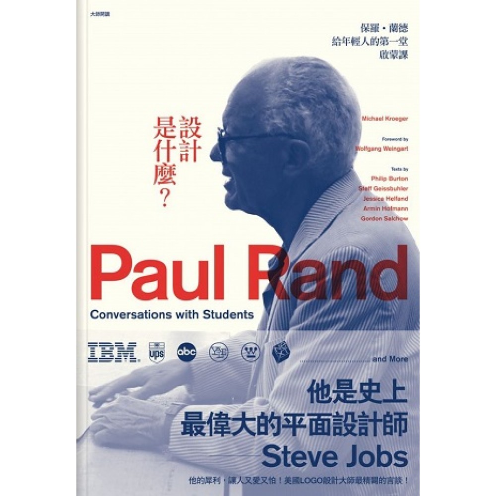 前言 我從1968年開始在瑞士巴塞爾設計學院(Basel School of Design)教排版。保羅.蘭德有次和阿敏.霍夫曼(Armin Hofmann)一起過來。我很榮幸,能在平版印刷系的地下室暗房裡,和一位享譽國際的設計名人碰面,那時我以為,他是來自一個每村每鎮都聳立著摩天大樓的國家。 蘭德一邊和我握手,一邊問道:「阿敏,這就是那個狂人韋格特?」那時我才二十七歲,只有少數圈內人知道我有個「狂人」(crazy man)的外號,但蘭德無所不知,圈內人的所有祕密他都一清二楚。 接下來那二十三年間,我在瑞士布利薩戈島(Brissago)的耶魯大學平面設計暑期研習計畫(Yale Summer Program in Graphic Design)上,遇到過許多學生。每個學生提起他們的蘭德老師,都有一番故事可說。由於這些故事往往彼此衝突,差異頗大,於是我對這位獨一無二的謎樣人物就越來越好奇。 菲力.波頓(Phiip Burton)是我在巴塞爾設計學校最早的學生之一,1986年,他在耶魯大學教授版面編排和平面設計,於是,我有機會在那年4月,去耶魯開了一個禮拜的課——對象是大學一年級的學生。保羅.蘭德無法出席我的首堂講座,因為眼睛的關係,開車一事對他變得越來越困難。 不過,波頓收到一個令人驚喜的邀約:蘭德竟然邀請我和波頓去他位於康乃狄克州衛斯頓(Weston)的家裡,為他和妻子瑪莉安(Marion)開一堂私人講座。那棟房子是蘭德設計的,1952年起他便在那裡工作,直到過世。那個夜晚結合了美妙的餐點,在那晚的課程結束後,我腦中與蘭德家族有關的所有故事,全都變得無關緊要。我們的友誼自此展開,並一直維持到1996年11月,蘭德在諾沃克(Norwalk)的住家附近與世長辭,那是一棟高樹環繞的安靜居所。 我們定期在美國或瑞士碰面。在他少數幾次造訪巴塞爾期間,我們有幸兩度邀請他和瑪莉安到學校,與我排版課上的學生共聚一堂。他那機智而幽默的講座,讓這一切達到高潮。 經過這些年的交往,我們發現彼此對童書有著共同的熱愛。蘭德在1956到1970年間,為童書界的傳奇編輯瑪格麗特.麥艾德麗(Margaret McEldery)設計了四本書並繪製插圖,四本書都是由Harcourt Brace and World出版,分別是:《我知道很多事》(I Know A Lot of Things, 1956)、《火花與陀螺》(Sparkle and Spin, 1957)、《小1》(Little 1, 1962)以及《聽!聽!》(Listen! Listen!, 1970)。負責撰寫內文的,都是他的第二任妻子安(Ann)。我也為約旦和巴基斯坦的小孩們創作了好幾本童書。 湯姆.布倫(Tom Bluhm)是蘭德的學生,也是多年好友,他不時會來我這走走,帶些蘭德為不同公司撰寫和設計的簡報小冊給我。其中一本小冊,描述他如何一步步為史蒂夫.賈伯斯(Steve Jobs)的NeXT Computer(位於加州帕羅奧圖 [Palo Alto])發展出公司商標。他利用這些小冊幫助各個公司了解他如何研究不同的字體,然後將這些字體轉變成最後的標誌。他的解釋總是那麼清晰、簡潔、周全,教我印象深刻。即便是用我的菜英文,也能看懂每一個句子。 蘭德對於未來的設計發展以及我們所居住的這個世界所提出的種種諍言,在我看來,是當前最強烈也最重要的呼聲之一。他的態度坦率而直接。我相信他必須說的那些,我們也分享了許多看法。1996年11月初,蘭德在麻省理工學院發表了他的最後一場講座(由前田約翰 [John Maeda] 籌劃)。當天,演講廳擠得水洩不通,蘭德以清晰連貫的口氣,談論藝術與設計中的形式和內容,那也他最後一本書《從拉斯科到布魯克林》(From Lascaux to Brooklyn, 1996)的關注焦點。 ──沃夫岡.韋格特(Wolfgang Weingart) 序 我是在瑞士的布利薩戈島第一次碰到蘭德並和他一起做研究,那是1981年夏天,一場為期五週的研討會,那次研討會還包括四場個別講習,一場為期一週,講師分別是菲力.波頓、阿敏.霍夫曼、赫伯.馬特(Herbert Matter)和沃夫岡.韋格特。蘭德班上的指定作業是:以畫家米羅(Joan Miro)為主題,構思一件視覺語義(visual semantics)方案。設計的目標是:利用文字和字母描繪出某個概念或激發出某個意象——說得更明確點,就是利用MIRO這四個字母,讓人聯想起這位畫家的作品。我的解決方案之一,是一個有趣的設計,利用米羅的名字做出一隻貓的模樣。Figure 1是我的最後定稿,蘭德給了我很大的幫助。 我很高興能在1995年2月,蘭德訪問亞利桑那州立大學(ASU)時,有機會跟他簡短會談,並和他與夫人瑪莉安共進午餐。亞利桑那大學傑出學人計畫(ASU Eminent Scholar Program)贊助蘭德到設計學院客座,帶領學生針對平面設計方案進行班級討論和授課。我們也讓他看了一些學生的作品,包括湯瑪斯.狄崔(Thomas Detrie)教授的字母造型班和我的視覺傳達班。蘭德對學生作品的評語是:和他造訪過的「其他設計學院不分軒輊」,我把這當成是一種恭維。 對談涵蓋的主題相當多樣,但焦點聚集在「設計」以及當時我正在個人網頁上進行的一篇文章,標題是:〈平面設計教育的基本方針〉(Graphic Design Education Fundamentals)。其他重點還包括:平面設計、設計哲學,以及設計教育。本書的內容便是這幾次聚會的摘錄。