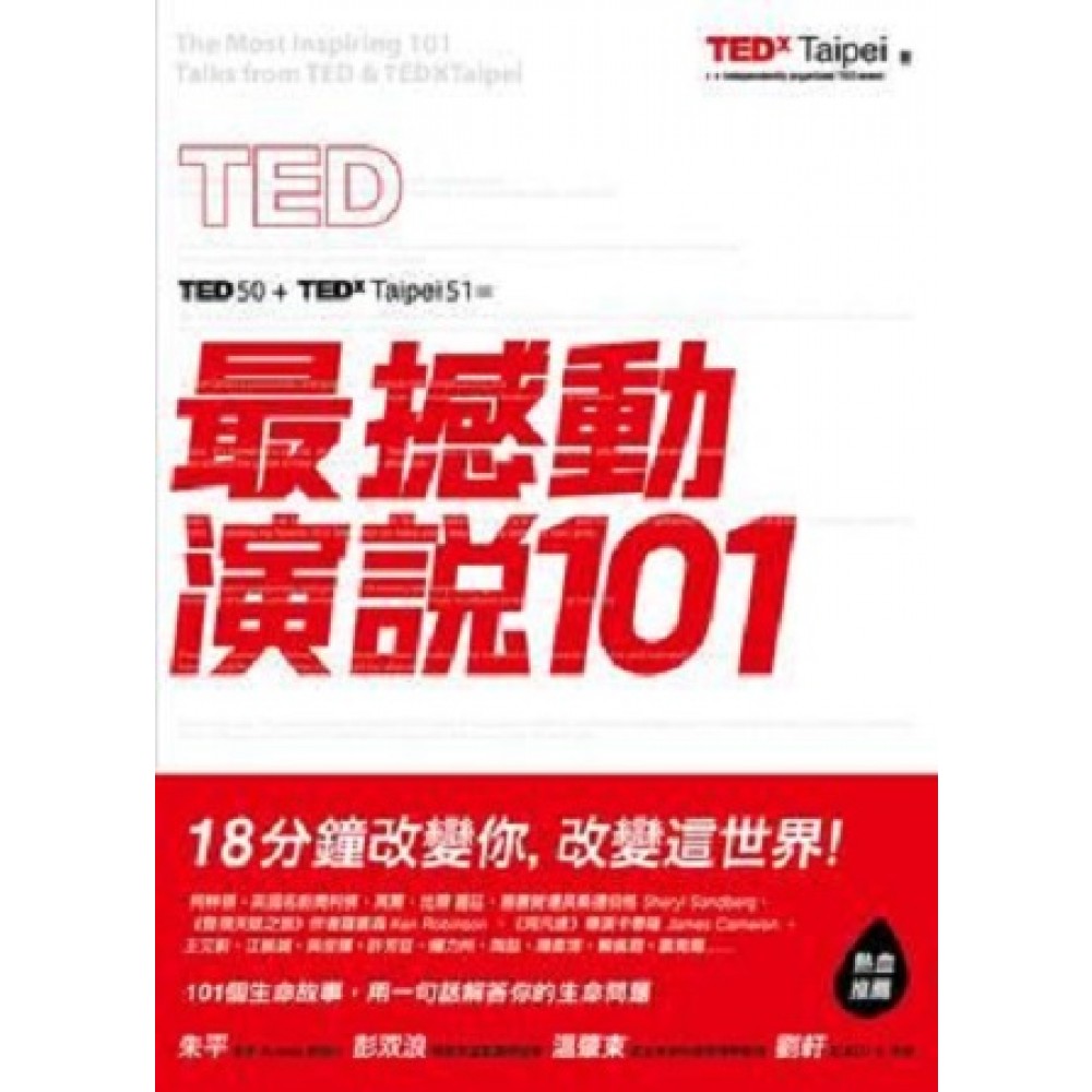 推薦序 「劉軒先生嗎?」 「哪位?」 「我們是TED機構授權的代表,想在台灣辦一場...」 「OK,我答應!」 第一次與TEDxTaipei團隊通電話,大約就這麼簡單。 巧的是,我不久前才與一位好友聊到,說多麼希望華人世界有個TED,能讓各業領袖彼此分享cool ideas,也將之分享給全世界。才說完不過一個禮拜,就接到了Jason他們的來電,timing也未免太妙了。 於是,我有幸在第一屆TEDxTaipei大會登台,上台前緊張地要死。原本以為18分鐘很簡單,準備起來卻發現好難,要精簡內容,要講得生動,要把腦袋裡的東西濃縮成一個具體的概念,再化為人人都懂的故事輕鬆傳達,那18分鐘既是太短又是太長。 隔年我換個角色,用「國樂混電音」為大會做了鬧哄哄的開場演出,而之前一起聊過TED的那位好友,則受邀上台當講師。他就是名歌手陶喆,而這位什麼大場面都見過的舞台老將,面對TEDx幾百位現場觀眾,竟然也緊張到冒汗,可見這不是一般的挑戰啊! 多年來,我在TEDxTaipei講過一次、演出過一次、主持過兩次、幕後大小活動參加了好多次。我和Jason成了朋友,也由TEDx認識了許多跟我八竿子打不著的領域之中的傑出人士。坦白說,沒有TEDx這個平台,還實在很難有機會認識他們。 我會持續支持TED,因為我喜歡交朋友,因為我愛聽故事,因為我認為18分鐘講一生,必然有無比的精彩,有令人興奮的好點子,有令人佩服的精神和智慧。 這本書讓您能快速進入TED世界,點出其中的精華。當然,要充分體驗,更建議您親自駕到TED大會,共襄盛舉,參與這個平台的力量。 劉軒 作者序 我們要留給後代子孫什麼故事? 五年前我和幾個朋友有ㄧ個機會把 TEDxTaipei 引進台灣, 當時鮮少有人知道什麼是 TED。當時我自己為這個任務立下的使命是 “ 打造ㄧ個華人說故事的平台”。TED代表的是科技 (Technology), 娛樂 (Entertainment), 設計 (Design), 它的魅力在於用 18 分鐘分享ㄧ個可以改變世界的想法或感動人心的故事。當我們把TEDxTaipei 帶進來的時候在想的是要如何用自己的語言說自己的故事,用這個全球性的平台把故事帶到每ㄧ個角落。從 2009 年以來, TEDxTaipei ㄧ共累積了 250 個故事, 這些故事涵蓋了創新,社會企業,設計,藝術,文化,文學,建築,創業,科學等等, 這不只是250個線上(online)的演講, 更是真真實實在台灣的故事, 其中包括雲門舞集的林懷民先生,宏碁電腦創辦人施振榮先生,拍攝看見台灣紀錄片的齊柏林先生,高齡八十多歲的布袋戲國寶大師陳錫煌老師, 這些故事記載著台灣的創新軟實力,也代表着ㄧ個時代的典範和對這塊土地的愛。 我常常在問自己的ㄧ個問題是: 我們要留給後代子孫什麼故事? 我們要留下ㄧ個充滿對立,善惡不分的世界還是ㄧ個良善的社會價值。對我來說, TED 的 E 應該是 Education(教育), 這些故事將來可以成為孩子們學習的內容, 讓他們有更多的機會了解身邊的故事, 我常常在想如果在台灣的某ㄧ個角落有ㄧ個孩子因為看了ㄧ則演講而受到啓發因而改變了他, 那我們所做的ㄧ切就值得了。 過去這五年創辦TEDxTaipei ㄧ路走來顛簸, 感謝有許多貴人相助和ㄧ起共同打拼的團隊以及在生命中提醒我勿忘初衷的天使們。很高興這本書要出版, 因為在每ㄧ個 TED 演講裡都有ㄧ兩個重要的信息, 有時是ㄧ句話或ㄧ段小故事, 但是這些信息在我們迷失困惑時提醒我們看清目標, 被生活壓力壓到喘不過氣來時給告訴我們慢下來靜靜體會。 每ㄧ個人生命中應該要有ㄧ個 18分鐘的故事, 希望你也開始創造。 許毓仁 TEDxTaipei 創辦人 & TED 亞洲大使