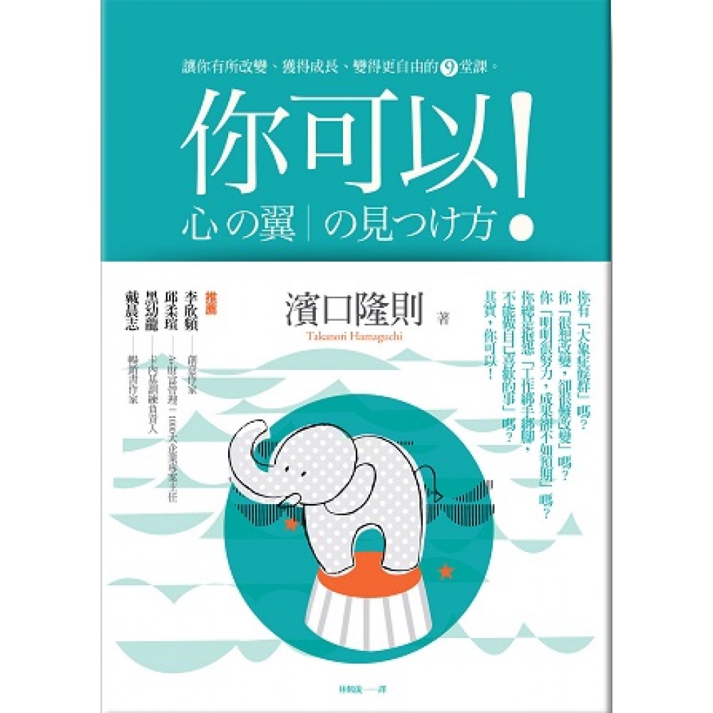 前言 第1堂課 成長不能只靠「加法」──只要丟掉成見,就能有所成長 【小故事】大象症候群 大象無法逃跑的祕密 受限於「我做不到」的成見 數千位創業家教我的事 越聰明的人越做不到 障礙來自於成見 常識不見得正確 「不增加」就無法成長的成見 人生的「守、破、離」 第2堂課 不要再說「我做不到」──遇見真正的自己 【小故事】關上自己的門 因為太過重要,所以不敢面對 不去做怎麼知道做不到 別急著為自己踩剎車 熱氣球法則 小時候的自畫像 重新繪製人生的設計圖 第3堂課 不要害怕失敗──勇敢踏出新步伐 【小故事】梭魚症候群 梭魚不再追逐的祕密 為什麼夢想無法啟動 你有失敗恐懼症嗎 改變失敗的定義 不做也有風險 【小故事】自行創業的挑戰 待在挑戰者的身邊 不對沮喪的自己失望 第4堂課 工作也可以是快樂的──只要樂在工作,人生就會轉變 【小故事】大人的背影 「因為做討厭的事才能拿到錢」的成見 討厭工作的機制 「人生有8成的時間都在做討厭的事」,這樣好嗎? 工作是人生的一號瓶 恰恰相反的人生 【小故事】小公司社長教我的重要的事 報酬與什麼成正比? 玩樂於工作的人 工作教我們獲得幸福的方法 第5堂課 運氣掌握在你手裡──把運氣變成盟友 【小故事】下雪也是自己的責任 成為潛水艇,而不是衝浪者 檢測成功度的量尺 與成功度成正比的東西 諸事不順時的良方 認為「無法掌控運氣」的人不會有工作上門 人生最大的損失 別人會看到你的決心 什麼是邁向成功的人所擁有的「自我效力感」? 在生活中散播幸福的種子 第6堂課 不要怕錢髒──從金錢問題獲得自由 【小故事】冷凍人看到的無錢世界 錢與自由的關係 再次定義錢 我們真正交換的東西 討厭錢的意思 獲得金錢自由的瞬間 第7堂課 別怕擁有個人特色──如何選擇有個人特色的生活方式 【小故事】脫掉領帶才明白成功的真正意義 「做和別人不一樣的事是不好的事」的成見 「變得無法做喜歡的事」的機制 為了擁有個人特色的「守、破、離」 個人特色與做輕鬆的事不太一樣 【小故事】放棄N倍大未來所見的股票上市 第8堂課 誰說「不成功就不幸福」──馬上就能擁有幸福 【小故事】幸福之神 在尋找幸福的路上迷路的理由 「必須費盡千辛萬苦才能獲得幸福」的成見 幸福騎在成功背上的幻想 越努力的人離幸福越遙遠的理由 【小故事】妻子告訴我的小幸福 第9堂課 丟掉「自己一個人獨自生活」的成見──改善人際關係 【小故事】天堂與地獄的觀摩之旅 僅僅一個差異就會改變一切 一起生活的感覺 討厭人際關係的原體驗 付出者得到的「施與受(Give and Given)」的想法 【小故事】謝謝的傳球 成功的人與持續成功的人的差異 還有一把簡易了解成功度的量尺 感謝的能力 珍惜別人才能珍惜自己 讓自我退化 結語 拋棄成見,就回純白的人生 描繪全新的自己 展開心靈的翅膀 把今天當成最後一天 跨出成功的第一步