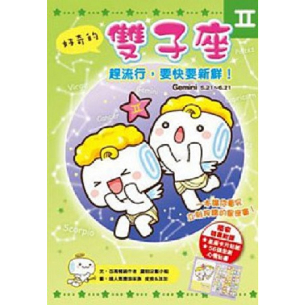 PART1 雙子誕生囉! 基本資料 雙子的神話故事 雙子關鍵10問 第1問 雙子的原始性格 第2問 雙子的愛情性格 第3問 雙子的隱藏性格 第4問 雙子最愛做的事 第5問 雙子最害怕的事 第6問 雙子最得意的事 第7問 雙子最痛恨的事 第8問 雙子最在乎的事 第9問 雙子最快樂的事 第10問 當雙子遇到12星座,用這招! PART2 雙子X血型 A型雙子 B型雙子 O型雙子 AB型雙子 PART3 雙子X12星座人際PK賽 雙子★白羊 步調一致心意相知 雙子★金牛 快快慢慢的微生活 雙子★雙子 情誼深厚的雙胞胎 雙子★巨蟹 在善變中感受微妙 雙子★獅子 善變者和王者風範 雙子★處女 多變謹慎的小清新 雙子★天秤 相處起來自在舒服 雙子★天蠍 當好奇遇到神秘時 雙子★射手 又是對立又是一致 雙子★摩羯 上演和諧包容戲碼 雙子★水瓶 看似相同卻又不同 雙子★雙魚 需付出才能有收穫 PART4 雙子X12星座愛情派對 雙子★白羊 愛意一發不可收拾 雙子★金牛 包容與依靠的配對 雙子★雙子 多姿多彩的組合體 雙子★巨蟹 有奇妙感應的一對 雙子★獅子 氣勢非凡的浪漫人 雙子★處女 遊走於完美與變化 雙子★天秤 浪漫新鮮的相愛者 雙子★天蠍 風吹水動魅力吸引 雙子★射手 遊走在極端的組合 雙子★摩羯 享受那種曾經擁有 雙子★水瓶 領導潮流的時尚配 雙子★雙魚 一時觸動難以長久 PART5 雙子之最 雙子之最1 應變力 雙子之最2 社交力 雙子之最3 求多不求精 雙子之最4 機智靈活 雙子之最5 領悟力 雙子之最6 理智 雙子之最7 好奇心 獨家附贈── 超搶手「星座卡片貼紙」 全新「56張獨家心情貼圖」