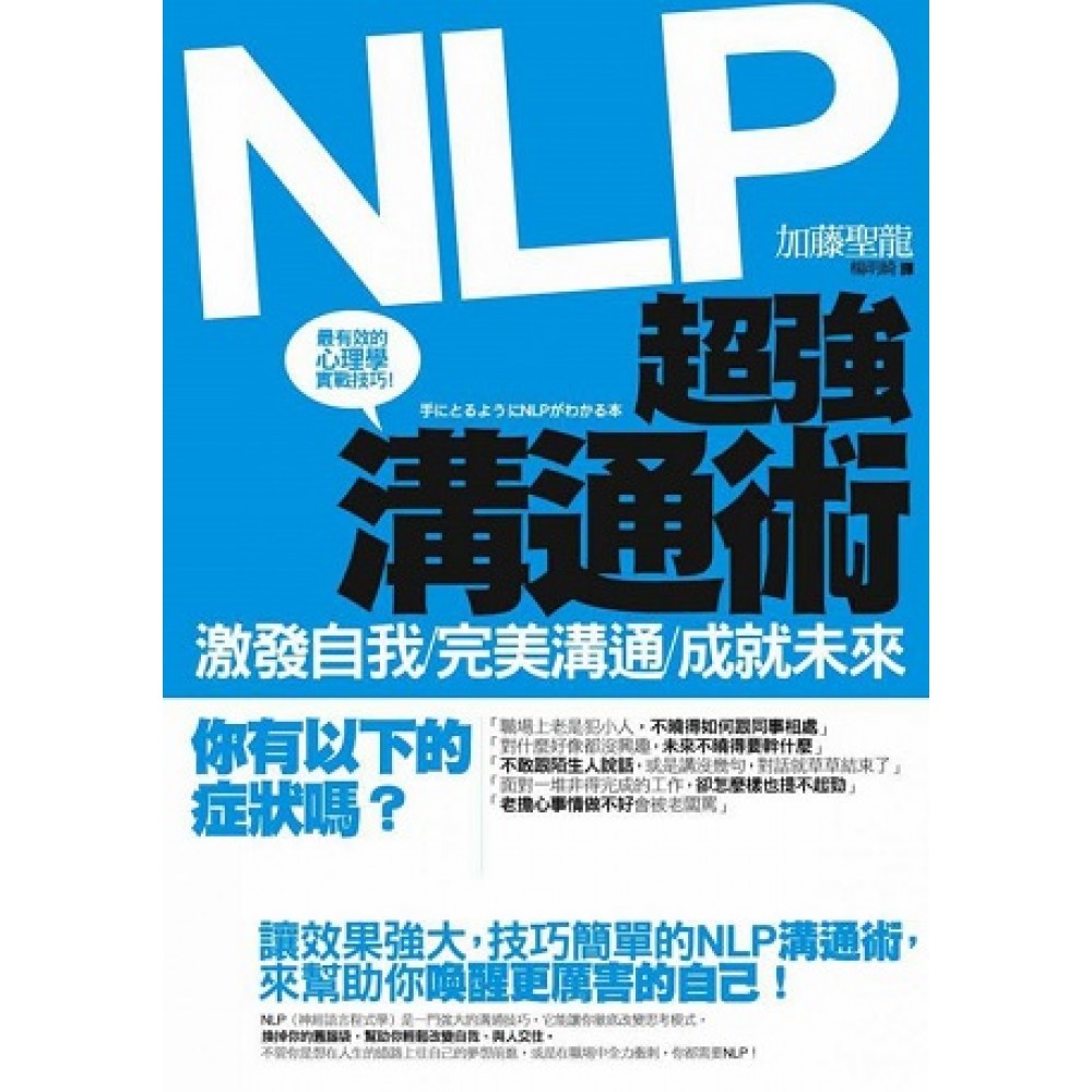 達成夢想的祕密,就在活用NLP! 最強最有效的NLP溝通術,讓你活出自我,創造更美好的人生! 你有以下的症狀嘛? 「職場上老是犯小人,不曉得如何跟同事相處」 「對什麼好像都沒興趣,未來不曉得要幹什麼」 「不敢跟陌生人說話,或是講沒幾句,對話就草草結束了」 「面對一堆非得完成的工作,卻怎麼樣也提不起勁」 「老擔心事情做不好會被老闆罵」 最有效的心理學實戰技巧,幫助你換掉你的舊腦袋,輕鬆改變自我、與人交往。 NLP(神經語言程式學)是一門強大的溝通技巧,它能讓你徹底改變思考模式,不管你是 想在人生的道路上往自己的夢想前進,或是在職場中全力衝刺,你都需要NLP! NLP能讓你 和討厭的自己說再見! 時時充滿幹勁,面對困難不再逃避! 化危機為轉機,輕鬆擺脫棘手問題! 即使跟陌生人說話,也像和老朋友相處一樣輕鬆愉快! 面對大家時,能侃侃而談,充滿自信! 在NLP中,有效果比有道理更重要! 本書作者加藤聖龍,為通過美國NLP協會認證的執行師,主張「NLP能發揮效用才有意義」 的他,用最簡單易懂的說明,教你活用NLP。 在NLP中,你不需要瞭解艱澀的NLP理論,不需要背誦NLP技巧,只要依照本書簡單易懂的 說明,就能輕鬆活用NLP,讓你發揮NLP的強大效果。