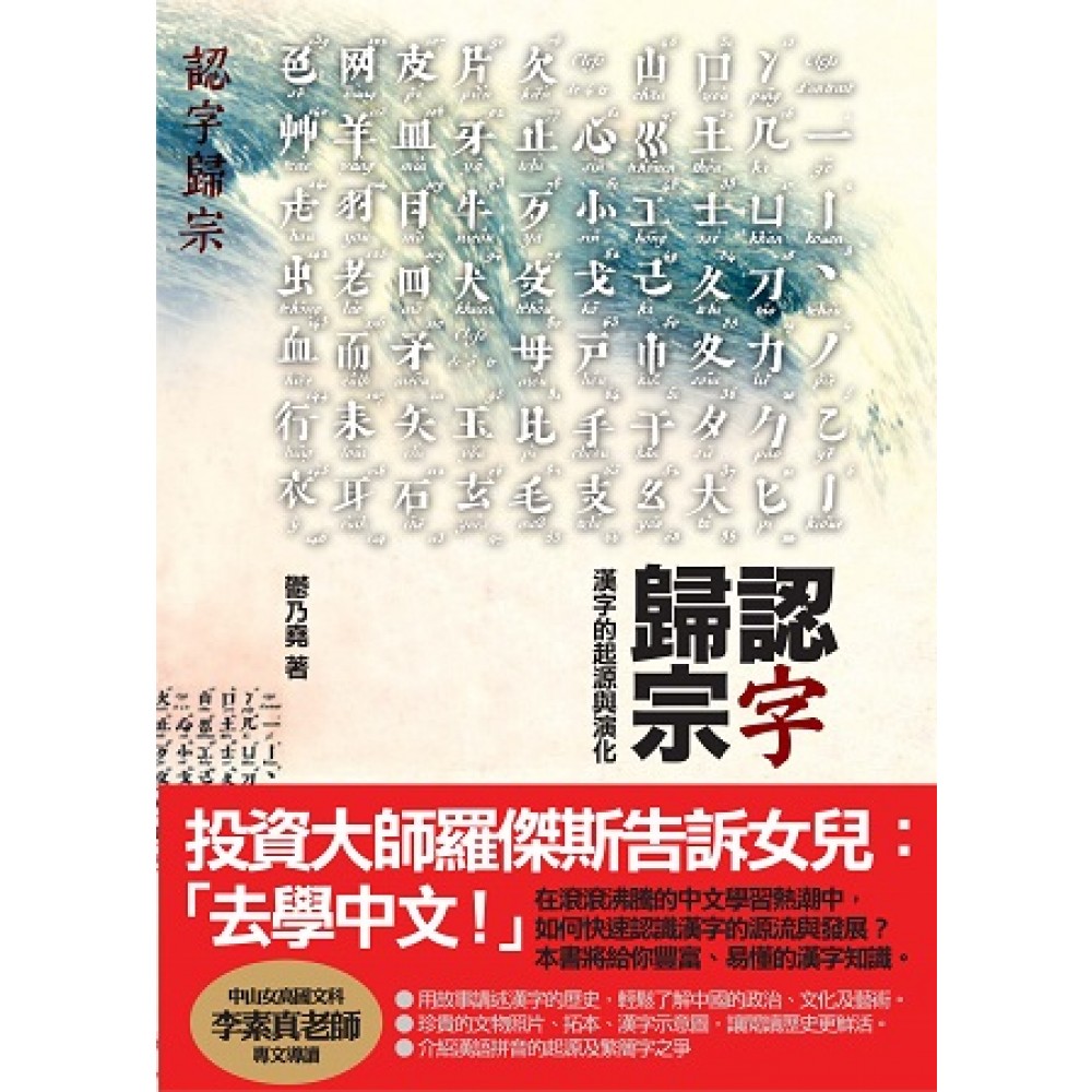 第一章 漢字的起源 先民崇拜的圖騰及八卦符號,就是漢字的發源 第二章 漢字的發展演變 商朝的從占卜發展出文字,周朝的文字是記錄戰爭,秦王統一中國文字 第三章 漢字中反映出的古代生活 中國字如「食」、「家」、「塵」都充份反應出古代人的生活 第四章 奇妙的漢字六種造字法 象形、形聲、會意、指事、轉注、假借,用有趣的例子示範這六大原則 第五章 漢語拼音的由來 目前台灣還在為使用漢語或通用拼音吵的沸沸揚揚,那漢語拼音是 怎麼來的呢 第六章 漢字繁簡字體的爭議 簡體字其實起緣是草書,早在一般民間流傳,但是成為官方文字,衍生許多問題 第七章 漢字的回顧與發展 日本、韓國、越南……都是受漢字影響的國家,而漢字在未來影響力越來越大
