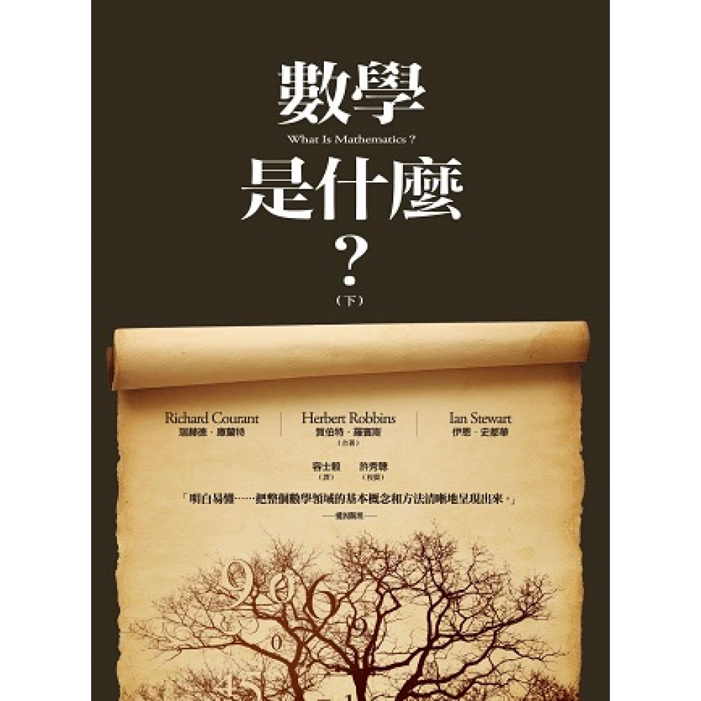 美國排名第一 紐約大學數學科學研究所 創辦人瑞赫德.庫蘭特送給高等數學人才 一本從代數到微積分的系統性數學學習書 1941年出版至今,仍在Amazon.com獲得4.5顆星好評 《數學是什麼?》(What is Mathematics?) 是一本為初學者和學者、學生和老師、哲學家,和工程師而寫的數學名著。自1941年出版以來就得到包括愛因斯坦、赫曼.外爾 (Herman Weyl) 等一代科學大師在內的一致推崇。兩位原作者如今都已辭世,不過後繼有人。1996年在著名數學家伊恩.史都華手中把原著中多個相關的數學主題帶到切合當前的發展水平,因而有現在的第二版。通過平易近人,引人入勝的描述,這部閃爍出兩代作者才華的鉅著,把「反映出人類積極的意志,深思熟慮的推理,以及在美學上盡善盡美的祈求」的數學世界,栩栩如生地呈現在我們眼前。《數學是什麼?》文情並茂地給我們報導了一個非凡的故事,為我們對數學的瞭解打開了一扇窗。