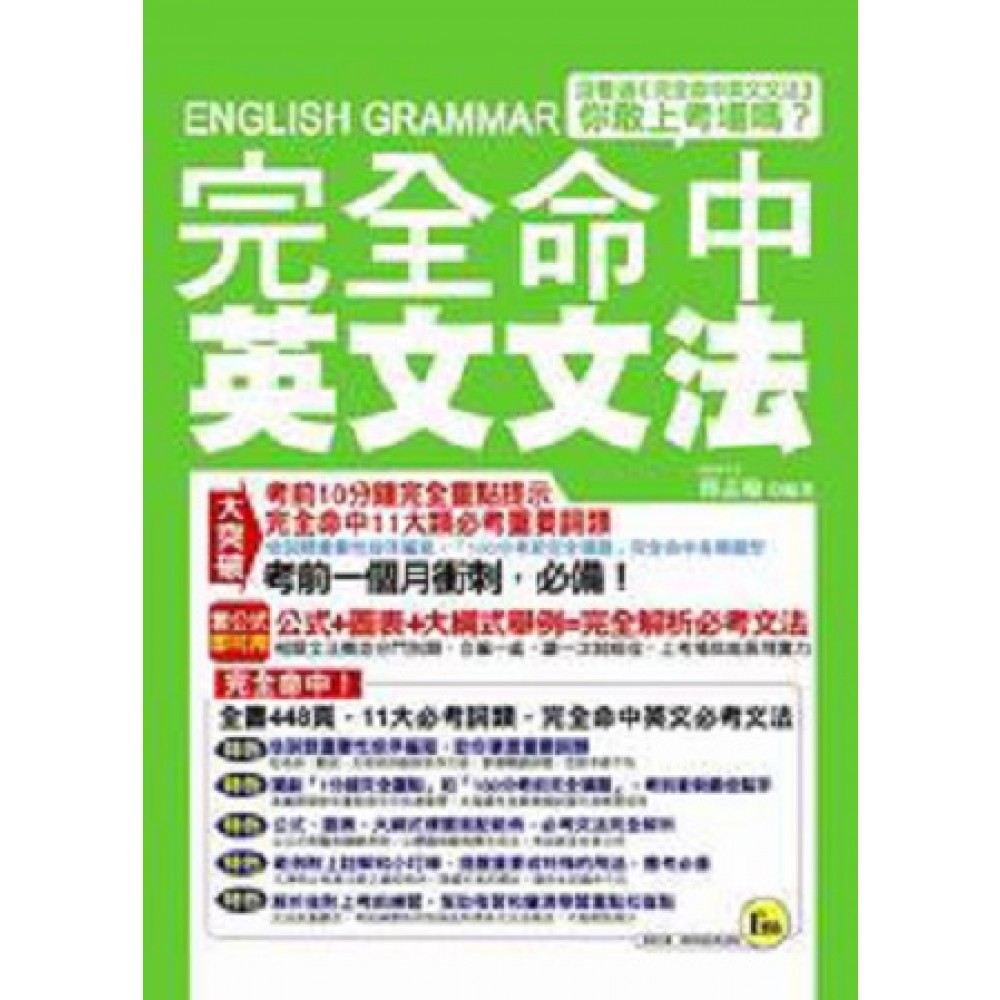 完全適用於國中基測∕大學學測和指考∕全民英檢∕多益TOEIC∕托福TOEFL∕各類英檢考試! ? 獨創考前10分鐘完全重點,單元重點提示兼考前10分鐘快速複習 《完全命中英文文法》的每個單元皆有一分鐘完全重點,考生在準備考試時,可先了解每個單元的文法和考試重點,在考試前只要花10分鐘快速複習,就能再次加深、鞏固學習效果,上考場必能發揮到完美境界! ? 將11大必考詞類依重要性按序編寫,助你完全命中重要詞類 《完全命中英文文法》將名詞、代名詞、冠詞、動詞、可單獨使用的助動詞、假設語氣、準動詞、形容詞和副詞、介系詞、連接詞、數量詞共11大必考詞類依重要性編寫,掌握名詞、動詞、形容詞和副詞等關鍵詞類,保證你先馳得點、取得高分! ? 100分考前完全猜題,百分百完全命中各類題型,考前一個月衝刺必備 《完全命中英文文法》在各單元之後,針對文法和考試重點,設計出全真模擬試題,內容有難有易,涵蓋各類考試題型和各種出題方向,考生不僅可用來測試自身的文法觀念完整度,更可用來當做考前一個月衝刺的最佳工具! ? 公式、圖表、大綱式標題搭配範例,必考文法完全解析 《完全命中英文文法》以文法準則化為各式簡易公式,將文法觀念化為各式清晰圖表,以條列化的大綱式標題呈現各項文法重點,並將相關文法概念分門別類、合編一處,另搭配生活化的範例說明各項文法準則的用法。完整的文法解析保證你一看就懂,公式更可隨考隨用! ? 範例附上註解和小叮嚀,提醒重要或特殊的用法,應考必備 《完全命中英文文法》在範例之後附上註解,提醒考生各項文法準則的重要之處,也隨處附上小叮嚀,同樣以「公式 + 圖表 + 大綱式標題」的方式,提醒考生例外或特殊的用法,保證你不會錯過任何的文法細節,應考將能越考越順! ? 完全解析後附上考題演練,幫助複習和釐清學習重點和盲點 《完全命中英文文法》在完全解析一至多條文法準則後,為考生附上相關的考題演練,讓考生可隨時隨地檢測學習成效,即時複習學習重點、釐清和加強不熟悉的盲點,直到將全數題目答對為止。做過考題演練,保證你更有勇氣接受更難的挑戰!