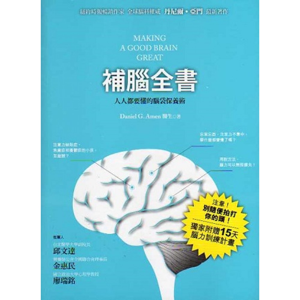 PART I改變你一生的補腦9大常識 1 你做的每一件事都和腦有關 2 當腦部運作得當,你也表現得宜 3 腦部是宇宙中最複雜的器官 4 腦部非常柔軟,裝在非常堅硬的顱骨裡 5 你的腦部健康嗎? 6 並非所有人都適用同一把尺 7 沒有看到,你怎麼會知道? 8 沒錯,你可以改變你的腦、改變你的人生! 9 完美腦部的迷思 PART II今天就開始「補腦大作戰」 10 保護全家人的腦 11 吃得對,才會想得對 12 鍛鍊腦部 13 為腦運動 14 協調腦部 15 腦與性 16 改善真實 17 給腦袋唱首小夜曲 18 撫慰腦部 19 常保腦部年輕 20 給神經細胞加把勁 21 尋求更多協助 附錄:為什麼要做SPECT 補腦關鍵詞