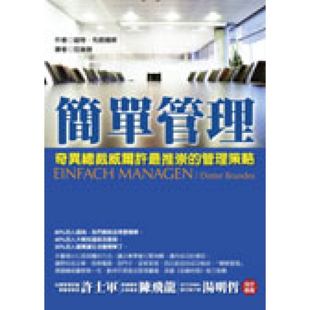 80%的人認為,我們應該活得更簡單, 40%的人大概知道該怎麼做, 20%的人確實讓生活變簡單了。 本書提出七項具體的方法,讓企業學會化繁為簡,邁向成功的捷徑。 國際知名企業:奇異電器、西門子、宜家家居、西北航空的成功秘訣:「簡單管理」 管理學的超級暢銷好書! 榮登德國暢銷書榜第一名! 英國金融時報強力推薦! 獲選歐洲年度最佳管理書籍! 已獲選誠品好讀介紹,以及誠品主打新書--79折推薦!~ 經濟日報副刊8/20(週日)主題書摘半版報導 今週刊8/17(週四)主題書摘精采介紹,中廣、New98等媒體將特別介紹此書! 台灣管理評鑑學會理事長許士軍、台大EMBA首任執行長湯明哲、南僑集團董事長陳飛龍 共同寫序推薦