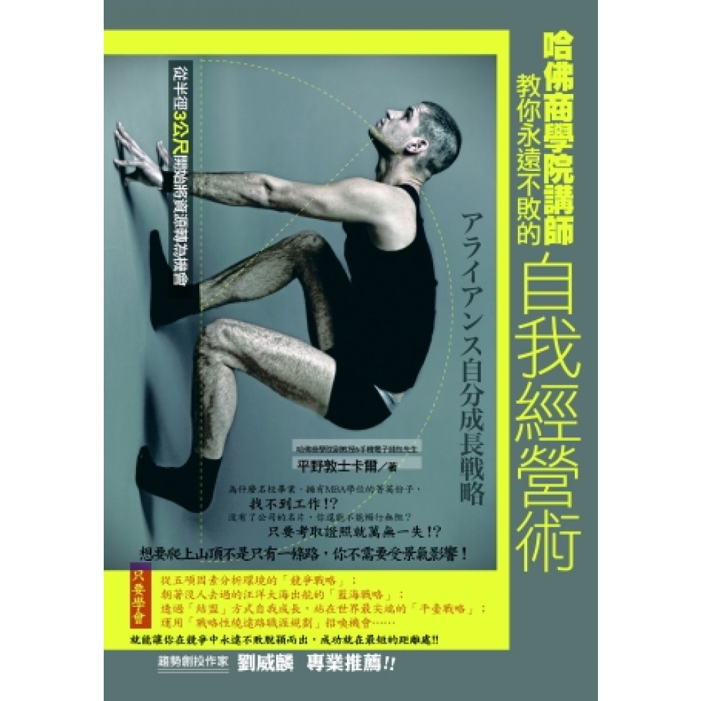 如果一個人能把自己當企業、當品牌來經營,那麼就沒有不成功的道理! 教你最省力、最快速的不敗成功法則!透過「結盟版『自我成長』戰略」跟著企業一起增加收益! 在不景氣中不用跳巢、換跑道、自己開店、開公司當老闆,就能年薪增加、收入提高!? 被譽為「手機電子錢包先生」的哈佛大學副教授平野敦士卡爾,顛覆傳統的職場成功法則,告訴你名校畢業、MBA學位、考取證照不再是成功方程式;只要你懂得「結盟」,從半徑3公尺的資源開始,就能在競爭中脫穎而出。 【作者個人的親身成功實證】 ‧從日本興業銀行跳槽到NTT DOCOMO公司(日本第一大電信公司)。 ‧提出「手機電子錢包」企劃案,歷經4年來的艱苦奮鬥終於成功普及市場。 ‧企劃風險投資案,4年內,成功賺取100億日幣的收益。 ‧成為資訊科技創投企業的經營階層,當上哈佛商學院的講師,以及在沖繩大學大學院擔任教職,同時經營一家諮詢公司。 這並不是我所規劃的人生,我的人生擴大到超乎自己想像的範圍,現在我每天充滿期待地工作…… 能夠實現自己真正想過的人生者,要比任何人來得幸福, 同時也代表真正的成功!! 【推薦】 趨勢創投作家 劉威麟 熱情推薦這本書!! 上班族如何不受景氣影響,收入提高、擁有職場競爭力?個人品牌的時代來臨,如何在競爭的環境中,讓自己與眾不同脫穎而出呢?想要爬上山頂不是只有一條路,你不需要受景氣影響!只要學會──從五項因素分析環境的「競爭戰略」;朝著沒人去過的汪洋大海出航的「藍海戰略」;透過「結盟」自我成長,站在世界最尖端的「平臺戰略」;運用「戰略性繞遠路職涯規劃」招喚機會…… 只要運用這一本實用的職涯教戰書,同時獲得【個人&企業】經營成功戰略! ◎「自我成長」結盟戰略 期間→長期性。 做法→運用周遭人脈,成為自己的助力。 對於目標→充滿彈性,卻是在繞遠路的過程中走一步算一步。可延伸個人的可能性。 職涯規劃→「繞遠路職涯規劃」。 「結盟版『自我成長』戰略」就是既可決定努力的方向,且能提高自身能力,向周遭的人展現,讓時勢助自己一臂之力的戰略。 ◎從五項因素來分析環境,在競爭中脫穎而出~競爭戰略~ ①新加入者~新加入者指的是強而有力的新人或轉行的人。 ②競爭業者~相當於競爭對手。 ③替代品~旗鼓相當的公司外人士。 ④購買者~相當於雇主或客戶。 ⑤供給商~難以取得的證照、資訊以及人脈。 ◎個人要戰勝競爭的三大必備戰略(以「競爭戰略」為基礎,開始制定具體的戰略) ①成本領先戰略~就算薪資再怎麼低廉,還是能展現出超乎薪資的「價格性能比」(Cost / Performance)。 ②差異化戰略~什麼是只有你才能夠勝任,只有你才能夠展現出色成果的工作?不管環境出現發生變化也能夠生存下去、成為擁有他人所缺乏的品牌力最重要的因素。 ③集中化戰略~以「差異化戰略」為基礎,凸顯出你的價格性能比愈高、愈能運用優勢一決勝負的特色,如何獲得高度評價這一點上。 ④「平臺戰略」~即使是一個人辦不到的事,也可以向周圍討救兵,借助眾人的力量加以實現的戰略。 ◎目標成為無人能敵的ONLY ONE──活用「藍海戰略」 ①著眼於既有客戶以外的顧客 著手展開新工作的事例,例如「週末創業」。 ②思考六種布局 ◇調查替代產業~為何自己創造的「價值」,他人也能夠辦得到呢? ◇調查業界中與自家公司採取不同戰略的公司~著重於「究竟自己與工作幹練的同事A有什麼不同?」這一點來思考。 ◇著眼於購買者~請試想除了現在所在公司的上司之外,自己能否對隔壁課的課長以及客戶有所貢獻?並試著思考你的新任上司為何種人物,這些都是近在身邊的例子。 ◇調查具備補強功能的商品~不光是自己的評價,同時也需試著想想你的下屬、客戶以及人脈等受到何種評價。 ◇針對機能取向與感性取向進行逆向操作~舉例來說一般銀行員總給人嚴肅的印象,因此若能給人充滿幽默且開朗的獨特印象,就是一種逆向操作。 ◇預測將來的趨勢~好比對負責籌劃公司社刊的人而言,隨著公司內電腦的普及化,社刊逐漸被電子郵件所取代,因此工作內容可能會有大幅的改變。 ◎「戰略性繞遠路職涯規劃」兩項重點 ①擁有兩種以上的擅長領域~擁有特別擅長領域者,比較容易招喚機會。由於容易分派工作的人可累積各種工作經驗,因而能夠提昇自己的能力。同時在這過程中,也能夠磨練自己的擅長領域,並增加其他擅長領域,當然也就更容易分派工作,如此而形成良好的循環。應該以擁有兩種以上達到某種程度的擅長領域為目標。只要具備兩種以上的擅長領域,就能提昇獨特性,馬上減少許多競爭對手。 ②透過時常告知他人自己的理想以及喜歡的事物,來吸引資訊及人脈~若能某種程度地瞭解自己的理想以及所喜歡的事物,並對周遭的人發出訊息的話,很容易就能招喚機會。為了能夠獲取所需的資訊、受到周遭人的讚賞,即便是瑣碎的工作也要盡全力達成,自然就會一點一滴地出現成果。這麼一來,隨著不斷地累積出「信賴」,然後就會慢慢出現所需的資訊。 ◎找到自己擅長領域,發揮長才的五大步驟 STEP1~想像「將來想做的事」、「未來自我的理想藍圖」 STEP2~製作現在自己的履歷表(運用「心智圖」來製作) STEP3~清楚了解自己的專長與興趣 STEP4~歸納自己的擅長領域、確定方向性 STEP5~充分活用既定的擅長領域 A~首先