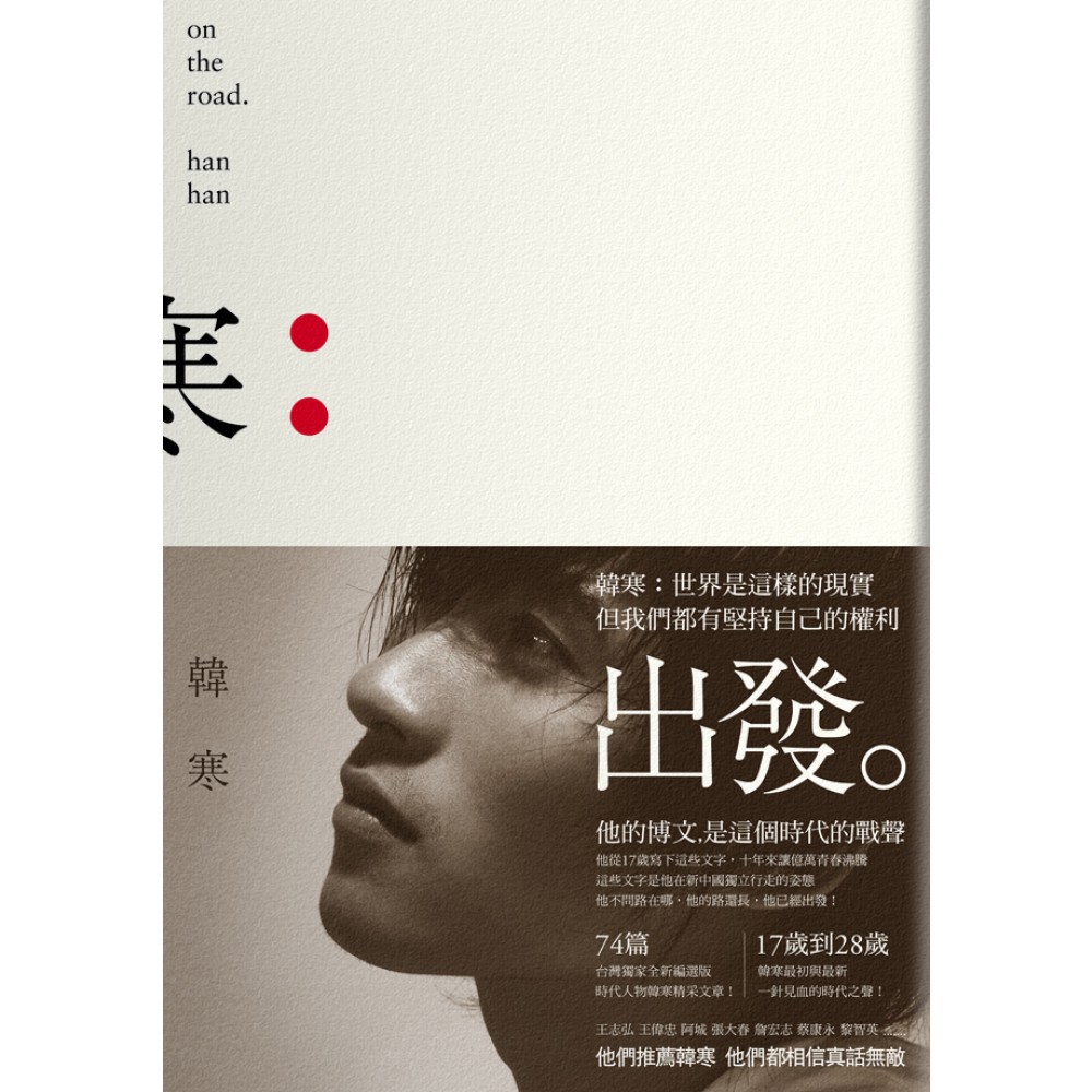 世界是這樣的現實, 但我們都有堅持自己的權利。─韓寒 一針見血的時代之聲,韓寒文集第二彈──《出發》 王偉忠、詹宏志、蔡康永、黎智英 他們都推薦韓寒,他們都相信真話無敵! 他的博文,是這個時代的戰聲。 他從17歲寫下這些文字,十年來讓億萬青春沸騰 這些文字是他在新中國獨立行走的姿態 他不問路在哪,他的路還長,他已經出發! 全新編選版,台灣獨家收錄76篇韓寒精采文章: 「我是那第三個人,我始終堅守我的風格。」 ──二○○○ 「一個人的獨立精神,如果是就靠幾本書撐著,那是多大一個廢物啊!」 ──二○○三 「愛情這東西,死活是個死,生活這東西,死活都得活,這兩個東西一湊合,只能折騰得半死不活。」 ──二○○六 「以前政府做事,從來不問民意,現在政府做事,自己製造民意。」 ──二○○八 「只有以暴制暴,對非法執法的人員動用一切法律允許的工具進行自衛和反抗,這個國家才有文明執法的希望。」 ──二○○九 「一個對內不能和平遊行的民族,他的對外任何遊行是完全沒有價值的,那只是一場集體舞。」 ──二○一○ ◆ 學生韓寒/從教育出發 韓寒未完成高中學業,自嘲初中畢業。因為身處求學階段,他發表了各種「獨立」於教育體制以外的文字,他求學階段完成的創作,從上到下、由裡到外,把每個科目,學生老師學校全都細數一番,亦可解讀成是他的教育觀。「學生韓寒」收錄這一系列吹皺文壇及教育界的經典創作,正可說是韓寒博文的前身。 ◆博客韓寒/從網路出發 2005年在互聯網(internet)登記專屬博客、發表博文,挾著其犀利文字風采,再闢網路這一新戰場。這時期的雜文多觸及生活大小事,書寫生活也聊聊賽車。而此時的他,正是〈青春〉一文筆下的年輕人,滿懷熱血著想要認識這個世界。後與白燁之間的現代詩之筆仗,網史稱「韓白之爭」引爆文壇超級熱烈話題。「博客韓寒」看到韓寒大膽、實驗地利用網路為發聲媒介,一股蛻變為「意見領袖」的力道,蓄勢而發。 ◆敏感詞韓寒/從影響力出發 無數次筆戰的韓寒,累積了數以億計的支持者,將韓寒的發言聲勢抬升至巔峰。甚至有學者斷言:「中國若打算關閉韓寒的博客,恐出大亂子。」韓寒自2007年末起,轉以公民身分自居的從容視野,談國際及國家現勢。「敏感詞韓寒」收錄受推舉為其鼓舞撼動人心的文字篇幅,內容一針見血,讀來酣暢淋漓,中國當局為此多次刪文,韓寒成了敏感詞。