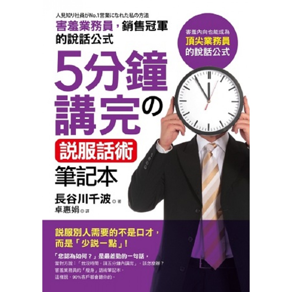 長話短說,才是最棒的說服話術。 當對方說:「我沒時間,有話快說」,你該怎麼表達? 瘦身後的精簡話術,輕鬆說服9成客戶! 「個性內向,口才不好,想在職場上有好表現,應該很難吧?」培訓超過萬名頂尖業務的諮商專家──長谷川千波,用她的豐富經驗告訴你,正因為內向、口才差,才能夠變身說話高手! 作者長谷川過去二十年的職業生涯,都在中央出版及其集團公司的業務部門服務,這家公司的業務部門工作要求嚴格在業界十分知名。不過,私底下的長谷川根本口才不好,再加上很怕生,剛開始進行電話約訪,突然打電話給陌生人時,甚至因為太緊張一時說不出話來,因而被對方怒罵;剛開始取得約訪而拜訪客戶時,也因為不知道怎麼閒聊,和等待小孩回家的媽媽相對無言一個小時!而且,還經常因為被拒絕的挫折,沮喪得不想去掃街拜訪,每個月都在最低業績標準徘徊,這種得過且過的工作心態,讓長谷川在某個月的業績掛零!就在當月的公司聚餐上,主管點名業績掛零的業務員上台,在全部同仁面前顏面掃地。 這時,她才下定決心,要脫離低業績員工的行列!她回想起剛入行時,曾看到兩位冷淡散漫的前輩,一拿起電話和客戶談話時,完全判若兩人的樣子! 長谷川更確信,「口才不好、個性內向」並不是成為職場話術高手的阻礙,工作時的說話方式,和私底下一定不同! 只會死背話術,或者為了「講贏」客戶、讓對方接受自己的行銷而長篇大論,不僅是沒自信的表現,也讓客戶降低購買意願。遇到擺明了「我沒時間,你快點說!」的客戶時,懂得用最短的時間,說服對方接受你的話,才是頂尖的職場話術高手!長谷川克服了大眾的既定印象:「開朗外向的人在職場上比較吃香」,無論是誰,只要掌握精簡話術的技巧,都能運用5分鐘講完的說服話術,讓9成客戶願意買單! ▲打造克服害羞怕生的面具,你應該這樣做! ◎是「不適合」,還是「努力不夠」,你得自己想清楚 業績能交出亮麗成績單的人,一定具有天生的性格特質或才能?不一定!業務員面對客戶時的樣子,未必就是他真實的面貌。業務都有一張面對客戶時的「專業面具」,天生的個性無法說改就改,但是補足業務面具不足的部分,後天的努力絕對可以辦到。 ◎用「原本的自己」,絕對無法吸引客戶 正因原本的自己不善交際、內向,很容易被誤解為冷漠、難相處;頂尖業務員與客戶談話時,會帶入有表演成分的抑揚頓挫和情緒,自己認為稍微誇張的說話方式,跳脫了平鋪直述,客戶聽來也生動得多! ◎「專業的推銷話術」,其實還不夠! 把制定的話術背得熟練、專業,其實還不夠!想成為推銷高手,就必須以「不要流於職業化,自然地說出來」這個階段為目標。客戶才聽到寒暄,就先對你築起「這是業務員推銷」的戒心,表示話術練習得還不夠。 ▲要提升溝通能力,一定要做筆記! ◎做筆記,才能回顧現場關鍵細節 向主管報告用的日誌,難免在書寫時會加以粉飾讓報告比較「體面」。但是略過不提失敗、不足處,永遠不會成長。為了事後更清楚地回想細節,記錄下現場氣氛和客戶反應,才能掌握成交的關鍵點。 筆記紙用一張A4紙,兩色書寫:推銷前的沙盤推演用黑筆,拜訪結束後用紅筆補充。 不要用錄音,立刻寫下來:錄音能夠確認的,只有麥克風收錄的聲音,對方的表情及周遭旁人的反應等,非語言的部分都難以確認。 ◎用筆記回顧加強記憶,磨鍊溝通能力 腦子裡思考的東西,不至少回顧一次,就很容易遺忘;沒時間當天回顧細節,就寫下筆記慢慢回想。這麼一來就能夠在事後反覆推敲狀況,磨鍊推銷技巧,在之後的商談中反應變快,迅速做出最佳反應。 ◎失敗的原因不在「沒做的事」,而是「做了的事」 筆記時,要以第三者的角度,更客觀地觀察自己;把重點放在整體的狀況上,找出容易錯失的細節,如客戶的表情、用詞、動作等等,比起「做了不該做的事」,更多的情況是有太多「忽略或沒做該做的事」。 ◎成交的關鍵,就在談話細節裡 詳實記錄拜訪過程,除了加深印象之外,最大的好處是因為有了實際的「記錄」,在日後發生類似的狀況時,能夠找到前例,避免發生相同的錯誤,日後拜訪其他客戶時更有效率。 ▲當客戶時間有限時,就用簡明有力的談話劇本 ◎長篇大論的結果通常是「被拒絕」,真的 推銷話術變得又臭又長的原因,通常來自於被拒絕的恐懼,害怕客戶對自己說「NO!」讓話術簡明扼要的主要目的,是希望能夠留給對方發問的空檔。 讓客戶提問,更能夠吻合對方「想了解的內容」,反而容易抓住購買需求。 ◎用簡明扼要的話術,馬上拉開成交率的差距 每個客戶聽取說明的時間和地點都不同,因此有必要擬定對方正在工作之際也可以進行推銷說明的方法。這時候,經過「瘦身」的簡明扼要話術就能派上用場。學會不管客戶處在什麼工作狀態中,都能巧妙地切入話題,才有利於推銷。 ◎很忙碌的客戶,通常沒空聽細節 客人愈忙碌,內容愈要精簡,切中要點,簡短地表達想說的內容,要點講完立刻切入結論。採用一問一答的話術,反而讓客戶更清楚內容。 ◎只有5分鐘可以說明,就用精簡後的話術 直接說出客戶的可獲利益,瘦身後的話術劇本如下: .三十秒內:自我介紹、表明拜訪目的、推銷商品內容。 .一分鐘內:清楚地表達客戶接受這項服務的利益。 .兩分鐘內:說明「推薦這項服務的原因」、「這項服務優異的理由」等。 .三分鐘內:提出客戶可獲利益所依據的