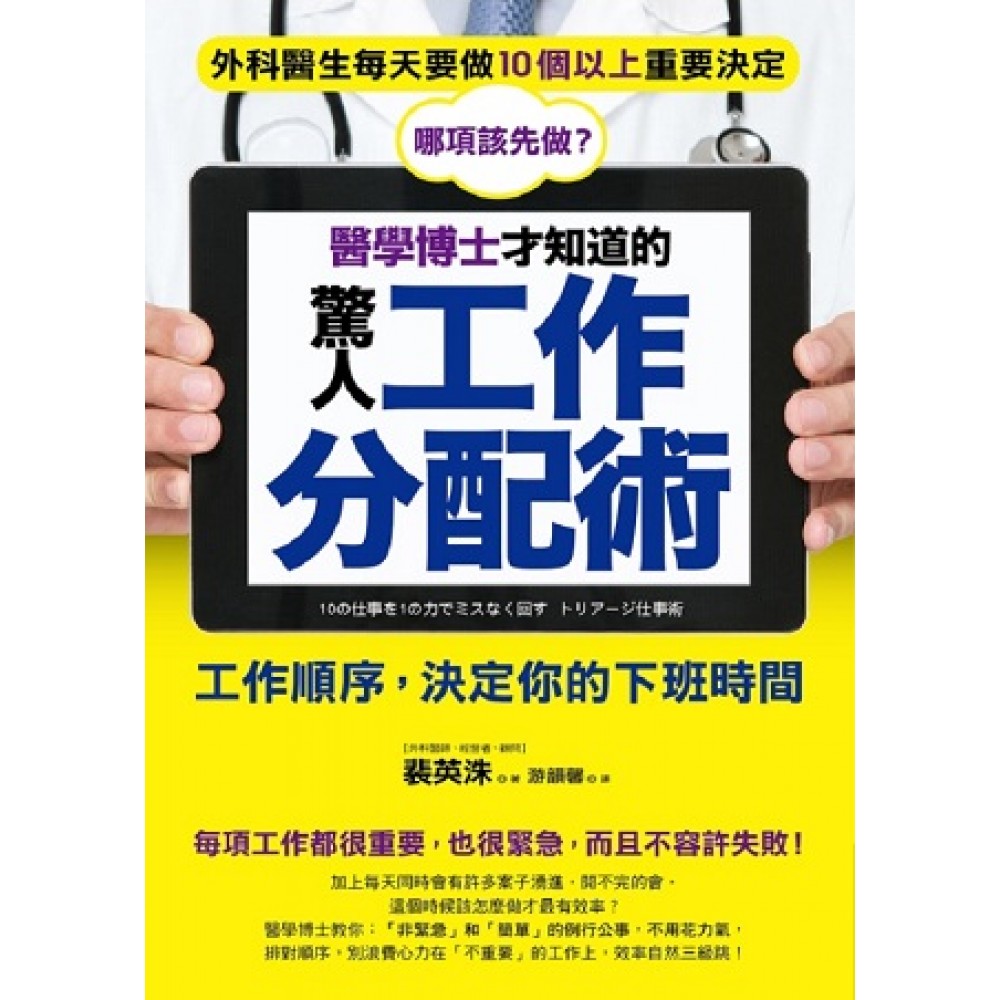 同時有10件緊急工作,先做哪一項? 優先工作的判斷標準:緊急、重要、耗費心力。 該擺第一的工作,不是最花時間,而是難度最高! ▲「例行工作」、「重點工作」、「突發工作」!全部得做好,而且要「零失誤」! 外科醫生的忙碌生活,我們只能從影集中窺見一二,特別是外科醫生,常常會碰到緊急開刀的病例,就算已經排定手術行程,還是會遇到急診病患需要動緊急手術的狀況,每天都生活在緊張高壓的情緒裡。換句話說,在執行多工處理的過程中,醫生們需要隨時變動優先順序,病患的重要度與緊急度也隨時在變。重點是,救死扶傷的工作不容許錯誤或失敗。同時,醫療工作需要團隊合作,醫生光有高超技術沒有任何意義。 把病患和手術替換成一班上班族的工作,你是否常常遇到這樣的狀況:○1手上有很多工作同時進行,必須發揮多工處理的效能;○2無法決定先後順序,就算決定了也會被迫變更;○3所有案子都是「緊急」且「重要」,不知該如何安排……而且,○4每天生活忙碌不堪,無法消除疲勞感,身心極度疲憊。 作者裴英洙身兼「醫師、經營者、顧問」三重身分,他在擔任外科醫生時,每天都要做10個以上「緊急又重要」的決定,還得同時處理突發狀況;之後他轉任病理師,每一件病例判斷都有「不能出錯」的壓力。在他研修經營顧問課程時,發現在醫療第一線或醫生執業時獲得的知識,以及擔任病理醫生時,判斷重大疾病的經驗,可以充分活用在商業界發生的「問題」上。 在面對每天的「例行工作」,和排定的「重點工作」,甚至常常會無預警出現的「突發工作」,一個人的資源和集中力有限,如何分配有限資源?如何避免浪費心力?如何有效做決定並確實執行?將是決定工作是否能夠在時間內完成(不用加班)、以及是否能將失誤率降到最低(高效率)的重點考量。 ▲擺脫忙碌與壓力生活的「三大原則」 ◎原則○1:不僅安排順序,更要保留變動的餘裕 優先順序會經常變動,當「最優先事項」突然插進來時,你必須決定要將哪一件事往後延。 ◎原則○2:每天的生活,就是為「緊急」時刻做準備 生活中的一切事物都是為了「緊急」時刻做準備,假想失敗的準備,才能隨時應付緊急狀況。 ◎原則○3:維持好的工作表現,要預防所有「失敗」 「每次的表現都是一百分」,遠比「只有一次一百二十分,其他時候只有六十分」還重要,工作最重視的就是維持一定水準。 ▲10件工作如何安排,才能做得快又好? ◎用急診室醫生的「分類術」,精準又快速 分秒必爭的急診室裡,醫生必須決定要先救誰,也要決定什麼樣的病患可以之後再救治。這個決定先後順序的方法就是「檢傷分類」。 ◎一定要學會四種分類:優先、非緊急、簡單、無法處理 四種分類的判斷基礎是「現有資源是否能處理?」如果判斷無法處理時,要當機立斷的尋求幫助。 ◎把「簡單、非緊急」的工作分派出去,準沒錯 難以決定優先事項(紅色)時,不妨先從眾多任務中選出「任何人都能處理、短時間內可以做完」,以及「可以稍後解決的問題」,簡化要處理的任務。 ▲從大盤子開始洗,即先處理「難度高的工作」 ◎不是精算「花多少時間」,而是「難度多高」 迅速從不同主軸瀏覽,不要花超過五分鐘,時間估算無需太精準,只要將重點擺在「棘手度」,概略掌握自己處理需花多少時間、是否需要他人協助、如果需要,需請多少人幫忙等所需人力就可以了。 ◎從「大規模、高難度」開始處理 當身心俱疲時,很難再提起精神處理重要工作。就算硬逼著自己去做,也很可能因為疲倦無法做出滿意成果。因此,趁著還有腦力與體力時,先完成難度較高的工作。 ◎用四大項目幫工作「打分數」,最高者優先處理 同時有好幾件「都很重要的工作」時,就用「人、物、成本、時間」的標準來考量,幫這幾個工作打分數,再依分數排出順序。 ◎「高難度、大規模」的工作,要一口氣做完 評分時可依自己工作的需求,在各項目的重要性加權,例如在絕對要遵守截止日的業界裡,時間項目要加重;若是嚴格要求成本控管的公司,則是加強成本項目的比重。 ◎突發工作出現時,先把手上的做好! 只要你已經開始做優先工作,就能沉著冷靜地處理插隊的緊急任務。「還沒開始做」和「做了1/3」的狀態,心情會有極大差異。 ▲先排除「不可能的選項」,別急著找正確答案 ◎找出可能性低的選項,排除它 先排除「不可能」或是「可能性極低」的選項,避免多花時間找「錯誤的答案」。 ◎就算排除,也要因應狀況「重覆檢視」 排除的選項不代表可能性就一定是0,因此也要視不同情況,重新檢視已排除的選項。 ◎「會思考」比「找答案」更重要 如果一開始就急著找正確答案,執行之後才發現偏離正確解答,等於花費心力在審慎研擬錯誤的解決方法,最後還是徒勞無功。 ◎掌握該捨棄的資訊,就能愈快得到解答 每天獲得的資訊量遠超過我們需要的,該如何聰明地捨棄(=排除),便成為做決定的重要關鍵。這些選項是否有用,就要看你具備多少「運用排除思考的能力」。 ※讓工作流程順暢的小訣竅!利用「三個箭頭」,畫出順序 例: 東京車站 大阪車站-----不清楚該使用哪種交通方式? 畫上三個箭頭後…… 東京車站 名古屋車站 新大阪車站 大阪車站 ----一看就知道要搭乘新幹線(電車)。 東京車站 羽田機場 伊丹機場 大阪車站 -----一看就知道要搭飛機。 →該選擇哪種處理