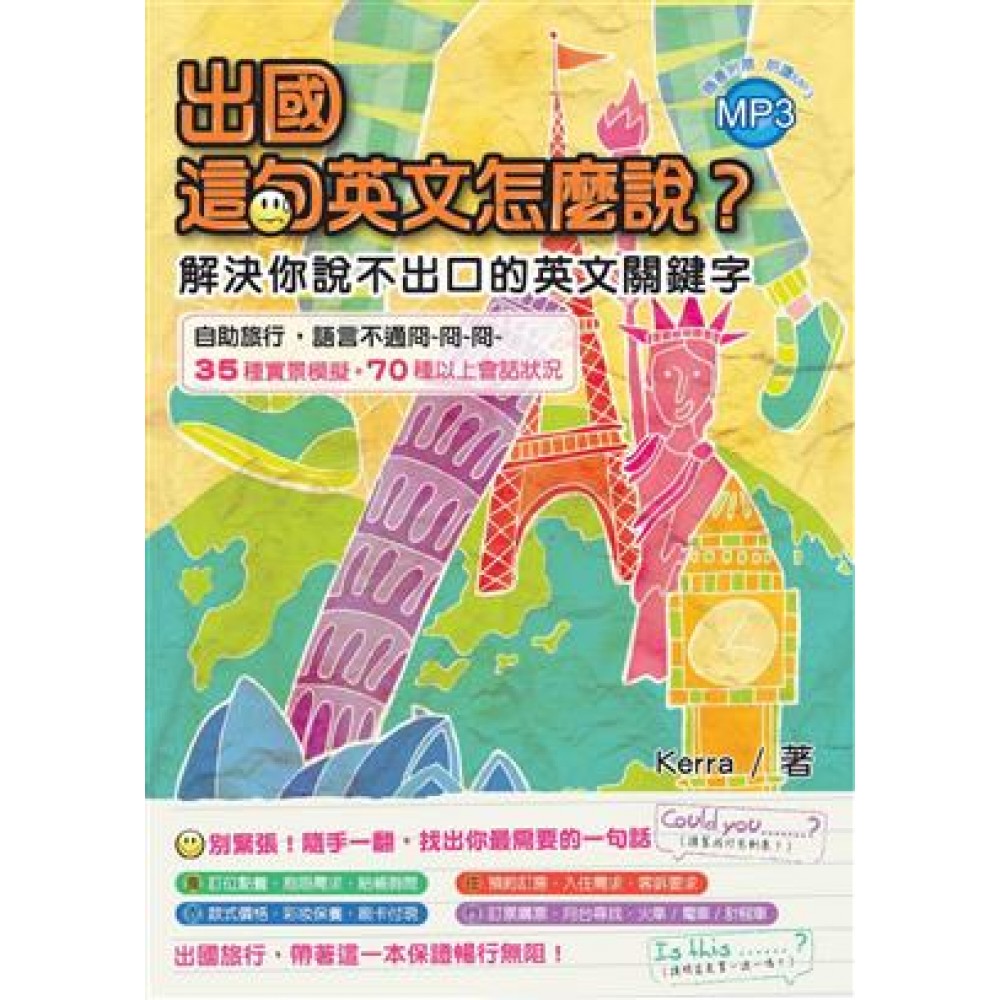 “Do you have something cheaper?" “I am so hot, can you open the air conditioner? " 這兩句話,對學中文的我們來說,合理的很,照翻起來一點問題也沒有!但聽到美國人耳裡,會變成什麼樣呢? 「你們有低級一點的東西嗎?」 「我超正的,你可以把冷氣面板拆掉嗎?」 太誇張了嗎?這兩句話,我是真的親耳聽到朋友脫口而出,也是親眼看到對方嘴角藏不住的笑意! 以前。每當有朋友到紐約玩,Kerra 一定會看到幾個狀況:握著菜單發呆、拿著想買的衣服發傻、站在櫃台前面結巴、遇到聽不懂的問題傻笑……你,是不是也碰過呢?有趣的是,這些朋友大多英文程度都不錯,有些搞不好看時代雜誌看比我還快,只是學術派的台灣學生碰到生活化的英文,常常都得舉白旗投降。 其實真的不是英文難,是台灣學的英文太難,很多生活裡最基本簡單常用的我們反而都忽略了。旅遊,美食,shopping…是認識這個世界最愉快的方式;讓我們一起讓它也變成學語言最愉快的方式吧 ! 再說,朋友們,如果在這個賺錢比什麼都難的時代都還能存到錢旅遊,我不相信這短短的幾個英文單字難的倒你 。這,不是一本教科書,我們不教你怎麼用英文,只希望在你懊惱「媽啊!這句英文怎麼說?」的時候,能幫上你的忙。 Enjoy it Kerra