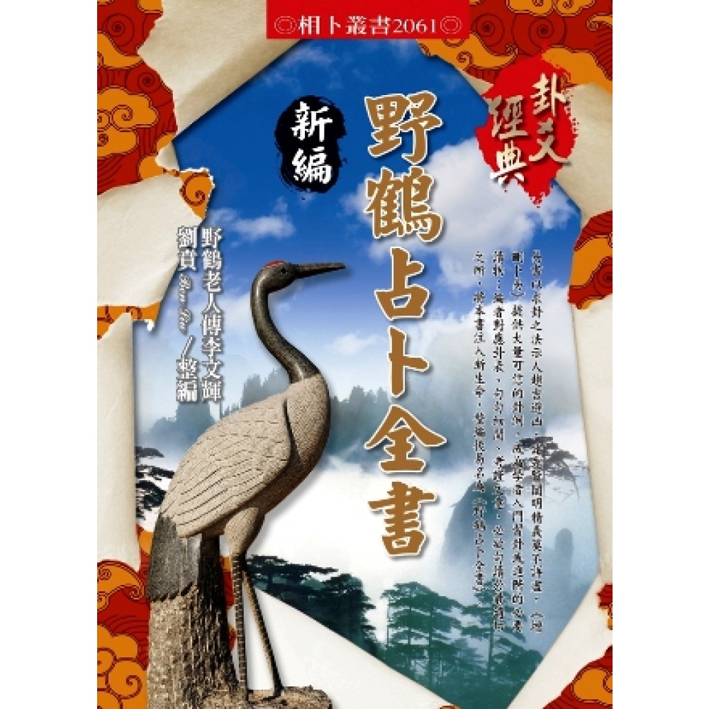 序言……整編緣起,按《增刪卜易》本是野鶴老人原著,經由李我平傳至李文輝,李文輝號覺子,以本身占例附加於原著而問世。《增刪卜易》提供了大量的可信卦例,對五行卦的推廣與貢獻不可謂不大;同時也成為學者入門習卦或進階的必要讀物;即到近年,資訊發達,習卦風氣亦成,而坊間亦多將是書重新打字排版發行者;然個中卦表排版困難,諸出版品之卦表多因陋就簡,無法一目了然;致使讀者盤旋迷蹤,多耗生命於其中,徒增浩嘆。且自《卦爻理用透析》套書出版之後,反響熱烈;進源書局林老闆即欲為《增刪卜易》注入新生命而一再敦促是書之重新整編。劉賁從善如流,勉力為之;故而對應卦表、句句細閱、考證文意,必欲句讀於最適切之所;至於所有卦例卦表,亦概依《卦爻理用透析》之同型貼附。整編後之《增刪卜易》,且名之為《野鶴占卜全書》。編者誠摯的希望整編後之全書能一新耳目,並提供教學之兩便。劉賁謹識