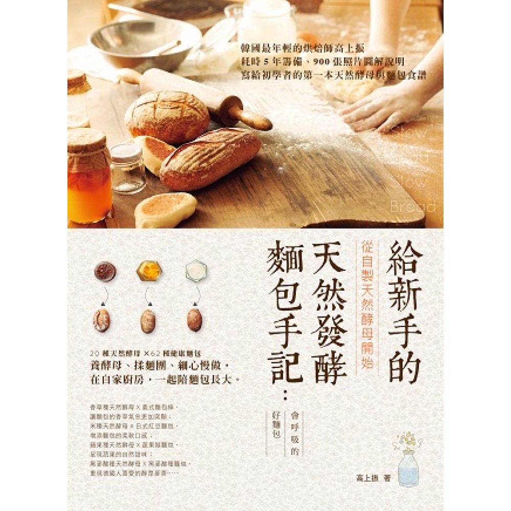 作者序 一看就懂!天然發酵麵包的製作方法 烘焙所需的材料 烘焙所需的用具 什麼是天然發酵麵包 第一章 手作天然酵母 有益的微生物群,天然酵母 在家製作葡萄乾天然酵母 手作四季天然酵母 春:草莓種 夏:番茄種、香草種、葡萄種 秋:柿子種、玄米種、蘋果種、松葉種 冬:紅蘿蔔.山藥種、香蕉種、無花果種、橘子種 四季:優格種、麥麩種、米種、Tape種、白麵粉酸種、黑麥酸種、啤酒種 第二章 製作天然發酵麵包 PART 1 清爽柔軟的基本麵包 小餐包、山形吐司、貝果、南法葉形麵包、烏茲別克饢麵包、義大利拖鞋麵包、土耳其芝麻圈、中東大餅、鐵鍋麵包、佛卡夏、農夫麵包、舊金山酸麵包、法國長棍麵包、鄉村麵包 PART 2 充滿香氣的奶油麵包 奶油麵包捲、脆皮菠蘿、菠蘿麵包、可頌、丹麥麵包 PART 3 添加內餡的美味麵包 紅豆菠蘿麵包、卡士達麵包、紅豆麵包、核桃奶油起士麵包、蔬菜鮪魚麵包、 印尼天貝麵包、咖哩麵包 PART 4 堅果穀類的樂活麵包 黑豆芝麻麵包、水果黑麥麵包、芝麻麵包、葵花子麵包、紅麴捲、三色種子麵包、黑米麵包、發芽糙米麵包、蕎麥核桃麵包、摩洛哥芝麻麵包、孜然麵包、黑麥麵包、五穀雜糧麵包、黑麥酸種麵包、啤酒麵包 PART 5 輕鬆快速的簡單麵包 美式鬆餅、恰巴堤、平底鍋麵包、黑芝麻餅乾、義式麵包棒、蘇打餅乾 PART 6 多口味的蔬菜水果麵包 藍莓棒、玉米麵包、紅蘿蔔麵包、韓式味噌麵包、蔓越莓核桃麵包、無花果麵包、葡萄乾麵包、蘋果醬糖餅、香草熱狗麵包、德國聖誕麵包、披薩、潘妮朵妮、南瓜糯米麵包、南瓜蔓越莓麵包