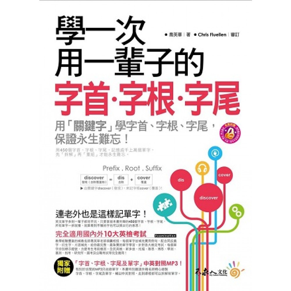 全國首創 用「關鍵字」記字首、字根、字尾! 用字首、字根、字尾記「成千上萬個單字」! 先拆解再重組,保證永生難忘! 一次搞定這一輩子要會的英文單字! 英文單字何其多,所有單字只要一拆就能懂! 英文單字多到一輩子都背不完,但是外國人都是這樣記! 只要掌握了字首、字根、字尾的原則, 看到不懂的字也可以猜出意思! ■字首、字根、字尾是什麼?就是要這樣記才不會忘! ◎ 字首(prefix):一個或數個字母或音節置於單字或字根之前,以改變其意。 ◎ 字根(root):一個單字組成的基本部分,顯示其主要意義。 ◎ 字尾(suffix):一個或數個字母或音節置於單字或字根之後,以改變其意或成為另一個單字。 demand (需要;要求) =字首 de (往下) + 字根 mand (命令) individual (單獨的;無法分割的) =字首 in (不) + 字根 divid (分割) + 字尾 ual (形容詞) congregate (集合) =字首 con (一起) + 字根 greg (聚集) + 字尾 ate (動作) ■「學一次用一輩子」的4大絕招: 1. 全球語言學家一致公認最有效的單字記憶法! 用清楚明瞭的圖表解釋超過450個最常出現的字首、字根、字尾。藉由每個單字的不同特性,迅速學會混合並運用這些記憶法則,自己破解單字涵義。運用這些記憶法則,關鍵字和衍生的上千單字一定過目不忘! 2. 獨創用「關鍵字」記字首、字根、字尾 用「關鍵字」來記憶字首、字根、字尾才能永生難忘。例:以關鍵字discover(發現),來記憶字首dis(去除)+字尾cover(覆蓋),口訣:想要發現,就要去除覆蓋物。這個方法利用了我們比較熟悉的關鍵單字discover做引導,一下字記得了字首dis、字尾cover的意思。 用「關鍵字」來記憶字首、字根、字尾是利用獨創的拆字法:「先拆解、再重組」的概念,加深單字記憶續航力,絕不會一背就忘。就算看到不懂的單字,也可推敲出其意義,單字量瞬間爆增。 3. 學習內容最豐富、最紮實! 教學經歷豐富的補教名師傾囊相授,每個單字不只搭配最實用例句,更提供最完整的同反義字、衍生字及片語補充。針對全民英檢、新多益、托福、雅思、博思、學測、基測、指考、研究所、公務員等各大檢定考試,每個單字分別標示燈號,方便考生考前複習。 4. 獨家附贈「字首、字根、字尾單字」中英對照MP3 有別於坊間只收錄單字的MP3,本書連450個字首字根字尾一併收錄,由專業美籍名師員精心錄製,輔以中文對照,保證連書本都不用翻開,就可輕鬆學會拆解單字。 全民英檢、新多益、托福、雅思、博思、學測、指考、研究所、公職等英文考試完全適用!