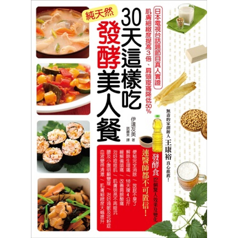 30天×3餐,照著吃,確實改善! 淨化血液+緩解頭痛+消除便祕+美肌瘦身+改善失眠+解毒抗病 2012年,日本富士電視台播出健康特集「30天發酵全餐生活」,其驚人的效果及變化,引爆了全國的話題。 這個節目的主題,就是讓三名19 到32歲的年輕女性,早中晚三餐都只吃發酵食品所烹煮的食物,最後再檢測身體的健康狀態有何變化。 沒想到,這個日本史上第一次的「發酵食品」相關實驗,竟獲得了令人極為驚訝的超級效果! 3名原本快成慢性病預備軍的女性,才經過一個月,原本混濁血液變得乾淨流暢,長年的便祕解除,肌膚也變得光滑美麗。更重要的是,明明三餐都吃美食吃到飽,到最後竟然還瘦了3-5公斤! 本書就是集結了該節目實際採用的30天詳細食譜,保證美味又簡單,同時更附上實驗指導者——營養管理師・伊達友美老師對發酵食品功能的詳細解說,讓您也能輕鬆在家「愈吃愈健康、邊吃邊瘦」,還能順帶美肌哦! ● 連醫師也不敢置信! 「30天發酵全餐生活」真人實驗的12個驚人效果 1:便秘完全消除 2:放屁不臭了 3:解除生理痛 4:18天瘦4公斤 5:緩解偏頭痛 6:消解肩膀酸痛 7:治好痘痘肌 8:肌膚明亮不再暗沉 9:腰及小腹明顯變瘦 10:治好過敏及花粉症 11:血液變得清澈 12:肌膚細緻度大幅提升 ※ 節目youtube網址 Vol.1:http://www.youtube.com/watch?v=j4-SMcKBtdg Vol.2:http://www.youtube.com/watch?v=aXH989ynhMM 醫師、專家、營養師全程檢測、記錄 日本電視台節目真人實証「30天發酵全餐生活」,其驚人的效果及變化,連醫師都不可置信,引發熱烈注目! ●宮田敬子(19歲) 體重:74.2kg→69.1kg(-5.1kg) 腰圍:87.0cm→75.5cm(-11.5cm) 肌膚細緻度:19→60(3.2倍) 肩膀僵硬:12→5(減少58%) ●大岩MARI(32歲) 體重:62.3kg→58.8kg(-3.5kg) 腰圍:85cm→76cm(9cm) 肌膚細緻度:30→40(1.3倍) 肩膀僵硬::11→4(減少63%) ●北林Tina(27歲) 體重:73.0kg→70.3kg(-2.7kg) 腰圍:79cm→71cm(8cm) 肌膚細緻度:25→45(1.8倍) 據說肌膚細緻度非~常難提升啊! 19歲那個幾乎是做雷射的效果了..... 難怪連皮膚科醫師都嚇一跳。 發酵食品最常見的就是用蔬菜水果,或是糙米、米,經由微生物進行代謝,而這些代謝出來的物質含有豐富的營養素,很多小分子可以直接吸收,對各個年齡層的人都很適合,尤其適合小孩及老人。 發酵最早是描述釀酒過程中氣泡產生的現象,是微生物利用釀酒原料中的醣類成分代謝產生了二氧化碳,並釋放到外界所造成。 發酵與腐壞都是菌種作用的結果,差別就在於發酵過程中益菌獲勝。發酵過程中的高鹽、酸性環境及發酵菌種的存在,有助於益菌生長及代謝,相對也是在抑制雜菌;益菌為了要生存,透過本身的酵素系統,將原料成分代謝轉換成其他可利用的營養物質,才會增加了原本不存在或少量存在的新營養物質,不純粹只是好吃、易吸收而已。