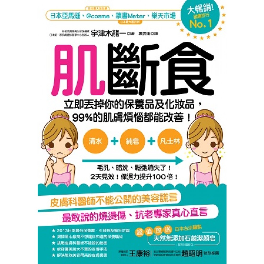 日本亞馬遜、@cosme(日本最大美妝網)、讀書Meter(日本最大書評網)、 樂天市場 大暢銷,銷售排行No.1 ★ 2013日本最夯保養書,引發網友瘋狂討論 ★揭開黑心廠商不想讓你知道的保養騙術 ★挑戰皮膚科醫師不能說的祕密 ★拆穿醫美誇大不實的宣傳手法 ★解決無效美容帶來的皮膚傷害 肌斷食: 立即丟掉你的保養品及化妝品,99%的肌膚煩惱都能改善! 清水+純皂+凡士林 人人都做得到的「極簡美肌法」,效果驚人。 毛孔、暗沈、鬆弛消失了!保濕力提升100倍! 這是一本,你非讀不可的美肌救命書! 由修復燒燙傷的專業醫療所誕生的保養法, 帶你遠離無效美妝、保養品的濫用與傷害。 ◆長達十多年的案例研究及科學臨床驗證 ◆日本近年最受注目及推崇的「極簡美肌法」 肌膚具有天然的自淨力、保濕力與修復力 不用化妝品‧不摩擦肌膚‧不過度清洗,美肌效果100% 恐怖的肌膚5大殺手 1.水份→破壞肌膚→造成乾燥問題 2.界面活性劑及油→破壞表面防護→造成毛孔粗大與發炎問題 3.防腐劑→殺死常在菌→造成敏感問題 4.摩擦刺激→傷害肌膚→造成黑斑問題 5.過度清洗→破壞表面防護→造成細紋與鬆弛問題 從修復燒傷的專業醫療所誕生的全新美肌保養,顛覆過去的美容新常識! 只需準備純皂及凡士林,無論是乾燥肌、油性肌或黑斑暗沉,全都會慢慢改善! 極簡「清水洗臉法」,激發肌膚原有的再生能力! 只要停止用粉底液等化妝品蓋住肌膚,肌膚就會一天天變得美麗。越是花大錢,肌膚狀況越糟糕……因為化妝品及保養品是妨礙肌膚原有再生能力的最大兇手。 作者身為專業抗老醫學先驅,某天忽然發現在自己漫長的治療經歷中,竟然從未發現肌膚細滑度(texture refinement,肌膚檢測標準之一) 超過80%的女性,讓他不禁愕然。他深入研究原因,發現問題出在化妝品及其使用方法之上。 原本肌膚就擁有完整的修復及再生機能,一旦用外力強迫給健康肌膚補充水份及油份,就會因熱能、摩擦及化學刺激,破壞肌膚表皮,讓它失去原有的防護功能。而化妝品對肌膚來說,更是侵入性的物品。 原本肌膚細胞會自然生成保濕成份,據研究顯示,至今花費無數金錢及時間所發明出來的保養品,其效果甚至達不到人類本身肌膚所製造的保濕力的1%。