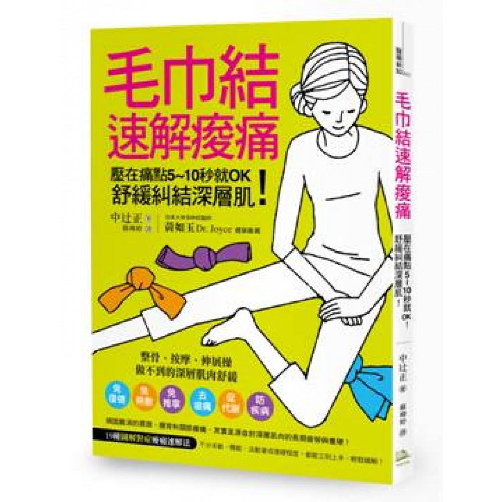 以人人可行的簡易方式,舒緩痠痛根源「深層肌」<BR>治療肌肉痠痛的保健書多以伸展操或指壓按摩為主,本書則以毛巾結進行壓迫法,藉此舒緩指壓或伸展操無法確實放鬆的深層肌肉,簡單方便而較無年齡、體能或技巧門檻。<BR>以清楚圖解搭配原理說明,從根本面養成保健觀念<BR>本書除了以清楚明確的實作圖解,具體呈現各種痠痛的治療部位與手法,並針對肌肉運作原理、痠痛成因和老化過程進行基礎的知識解說,讓讀者更能從根本著手,建立正確的觀念和良好的習慣,徹底解決疼痛僵硬問題,走向長久健康之路。<BR>