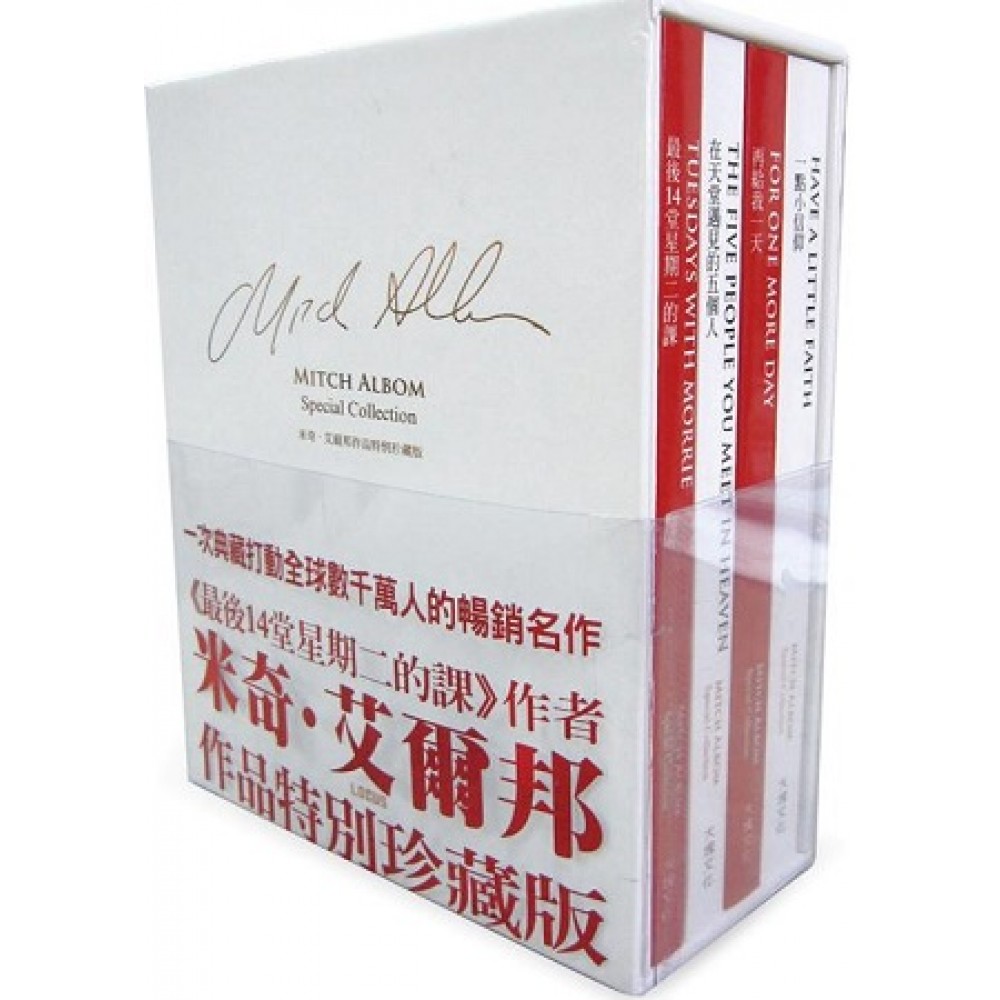 《最後十四堂星期二的課-米奇‧艾爾邦典藏》Tuesdays with Morrie ◎ 本套書含四本作品:《最後14堂星期二的課》、《在天堂遇見的五個人》、《再給我一天》和《一點小信仰》。硬盒精裝,一次完整收藏。 ◎ 《最後14堂星期二的課》是米奇‧艾爾邦的第一本回憶錄著作,銷售全球六百萬冊,應是至今全球出版史上最暢銷的回憶錄。此書敘述他與大學教授重逢,有幸再從老師身上得到教誨,並對於「活著」這件事得到新的啟發。繁體中文版在台灣銷售已超過七十萬冊。 ◎ 《在天堂遇見的五個人》則是他的第一本小說,描寫一個在遊樂園裡工作的老工人艾迪為了救一個小女孩喪了命。艾迪上了天堂之後,遇見五個曾經出現在他生命裡的人。這五人逐一說出自己的故事,說出他們是何時在人間與艾迪相遇,以及艾迪要在他們身上學習的功課,這才領悟到:自己的生命裡一直都有別人的生命;而別人的故事與自己的故事,會在最無法預料的時空產生交集。 ◎ 《再給我一天》的故事從一個假設問題出發:「假如再給你一天,你想陪著誰度過?」本書主角查理,在一個靈異般的情境裡與死去的母親重逢,回到老家所在的小鎮,陪母親渡過了一天。母親終於說出了她生前沒有說出口的祕密。聞言,查理震驚,卻也茫然——他背負了半輩子的傷口,原因就是這樣嗎?在今生與來生之間的某一個地方,查理得知了母親為家庭所做的犧牲。查理努力記住母親在他們重逢那天給他的溫柔,把他以為已經破碎的生命重新拼湊起來。他重新活了一次。 ◎ 《一點小信仰》是米奇‧艾爾邦2009年的新作。本書以兩個真實人物為主角,講述了人生裡的軟弱和堅強、改變與堅持、懷疑與相信。一個猶太老牧師一輩子堅持做著一件他認定為「美麗」的事,勇於面對別人的譏笑懷疑和自己的傷痛失落。另一位則本來是渾噩度日的毒犯,在生死關卡之前發現自己的軟弱,決定開始相信一個比他更大的力量,找到了重生的起點。當我們軟弱、痛苦、不知如何是好的時候,願我們放下自己,仰望上天,學著如何懷抱「希望」。 ◎我們看見米奇‧艾爾邦的關懷重點:他先是關注「如何平靜死去」,從中得到啟發,進而思索「如何深刻活著」,並提出積極的角度。他所選擇的真實人物都不是社會裡的耀眼成功典範;他筆下的虛構主角,以某種標準來說甚且是「人生的失敗者」。於是我們不難理解米奇‧艾爾邦說過的話:「我們所學到的最重大的功課,通常來自凡夫俗子、日常小事。」當我們流淚的時刻,那裡面也就含有同樣會觸動別人的事物;刻在平凡事物上面的痕跡,是最真實的生命印記——米奇‧艾爾邦的書,帶給我們這樣的領悟。