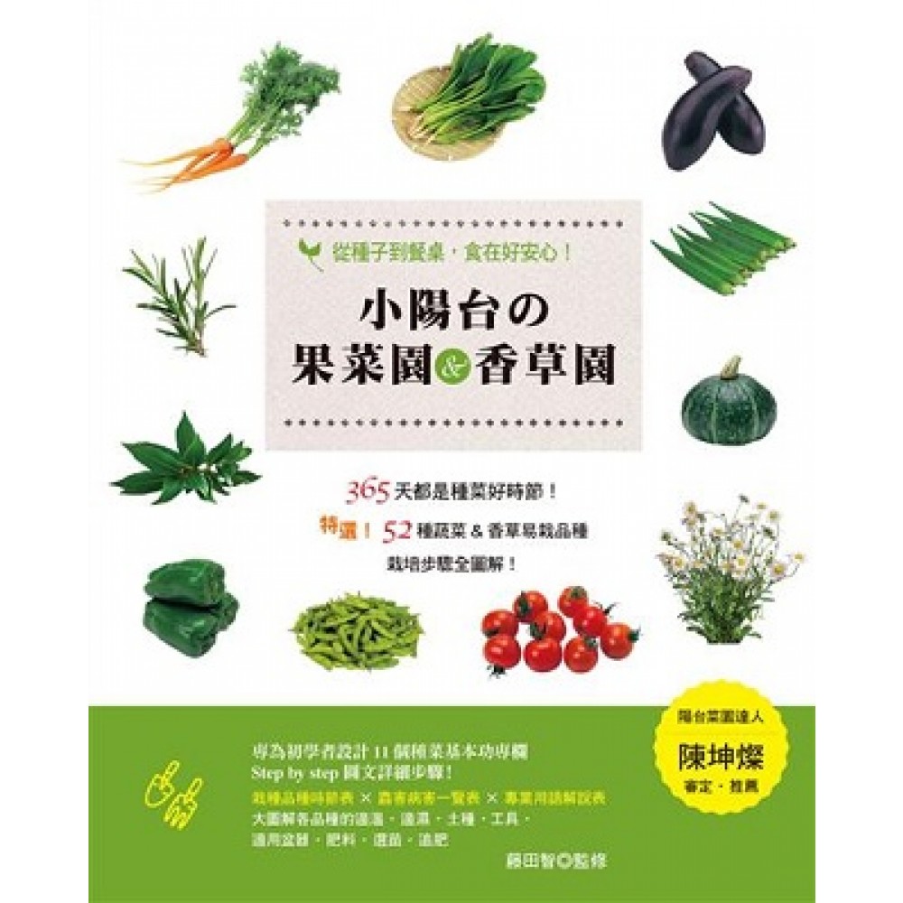 ◆特選!52種蔬菜&香草易栽品種 ◆栽培步驟全圖解! ◆專為初學者設計11大種菜基本功專欄 ◆3大圖表一目瞭然 …栽種品種時節表 …病害蟲害一覽表 …專業用語解說表 陽台菜園達人──陳坤燦 審定˙推薦 365天都是種菜好時節! 親手撫育安全的蔬果&香草, 日本種菜達人─藤田智◎監修,特選居家盆植入門品種, 大圖解各品種的適溫˙適濕˙土種˙工具˙適用盆器˙肥料˙選苗˙病蟲害 更貼心為種菜初學者設置新手Q&A 小盆器、杯子就能種! 隨意挑選喜愛的盆器,或使用手邊現成品, 即可對照植根高度表,挑選合適的蔬果&香草! 還有小杯子也能種的桌上型小巧盆植, 放在餐桌上、工作檯都非常合適, 讓小綠苗的搖曳姿態,療育您忙碌的生活吧!