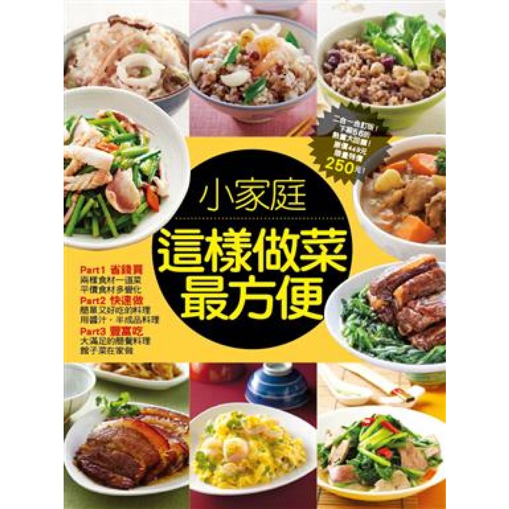 本書特色 暢銷食譜二合一合訂版!原定價449元,限量特價250元!下殺56折大回饋! 本書是以下兩本書之合訂版,內容資料恐有重覆,購買前請詳閱內容。 250道小家庭最想學的家常菜 對於家裡人少想做菜的家庭主婦來說,要準備各式的烹調食材是最頭疼不過的事情,準備多了又浪費,少了又怕不豐富。本書特別針對省錢、快速、豐盛三種訴求,為小家庭解決煩惱的料理問題。不論炒煮燉滷,只要簡單、平價的食材就能色香味俱全;想要省時快速,可以利用事先調好的醬料或滷汁,甚至市售的熟食半成品、罐頭也是好幫手。想要偶爾吃得豐盛澎派些,也有省功夫的方法,讓你在家就能簡單完成好吃的簡餐、套餐和餐廳菜。 用電鍋做菜飯最方便 忙碌了一整天,不想又辛苦準備一桌菜時,菜飯就是想簡單吃的最好選擇。不論是小家庭、主婦或上班族,用電鍋都可以輕輕鬆鬆做出一道美味的菜飯。 所以不妨試試只要短時間就可以輕鬆上桌的菜拌飯吧!以簡單的材料和調味做變化,不需要在廚房耗太久,甚至連步驟這種東西都不需要理解,少少的成本、一點點的時間,就可以輕鬆換得營養豐富的一餐,本書介紹各種不相同的菜拌飯,還有時下最受歡迎的懶人炊飯、番茄飯等,用電鍋就能輕鬆完成,一鍵按下等吃飯。無論葷素、使用白米或是更有助健康的五穀雜糧,變化多樣、天天不重複!