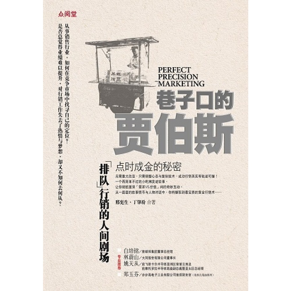 1个故事串联出1条消费黄金曲线 「排队」营销学的人间剧场 -排队人潮代表的某种心理饥饿感受 若说「时间就是金钱」,那么如何主动投入, 用心探索并了解客户愿意花时间等待的真正需求及动机, 对企业的成功销售与提供的周到服务就格外显得重要, 在故事中,心灰意冷、受到挫折的营销人员艾文因为销售同事詹姆士的强力推荐,而决定跷班去排队购买位于巷子口的炭烤红豆饼。虽然他认为红豆饼的味道尝起来并不特别,不过艾文对于那些一起排队的客人却印象深刻。在等待中,艾文察觉到这些跟自己有着同样目的的人,对于长时间的等待似乎毫不在意;感觉上,花时间买红豆饼好像是他们生活中一项必要的任务。但是区区一个红豆饼有什么了不起的,会吸引顾客乐此不疲? 在百思不得其解的情形下,艾文想办法和摆摊的红豆饼老人有了面对面地接触。在后续的几次请益及思考过程中,艾文和同事詹姆士逐渐地领悟到,影响客户购买欲望的关键不但不是混沌不明,而且是可以被预测的。藉由相互的脑力激荡,他们不但延伸了传统的「价格 vs. 需求」曲线至全方位的价值关连系统,而且更将老人累积多年的销售心法整理成一个简单的「红豆饼时间价值方程式」;一个让老人的小摊子长年有着大批人潮排队的秘密武器。 透过实际的操作,艾文他们发现,这些概念不但可以用在B-to-B或B-to-C产品或服务的诉求、定位、与销售上,对于许多想创业的人在选择定位与适当的推广手法时,也有着关键的效果。事实上,藉由熟悉概念中的原则,人们可以轻易地判断出,所提供的产品或服务是否有可能造成排队的人潮。而这些想法与原则,其实早就是许多成功企业人士的不传之密…。 从事销售行业,如何在竞争市场中找寻自己的定位……? 其实不需要重大改变,只需注意几个心态的转移与技术的复制。 你将发现,成功营销其实有轨迹可循! 你是否总觉得业绩难以提升,对营销工作失去了热情与梦想,却又不知何去何从? 一个再简单不过的小吃摊发迹故事,让你彻底厘清「需求vs.价值」间的奇妙互动。从一篇篇的故事情节与人物对话中,你将撷取到最宝贵的黄金营销术……