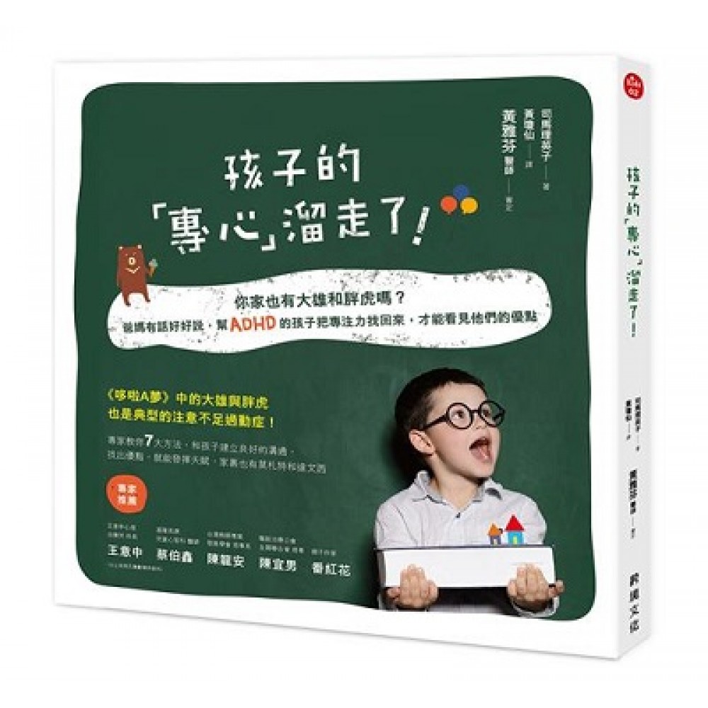 Step1別忽略了ADHD的症狀! 你的孩子也有ADHD的症狀嗎? 小學2年級小廣的情況──反覆糾正提醒,卻沒有明顯的效果。 小學3年級小純的情況──上課時坐立難安,走來走去。常常弄丟東西。 小學5年級小由美的情況──不擅長收拾房間、寫作業時很難集中注意力。 國中2年級小慶的情況──只要媽媽不在身旁,就容易拖延,無法準時繳交作業。 高中一年級小和的情況──熱衷打籃球,而忽略學校的課業。要晉升二年級有困難,卻沒有半點危機意識。 成人鈴木先生的情況──書桌上堆積成山的書籍。總是在找東西,導致工作進度落後。 Step2理解ADHD,正確的對待他們吧! ADHD的症狀、引起的原因和教戰守則 瞭解ADHD會有哪些症狀,一起理解小朋友的行為──ADHD主要的症狀有三種 這份資料可以用來判別孩子有沒有ADHD的症狀──ADHD的診斷標準 為什麼會有過動型、衝動型、注意力不足等症狀呢?──ADHD是什麼原因造成的呢? 26 撫養ADHD孩子困難重重的原因是?──為什麼照顧ADHD孩子很不容易? 其他容易與ADHD混淆的發展障礙 為什麼ADHD需要治療呢? 父母可以為小孩子做哪些事? Step3父母態度改變了,孩子也會跟著改變 學習用對的方式與孩子溝通 只要做到這四件事,孩子的狀況就會逐漸改善!──與孩子互動的四大原則 讓孩子順利度過每一天──幫助孩子穩定生活管理的九大戰術 大雄類型 胖虎類型──每個孩子都是獨一無二,教導方式也不一樣 不同成長時期,採用不同的因應方式,可以增強孩子的能力──按照孩子的年齡,提供孩子的需要吧! 若身邊的人一起協助,治療效果會更加明顯─家人一同協助吧! Step4預防勝於治療—為避免在校被霸凌無法學習,有幾件事一定要注意 學校老師可以為學生做的事 ADHD的孩子不是不想「認真努力」或是「做事不積極」──對於好動的孩子應有的認知 若老師可以根據孩子的發展狀況教導,孩子在學校的學習一定會有所改變──為了與同學維持友好關係及互動,訂定教戰守則吧! 寫給國中、和高中老師們的話 Step5搭配藥物治療,就能得到更佳療效 善於運用藥物療法,可以幫助孩子增強學習能力 學習更多關於藥物治療的知識──可以斟酌配合服用藥物,很多小朋友的狀況越變越好 Step6自我控制力變強的五位過動兒 治療實際案例集 小學3年級小綾的情況──常常心不在焉,成為霸凌的對象。服用派醋甲酯後,專注力提升了。 小學4年級小勝的情況──停止體罰和嚴厲責罵之後,情緒穩定、成績也變好了。 小學5年級啟太的情況──學校和父母聯手合作,孩子的反抗態度和暴力傾向逐漸減輕。 高中一年級永治的情況──常遲到、不繳交作業,因而導致留級。接受心理諮詢和藥物療法後,狀況逐漸改善。 大學4年級和樹的情況──接受自己的狀況,在醫生和就業諮詢的指導之下,獲得第一份正職工作。 成年人如何治療ADHD症? Step7與ADHD的小孩,好好相處吧! 寫給全國各地的大雄們和胖虎們 充分理解ADHD,學會跟他們相處吧!──只要瞭解,就會發現他們與一般人一樣 如果你下定決心,慢慢一定學得會!──千萬別放棄!照著作戰方針按部就班,會過得更快樂! 只要這麼做,每天都會一帆風順──人生是自己創造,找到一個屬於你的快樂人生 結語
