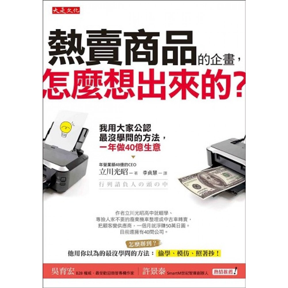 推薦序一 創新不在「商品」本身,而是在「流程」 B2B權威、最受歡迎商管專欄作家/吳育宏 在這個講究創新的時代,人人都為了找到市場上可行的新點子,而絞盡腦汁。特別是在舊產品紛紛邁入成熟期之際,舊的商業模式也因為競爭者加入,而變得擁擠,多數企業都亟需注入新元素,以求從困境中走出來。 然而,在求新求變的今日,舊的經驗是否就毫無價值?其實不然。如果我們仔細觀察,無數成功的產品企畫和行銷案例,都是因為策略性的模仿、複製過往的成功經驗,並加以改良後,得到令人驚豔的成果。西班牙的快時尚服飾品牌ZARA,就是一個典型的例子。 ZARA代表的是一種品味、一種態度,顯然它是一個很「酷」的品牌。但是很多年輕人大概不知道,ZARA的設計師有另一個不怎麼酷的稱呼,叫「抄版員」。他們的主要工作就是,在世界各大服裝伸展臺旁,把最新的款式和趨勢抄下來,再透過ZARA「速度至上」的商品開發、生產、配銷流程送到顧客眼前。換句話說,它的創新與成功其實不在「商品」本身,而是在「流程」。 如果我們把視野再拉大,把創新又成功的流程做大、做廣之後,就形成一個「平臺」(platform)。眾所周知的,Amazon、Uber、Facebook、YouTube都是沒有實體商品的企業,但是他們搭建的平臺,讓消費者購物、搭車、交友、分享,進而帶來巨大的商機,這正是「平臺經濟」(platform economy)。 簡言之,要讓商品熱賣,行銷人員與其研究那些商品的規格、材料、配方,還不如了解熱賣商品背後的商業模式和思考邏輯。《熱賣商品的企畫,怎麼想出來的?》就將非常實用的案例集結成冊。 本書作者立川光昭高中時,就選擇輟學,沒有受過正規的商業教育,因此思路不被傳統的框架所限制。但是他有敏銳的商業嗅覺和聯想力,從觀察「中古電玩店」的經營,竟然也可以讓他找到「二手機車」大賣的方法。如今他已是一位擁有數十間公司,年營收超過四十億日圓的企業家。 本書沒有傳統教科書的長篇大論或艱深名詞,而是以淺顯易懂的敘述方式,分享作者如何看待商品熱賣的原因,其中甚至還包括作者為人處事的方法與價值觀。能以這麽務實的角度,近距離的觀察一位成功企業家的想法,是非常難得的機會,我誠摯的推薦本書給讀者。 推薦序二 偷學,其實是一種贏家的本領? SmartM世紀智庫創辦人/許景泰 1999年秋天,中國的互聯網才剛起步,35歲的馬雲等18個人湊了50萬元,創立了阿里巴巴!2003年,看到美國eBay在網路上做起了拍賣生意,於是「偷學」,創立了淘寶;看到美國第三方支付PayPal大獲成功,又「模仿」做了「支付寶」。馬雲的偷學或跟風,在2014年,當阿里巴巴掛牌上市、獲得巨大的成功,而馬雲成了中國首富後,再也沒人會提到,中國諸多互聯網模式都是「抄襲美國」而來的! 現在的中國互聯網公司,早已擺脫抄襲、山寨或模仿美國的商業模式,走出一條屬於自己的創新互聯網商業模式。微信(WeChat)的社群功能,已經深入到中國7億民眾的生活中,包括食衣住行育樂等全方面。而全球有17億人在使用的臉書(Facebook),也沒辦法做到像微信一樣,滲透到我們生活的各個面向。 由此可知,現在要做出「原創商品」或「創新商業模式」,已經非常困難。重點也不是你到底「發明」了什麼?而是能否快速的「發現」或「洞察」消費者的新需求,並能從快速偷學別人的優點和模仿經驗中,快速的打造出屬於自己的明星商品。 是的!《熱賣商品的企畫,怎麼想出來的?》這本書的作者也回應了,這個「快」時代的巨變浪潮。 作者立川光昭在高中時就輟學,專撿人家不要的廢棄機車,整理成中古車轉賣,但靠著快速「偷學、跟風、複製」的訣竅,已經擁有40間公司,創造出40億日圓的年營收。若你仔細想想,他為什麼能這麼成功?這似乎跟他的學歷完全無關,或是否有獨特的經驗也都無關,那他到底是怎麼做到的? 我們原本以為偷學、跟風、抄襲別人的商業手法很可恥,但事實上,最快的學習往往是從模仿開始。而最跟得上時代的風口,不是自己非要從創新出發,反而是從別人成功的商品中,抄出新意,再從中找到屬於自己的個性!更直白的說,在現今凡事追求「快速」、「時時刻刻在變」的巨變市場,若是你的商品要能熱賣,問題還真不在原創性與否,畢竟原創性要投入的資本和研發時間非常可觀,你只要像作者在書中指出的,部分抄襲或跨界模仿,再加上自己的個性,即可在市場上脫穎而出! 這本書的諸多觀點,都是在實戰中的街頭本領中淬鍊出來的。我看完這本書的體會,不在於「抄襲可不可恥」,而是在於若能因抄襲融合自身獨特的風格,從中創造出市場上的唯一或第一的熱賣商品,那麼才是商業戰場中的適者生存之道。特別是現在產製成本如此低廉,資訊取得成本如此便宜、快速,當一個新產品上市時,滿街可能都已經有類似的產品之際,你如何在市場中脫穎而出?偷學、複製、再巧妙的融合自有獨特的DNA,我想才是多數商業真正能勝出的王道! 前言 我一直有賺錢的靈感,方法很簡單 托大家的福,目前我一共經營40間公司,集團總營業額達40億日圓(約新臺幣12億元)。這完全是因為,我不斷的模仿他人的熱銷產品,而不是因為我有什麼過人之處。 「我靠偷學與複製,讓事業成長茁壯」,聽到這句話,有人可能會忍不住皺起眉頭。 這是因為社會上總認為「抄襲別人」是件壞事,就算不是什麼壞事,也不值得讚許。看看日本前陣子吵得不