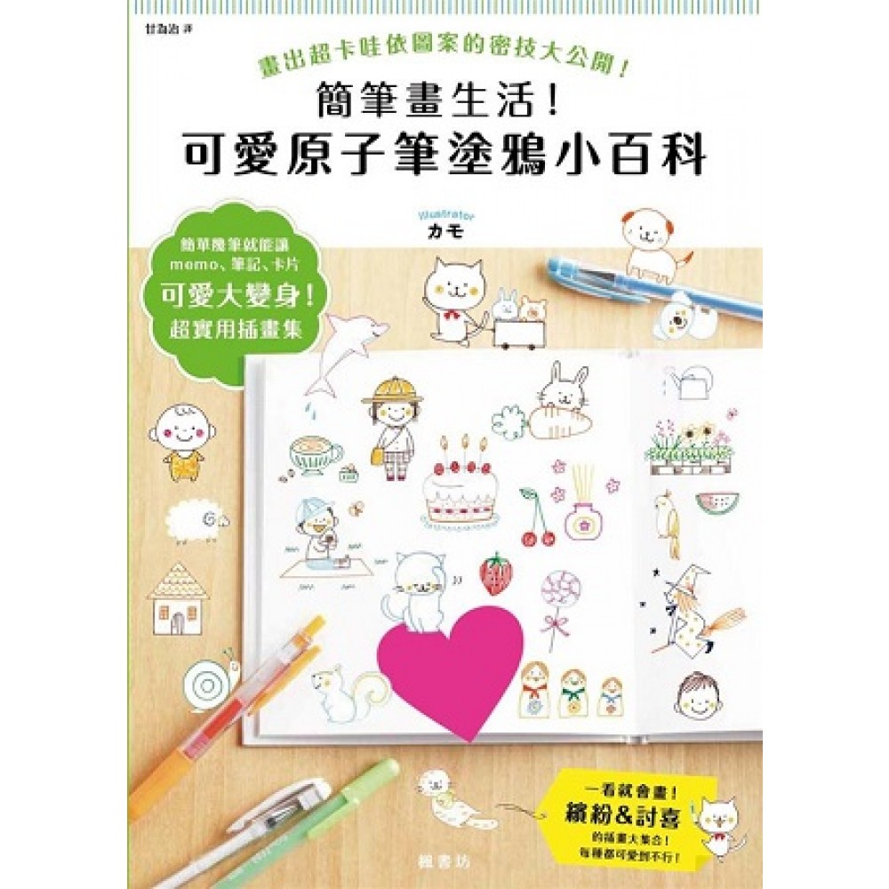 .前言 .原子筆的大小事 .如何提升畫畫技巧 PART1 一起跟著畫! .輕鬆畫出小巧可愛的圖案 .用你的畫裝飾信封或信紙、便條紙 .豐富食譜、書籤 .點綴塑膠製品、布製品 .製作女兒節娃娃、各種吊飾 .製作萬聖節串旗 .製作聖誕樹、聖誕花圈、鏡餅 .學習基本畫法、著色法 .人物 .基礎人臉 .女生的髮型、男生的髮型 .不同性別、年齡的畫法 .動作 .動物 下筆步驟、各式各樣的動物、各種野生動物 .植物 花、樹、葉子、種子、樹枝 .食物 蔬菜等、水果、海鮮、點心、麵包、飲料、料理 .穿著 女生的穿著、男生的穿著 .雜貨 雜貨、玩具、手工藝用品 .居家相關物品 庭院、外觀、室內裝飾 .交通工具、城鎮街景 飛在天上的、火車、船、各式車輛、建築物、遊樂園、公園 .學校 學習用品、各種校內物品、各科用品、教室內的物品 .四季景緻 .春 畢業、開學、春天的各種活動、傳統節日、賞花、野餐、春天的大自然 .夏 梅雨、七夕、夏天的大自然、夏日風情、海邊、煙火、夏日祭典 .秋 秋天的大自然、觀星、運動會、秋天的昆蟲、秋日祭典、七五三、萬聖節 .冬 冬日風情、雪、聖誕節、新年、節分、情人節 .星座、生肖 星座、幸運物、生肖 PART2 便利又實用的可愛角色&圖示 .用你的畫製作貼紙、便條 .打造行事曆、地圖 .各種角色 .以○與│畫出不同動作 .用貓咪表現各種情境 .用狗狗表現各種情境 .用兔子、熊表現各種情境 .圖示 .天氣 .休閒、運動 .學校、工作 .活動、日常預定 PART3 用裝飾文字 .打造明信片及卡片 .用你的畫製作名片、道謝或祝賀 .製作邀請卡 .問候親友、製作聖誕卡 .製作賀年卡 .裝飾文字 .平假名 .片假名 .英文字母 .裝飾分隔線、外框 專欄 .跟著畫畫歌一起來畫吧! .挑戰肖像畫! .插畫隨筆① 江戶小紋染體驗記 .插畫隨筆② カモ的工作日記 .插畫隨筆③ カモ的插畫物語