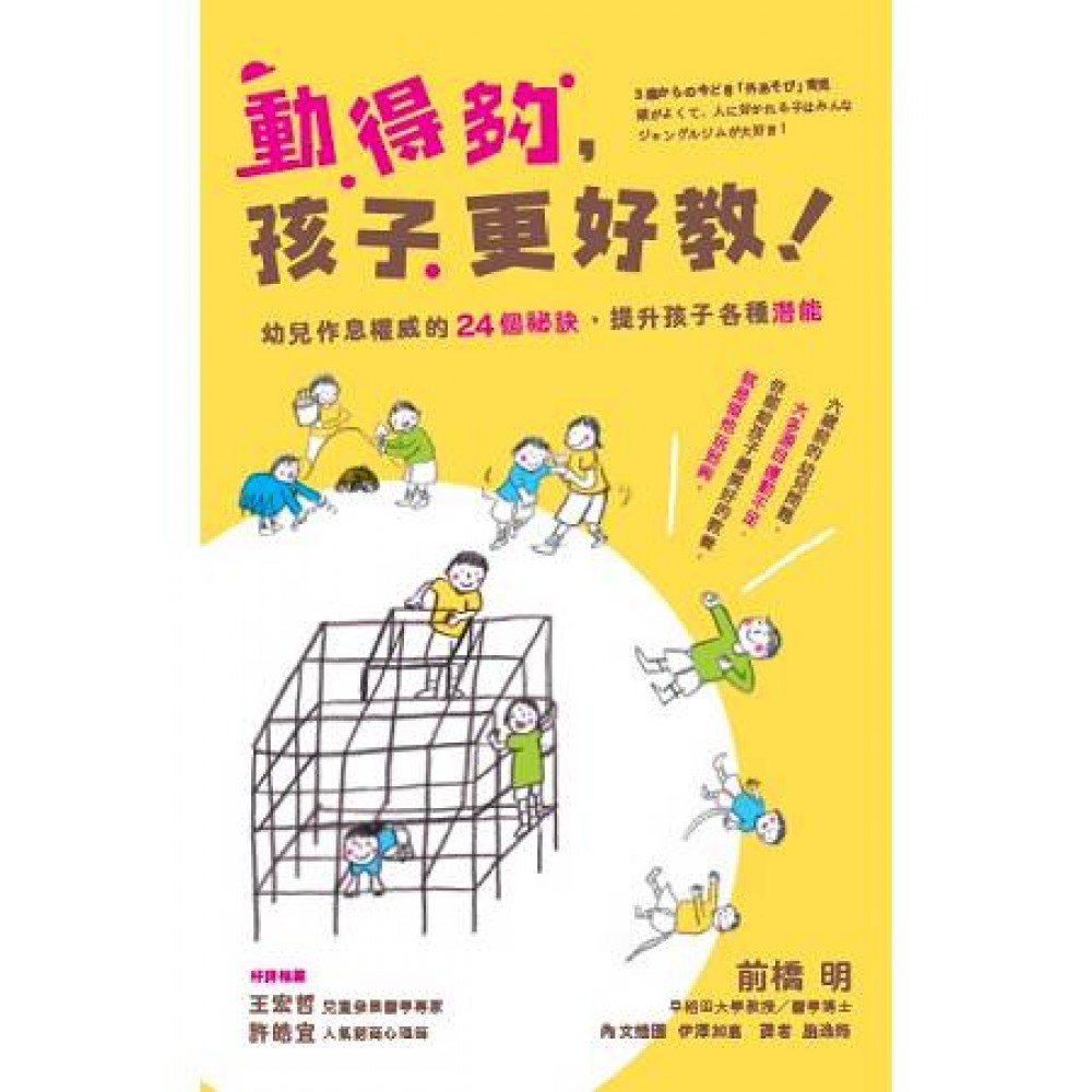六歲前的幼兒問題,大多源自運動不足, 你能給孩子最美好的教養,就是帶領他動個夠、玩到夠! 你家有運動不足、夜型化的孩子嗎? 體溫常低於36度、排便不順、吃早餐三催四請慢吞吞? 膝蓋無法抬高、腳常拖著走、不愛與其他孩子互動? 躁動不安,容易生氣,心中少有感動? 如果你的孩子有以上症狀,請當心了,那就是運動不足! 根據日本早稲田醫學博士、前橋明教授的研究,1985年的五歲孩子,每日平均步行量有12000步,現在的孩子卻只剩下5000步不到。過度便利的世界,已造成孩子四體不勤、作息紊亂與學習力低下。 運動不足的孩子,直接及間接造成許多成長困擾。如果任其問題化,將造成孩子自律神經功能低下,引起荷爾蒙分泌異常。等到進小學、升上國中,更無法專注唸書,甚至拒絕去上學,變成繭居族。 我們都知道孩子該動,但要怎麼動才夠、怎麼動才對呢? ◎本書特色 →六大層面全面診斷:完整測驗,排出孩子的發展雷達圖,看看哪裡出問題? →每日活動排程建議:按照孩子的生理時鐘,設計最適合孩子的活動表。 →公園遊具大大妙用:利用免費的遊具,一次學會四種學前重要動能技巧。 →不出門也能好好動:在家就能輕鬆做到的運動與遊戲,原來這麼簡單。 →台灣讀者限定內容:因應台灣環境的十個加值QA,更深入了解前橋明博士理念。 ◎本書重點 →別錯過最適期!6歲前,兒童有90%的神經會發展如成人 體驗過多少遊戲,對於他這輩子的運動機能好壞,具有決定性的影響 →孩子玩得愈多,情緒愈穩定 成長中,孩子其實累積了各種不滿、不安和憤怒,而紓解這些情緒最安全的方式,就是找個能讓孩子沉醉其中的遊戲或運動。 →虛構的緊急,可刺激孩子腦部,提升自律神經機能 像「鬼抓人」這樣緊張的遊戲,孩子的亢奮會給予大腦刺激,同時也會出現壓抑的部分,得以磨練孩子的情緒控制能力。 →誤會!簡單的運動技巧,不用特別學,小孩自然而然就會了? 過去有鄰居兄姊,可模仿各種技巧。但身處現今環境,已很難遇到玩伴。 →我們都知道孩子要動,但是要動多少、怎麼動才夠? 幼兒體能權威前橋明教授這樣說:「從孩子身上感受不到生命力,是件很可怕的事。」請跟著本書的腳步,按部就班來,「動身體的同時,也是在動腦!」 →早上、中午、晚上,何時動對孩子最好? 遊戲和活動也有黃金時段,這段時間內,身體最能吸收活動量,千萬別錯過。 →完全免費!公園遊具的大發現! 孩子光有體力還不夠,要教會他動身體的技巧;只要好好運用公園常見的攀爬架、單槓,一次學會多種學前必需擁有的活動技巧。 ◎本書關鍵字:前橋明、幼兒運動、幼兒飲食、幼兒成長、情緒控制、夜型化兒童 ◎幼兒學習指標:運動