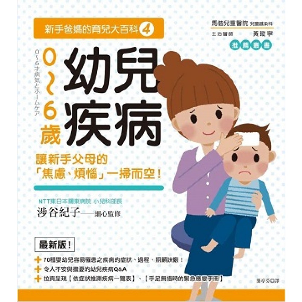 ~準媽媽、準爸爸們最需要知道~ 70種嬰幼兒容易罹患之疾病的症狀、過程、照顧訣竅! 【及早發現,有助於醫師診斷的3大原則】 ① 9個平時就需仔細觀察的狀況: 以「排便」、「噁心想吐」、「精神」、「發燒」、「口腔」、「皮膚」、「睡眠」、「食慾」、「排尿」9大狀況為判斷指標 ② 不要忽視直覺,察覺「不同於往常」的情況: 從「有無發燒」→「年齡」→「有無起疹子」→「精神狀況」→「吃飯、排尿情形」判斷需前往醫院還是在家觀察 ③ 依月齡、年齡接受定期健康檢查: 以「0~3個月」、「4個月~1歲」、「1歲以上」為分界,各時段須診察、注意的項目皆不同。 PART1【居家照顧與用藥】 ★【發燒】免驚3要訣! ◎熱度高低≠疾病的輕重 ◎發燒的熱度並不會損害腦部 ◎退燒藥可使體溫下降1℃左右,必要時再服用 ★【咳嗽、流鼻水】嚴重度判讀: ◎鼻咽炎(感冒):乾咳 嚴重度:★ ◎哮吼症候群(急性喉炎):咳嗽聲如狗吠、海豹叫聲 嚴重度:★★★ ◎支氣管炎:溼咳有痰 嚴重度:★★ ◎細支氣管炎:咳嗽合併咻咻喘息聲 嚴重度:★★★ ◎肺炎:溼咳有痰 嚴重度:★★★ ★【正確使用藥物】的8大重點: ◎固定前往同一家藥局 ◎未服用完的藥物全部丟棄 ◎無法服用藥物時確實告知醫師 ◎確認能搭配藥物一起服用的食物與飲料 ◎若有其他診所開立的藥物務必事先告知醫師 ◎確認能否與其他藥物並用 ◎確認藥物的使用方法與注意事項 ◎確認藥物名稱、功效、以及使用時間 PART2【0~6歲容易罹患的疾病】 ★嬰幼兒時期容易出現的5大問題:感冒、流行性感冒、病毒性腸胃炎、中耳炎、便秘 ★12大疾病圖鑑:水痘、麻疹、濕疹、皮膚炎、血管瘤⋯⋯用圖片判別症狀、發病嚴重程度 ★19種會傳染的疾病:【疾病徵兆】、【惡化徵兆】、【緊急狀況】、【一般病程】、【爸媽經驗談】 ★【眼睛】、【耳朵、鼻子、口腔】、【腹部、生殖器、臀部】、【骨骼、肌肉、關節】、【心臟、腎臟】、【兒童癌症】、【過敏】、【皮膚問題】各部位兒童疾病 PART3【心智與身體專題】 ★嬰兒的【生殖器官】、【身高】、【牙齒與齒列】雜症排解。 ★令人不安與擔憂的各時期Q&A PART4【疫苗接種與定期健康檢查】 ★疫苗接種的基本知識:順利接種的3大注意事項 ◎與家庭醫師討論接種時程 ◎不要錯過團體接種的機會 ◎同時接種數種疫苗 ★一目暸然的日本兒童的疫苗接種時程 ★疫苗接種的方式與疫苗一覽表 PART5【預防意外&急救手冊】 ★各年齡容易發生的意外一覽表 ★預防&急救手冊:誤吞、跌倒、燒燙傷、水中意外⋯⋯「在家觀察」、「前往醫院」、「立即前往醫院」判讀表 本書特色 ◎70種0~6歲寶寶容易罹患的疾病,從判斷技巧、病程、照護方式皆悉心告知。 ◎居家照護重點&嬰幼兒用藥指引,疫苗接種&定期健康檢查,全面維護寶寶健康! ◎從發燒、咳嗽、流鼻水照護到體格、視力、齒列檢查,用清晰的照片讓新手父母一目瞭然! ◎以月齡分別,不同時期、令人不安與擔憂的Q&A,解決新手爸媽的各種焦慮與煩惱! ◎附錄【症狀推測疾病一覽表】、【手足無措時的緊急應變手冊】,即時接收寶寶的SOS,在黃金時間做出反應處理。