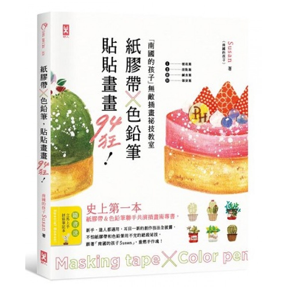PART 01 紙膠帶與色鉛筆快速入門 大家最愛的紙膠帶 ‧紙膠帶品牌 ‧紙膠帶拼貼使用工具 好療癒的色鉛筆 ‧色鉛筆繪製技巧 PART 02 拼貼日常美(新手入門班) 迷人的小樹 ‧小樹(基本型) ‧小樹(變化型) ‧小樹(進階型) 仙人掌 ‧仙人掌小盆栽 ‧圓形仙人掌 ‧不同分瓣法 ‧不同長法形 ※仙人掌設計的延伸 小小植物 ‧盆栽、葉子剪法 ‧圓葉子剪法(水滴狀) 小盆栽 ※小盆栽設計延伸 小雜貨 ‧澆水壺、茶壺 ‧吊燈 ‧鐵籃子 ※生活裡的雜貨 PART 3 調劑身心的美食創作(新手創作班) 催動食欲的鹹點 ‧鹹食配料的紙膠帶剪製技巧 漢堡Burger ‧純色鉛筆創作 ‧色鉛筆V S. 紙膠帶 ‧純紙膠帶拼貼 ‧漢堡可愛的小配件 ‧漢堡其他運用 ‧麵包體變化 披薩pizza ‧色鉛筆VS.紙膠帶 幸福滿載的美味甜點 ‧甜點創作的小技巧 ‧甜點配料的紙膠帶剪製技巧 單品蛋糕甜點的創作 ‧草莓蛋糕 ‧草莓千層蛋糕 ‧重乳酪蛋糕 ‧輕乳酪蛋糕、熱厚鬆餅 ‧鮮奶油香蕉巧克力蛋糕 ‧鬆餅 ‧鬆餅塔 ※蛋糕變化 ‧草莓塔 ‧藍莓塔 ‧鮮奶油芒果塔 ‧巧克力方磚蛋糕 ※塔類變化 ‧星空慕斯 ※慕斯變化 ※玩出很多可能 PART 04 手帳& 卡片創作密技教室(達人進階班) 手帳版面配置 ‧階梯式分區 ‧上下分區 ‧色彩延伸設計 ‧素色運用技巧 ‧文字的應用 ‧甜點裝飾巧思 ‧幾何&貼紙的運用 卡片製作小撇步 ‧選定主題 ‧適時留白 ‧顏色挑選一致性 ‧比例拿捏 ‧適度重疊加強顏色 卡片版面配置 ‧方形 ※卡片應用分享 PART 05 「南國的孩子Susan」人氣手作課 夏日紫陽花 夏日花圈 秋日橡實 冬日花圈 康乃馨蛋糕卡片 PART 06 Susan 的文具小旅行 台北:充電好地方 台南:散步好地方,愜意生活