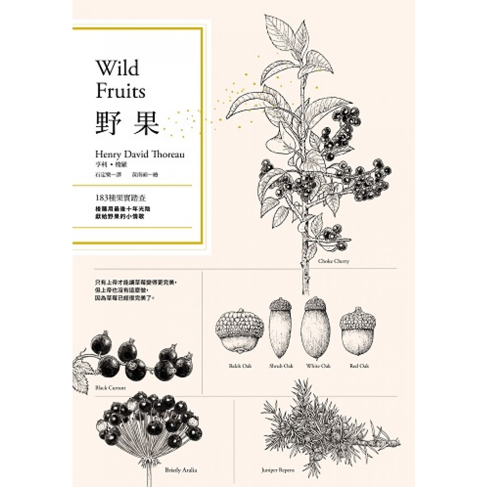 李偉文(牙醫師.作家.環保志工) 范欽慧(自然作家、紀錄片編導、野地錄音師) 黃裕星(林業試驗所所長) 黃麗錦(《野花999》、《野果遊樂園》作者) ───愛不釋手推藨 這是我們這位偉大的自然作家最後的成果,《野果》堪稱美國福音──為我們展開自然的神聖畫卷,從每一頁上,呼之欲出的張力,那是身為自然主義者的梭羅和身為自然傳教士的梭羅之間的張力。──《時代》雜誌