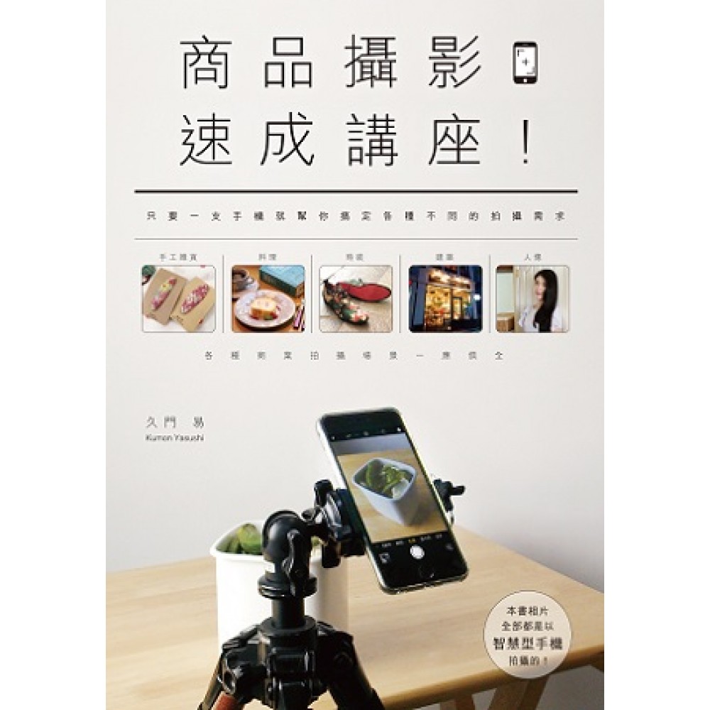 久門 易 Kumon Yasushi 1961出生。在過著上班族的生涯時因嚮往藝術攝影家的生活而前往東京。在經營照相館「寫真道場」之外,並於「Commercial Photo」與「Photo Technic」(玄光社)、「CAPA」(學研)、「日本Camera」(日本Camera社)等期刊上長期連載多篇文章。另一方面,並且在樂天大學針對網路商店舉辦攝影講座(2005年~)、LIXIL針對工務店之施工案例的攝影講座、函授課程TANONAMA的「商品攝影講座」(2014年~)等有著多數的講師經驗。在本書中,作者將多年來所培育的龐大商業攝影know-how毫不吝惜地挹注與活用在手機攝影上。 著作 『接案成功術 商品攝影講座』(玄光社,中譯本:尖端出版) 『WONDER PHOTOGRAPHY』(玄光社) 『標準數位相機攝影講座』(翔泳社) 『看得懂!賣得好!讓工作很有效率的數位相機攝影術』(翔泳社) 『從今天起數位相片會拍得很好看』(SOFTBANK新書) 『為不喜歡編修的人而寫的逆向相片編修術』(日本Camera社) 『好想將相片拍得很好看!』(技術評論社) 『技巧在這裡!商業攝影&編輯術』(秀和系統) 『相片X機車 為騎士而寫的騎士拍攝騎士之攝影術』(秀和系統)等多部著作。 相關著作:《接案成功術--商品攝影講座》